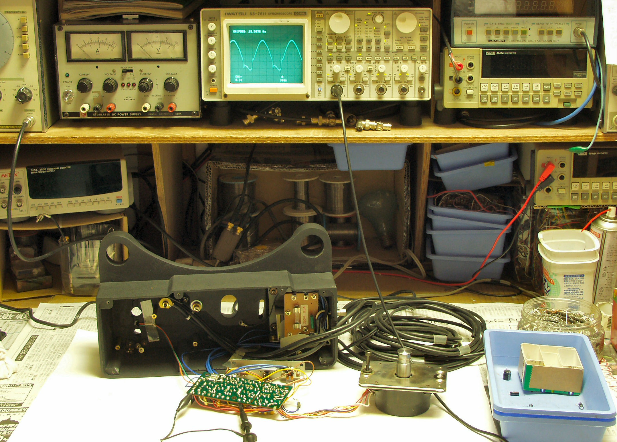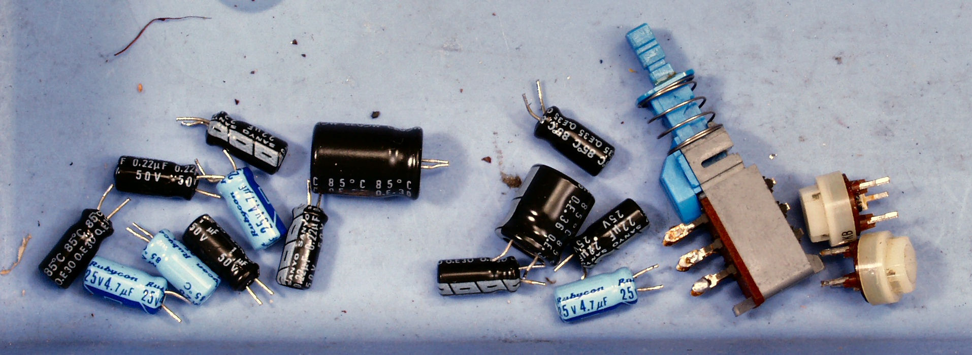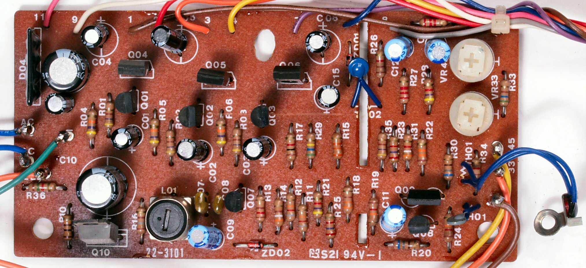 | C12 .修理後 基板 半固定VR2個、電解コンデンサー11個、フイルムコンデンサー3個交換 |