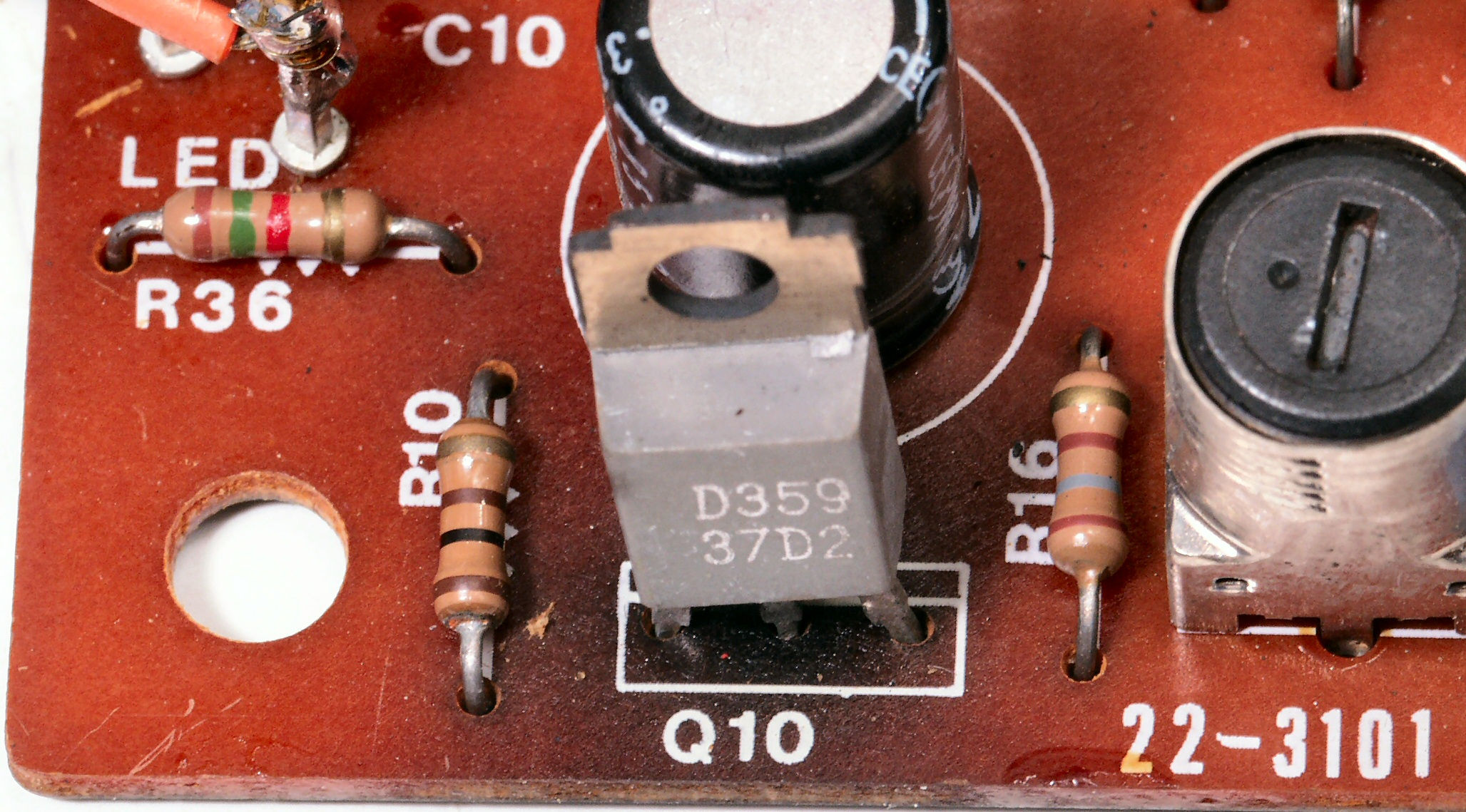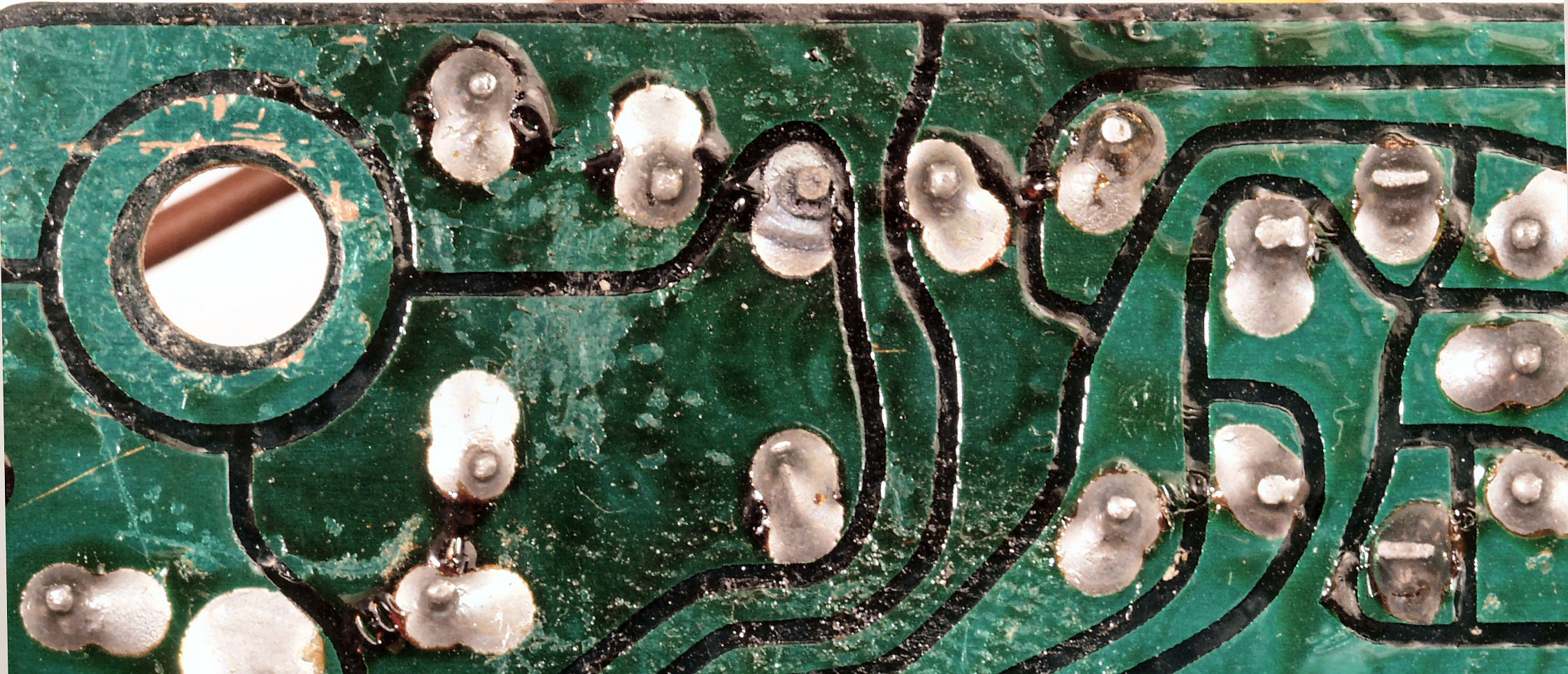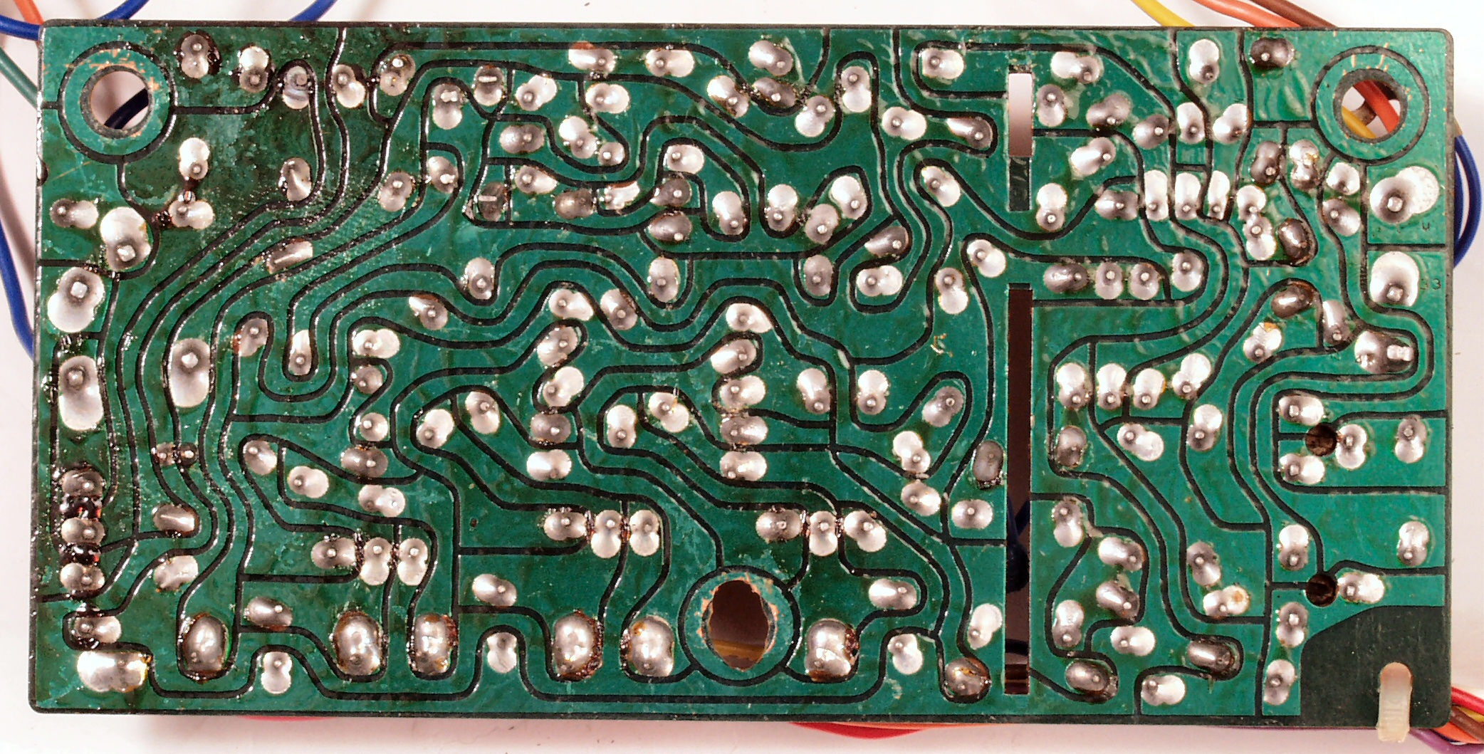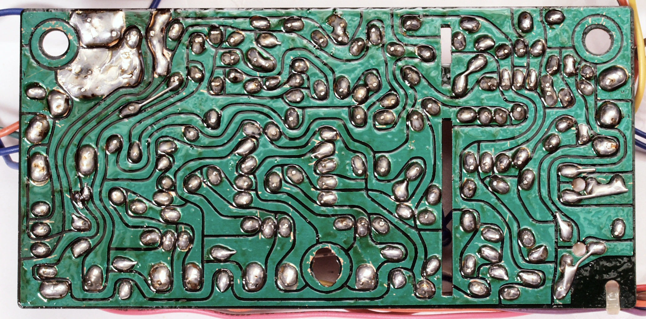 | C132. 修理前 基板裏、出力TR(トランジスター)の足の半田が熱で劣化 |