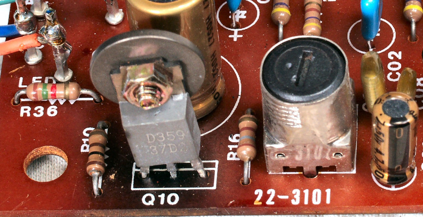 | C113. 修理中 基板、出力TR(トランジスター)に放熱器取り付け |