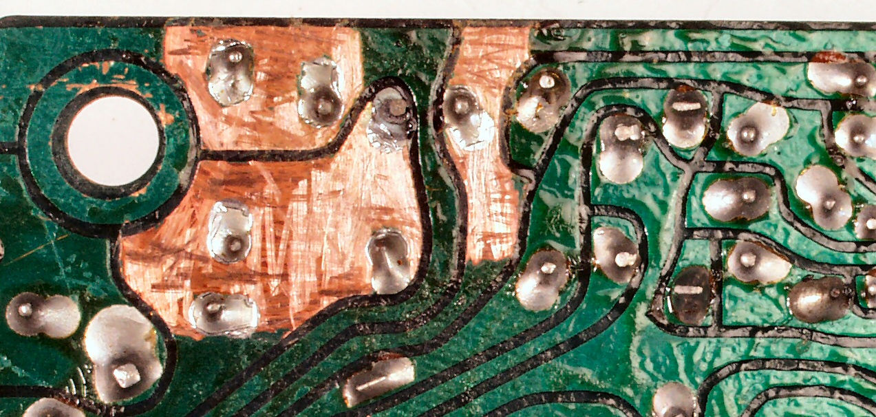 | C133. 修理中 基板裏、出力TR(トランジスター)の足の半田部分を広げ、放熱を良くする |
