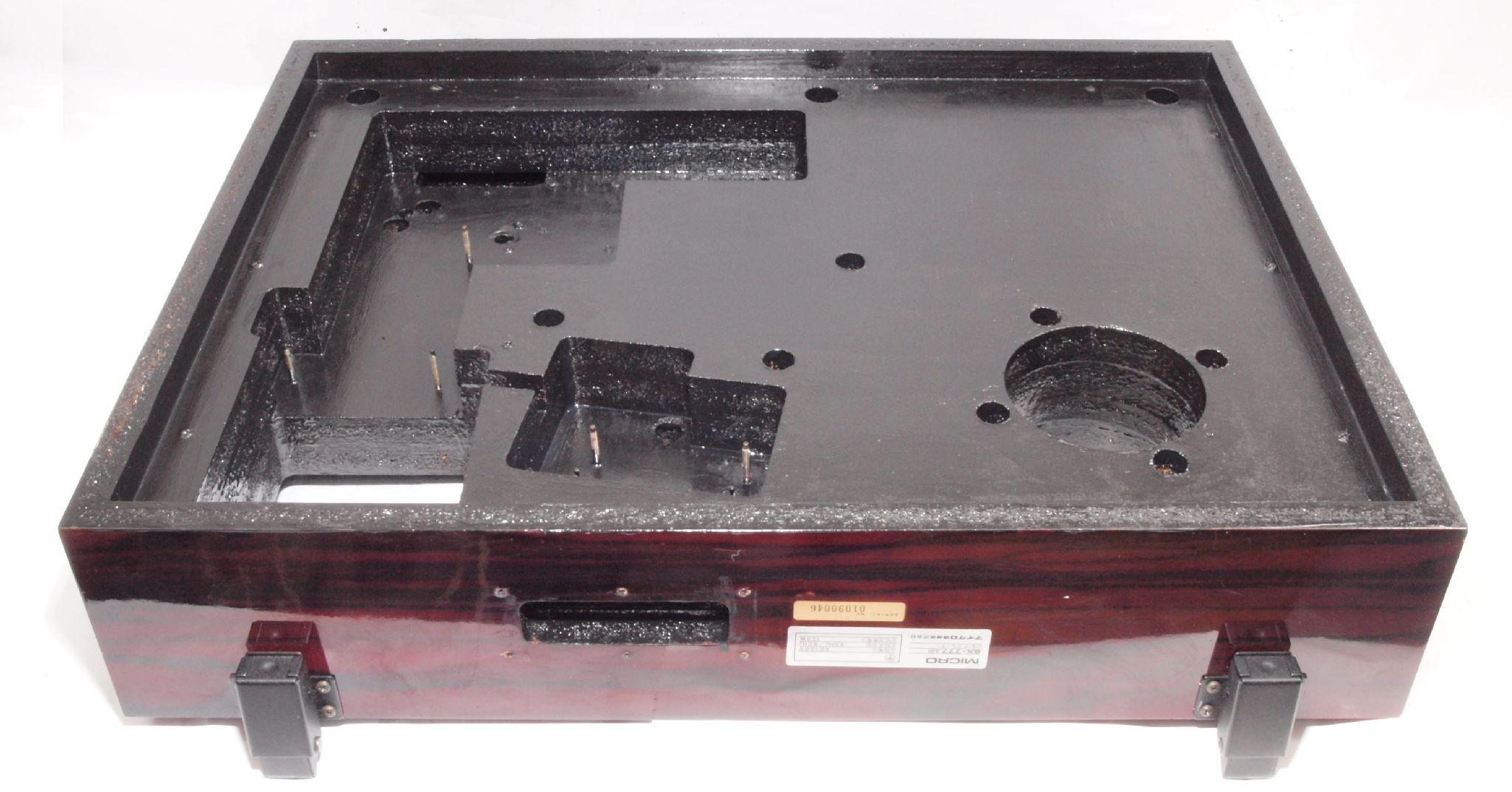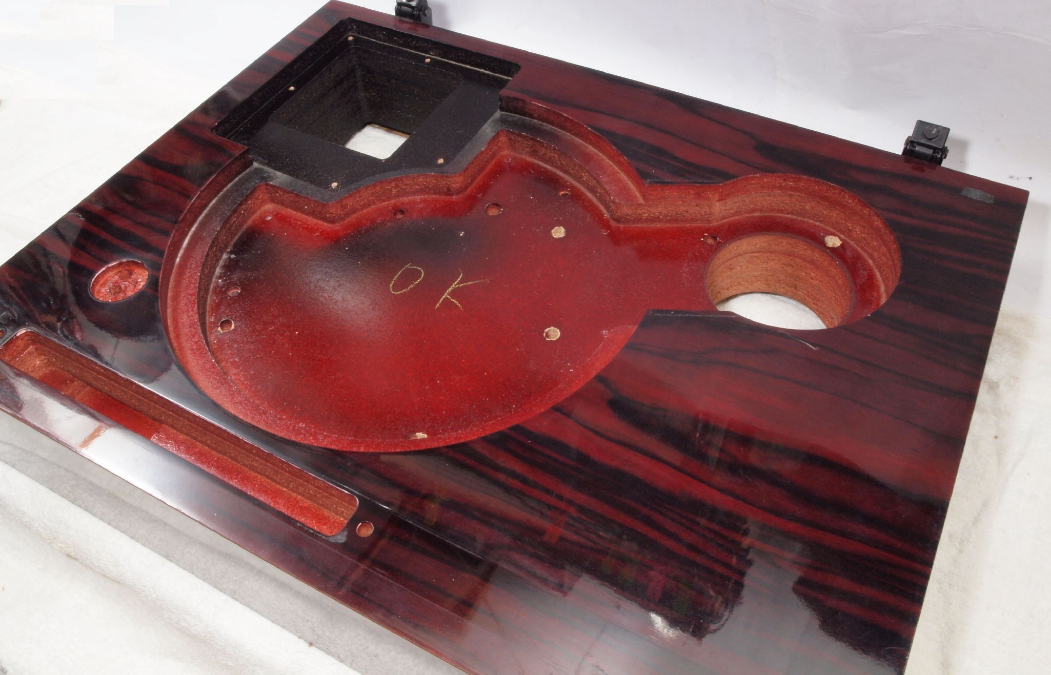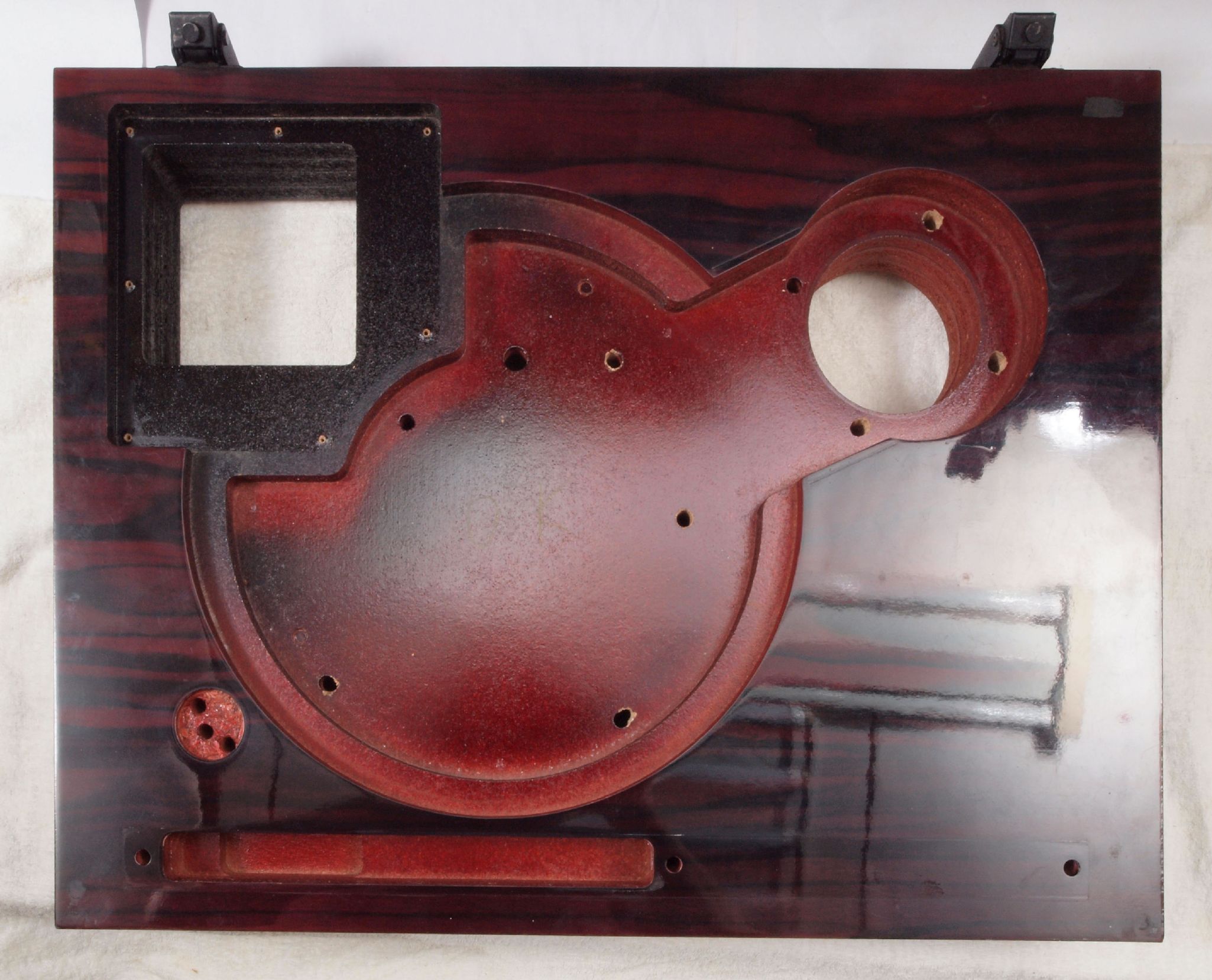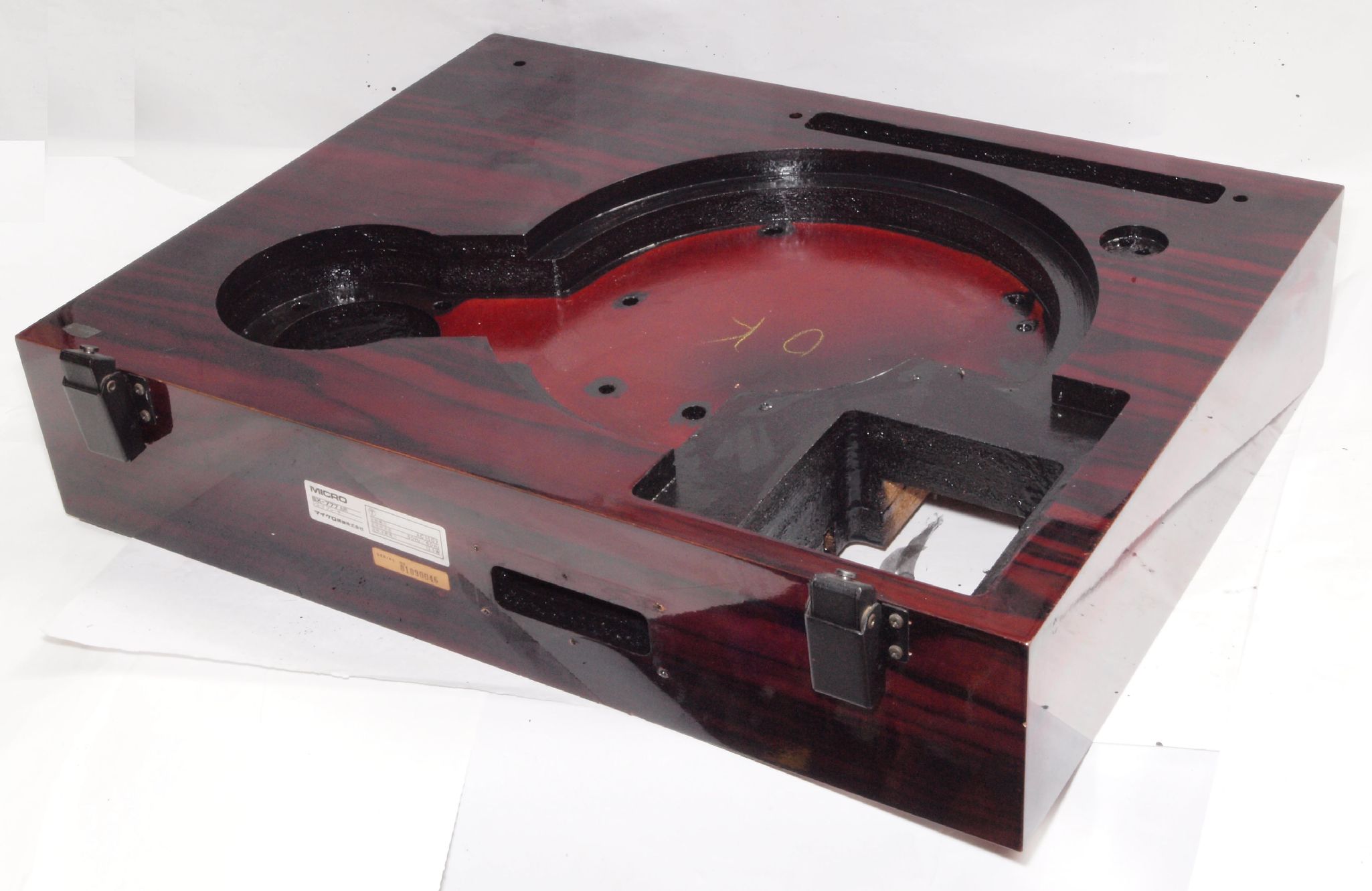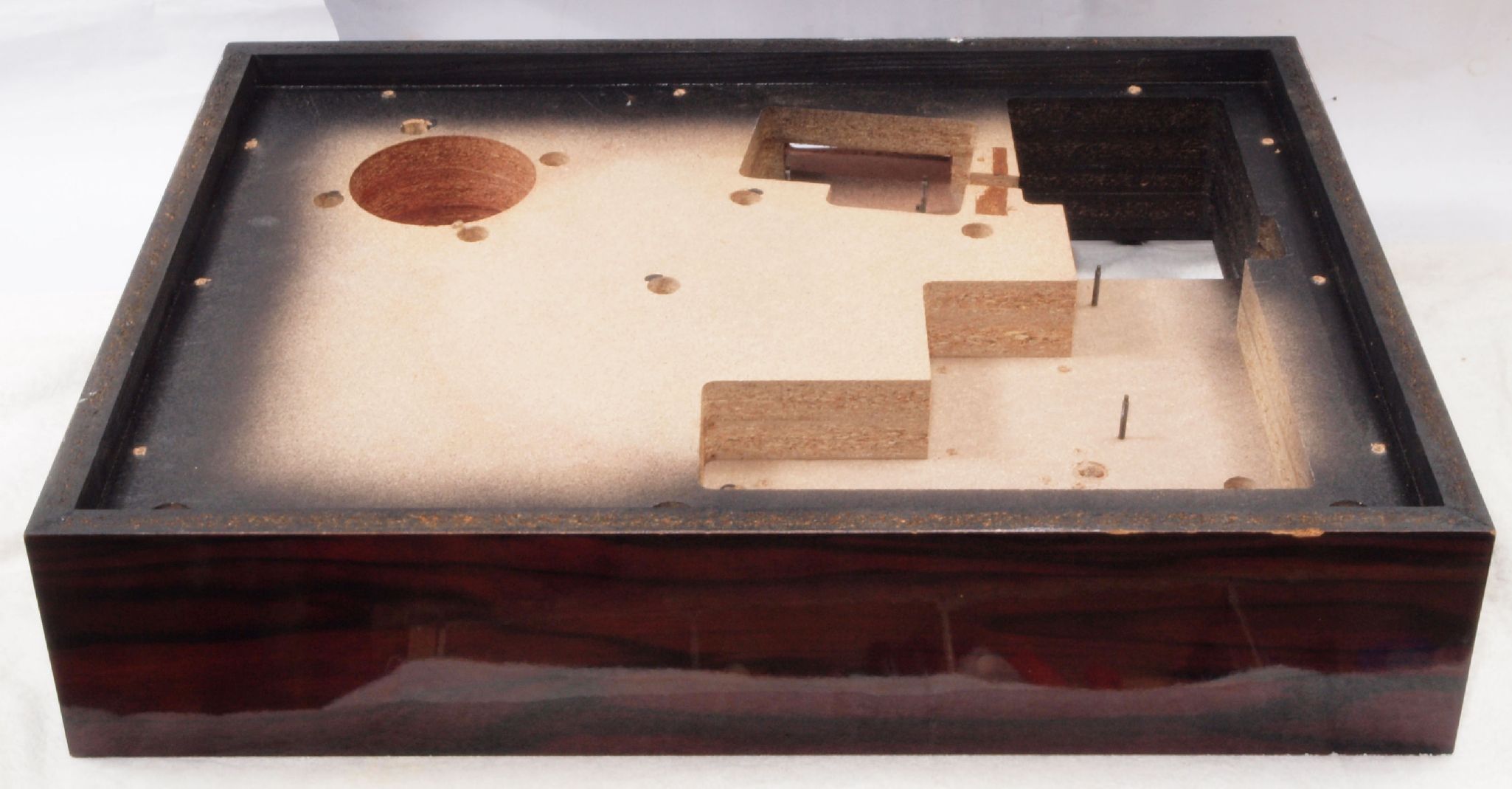 | W. 下蓋及び本体木部 修理状況。 画像をクリックすると、大きく(横幅2050ドット)表示されます。 W1. 修理前 モーター、基板、アーム架台を取り本体上から。 |