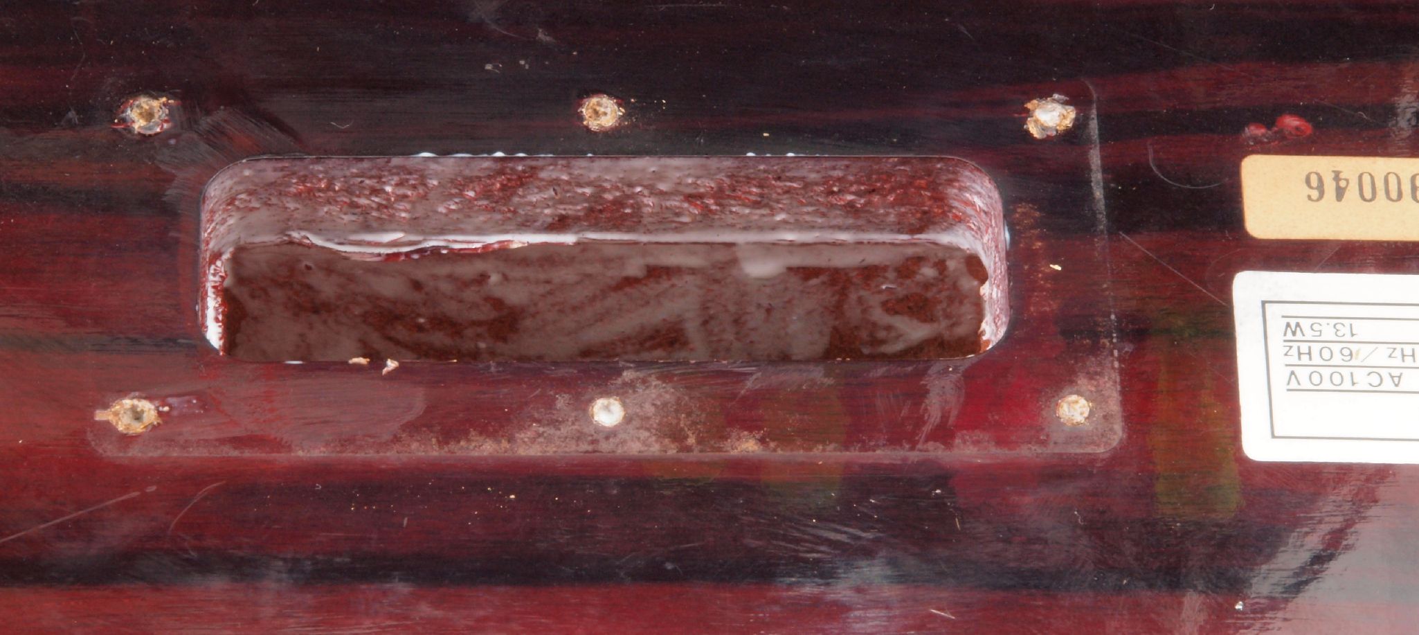 | W81. 修理前 トランスカバーを取り、下蓋裏。トランスカバー部分は1回ボンドを染みまた。 | ||||||||||||||||||||||||