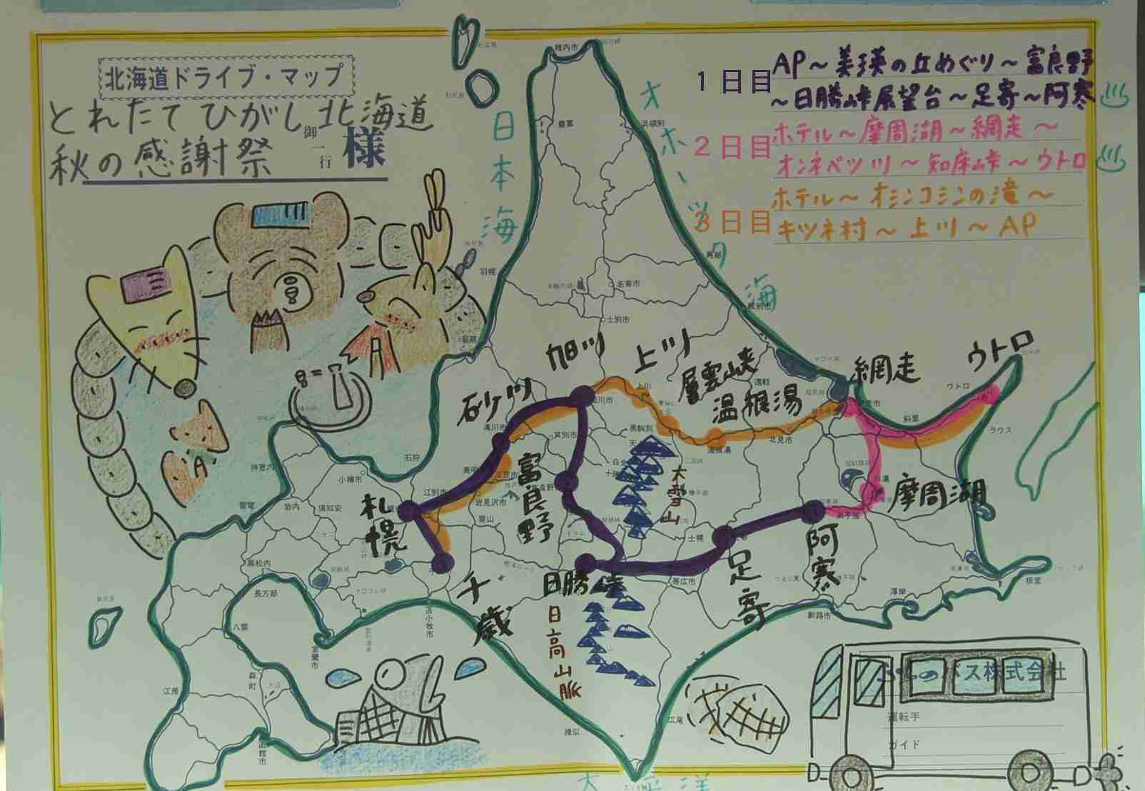 | 1日目 前橋−羽田−阿寒湖−新千歳空−美瑛の丘−富良野−日勝峠展望台−摩周湖泊 |