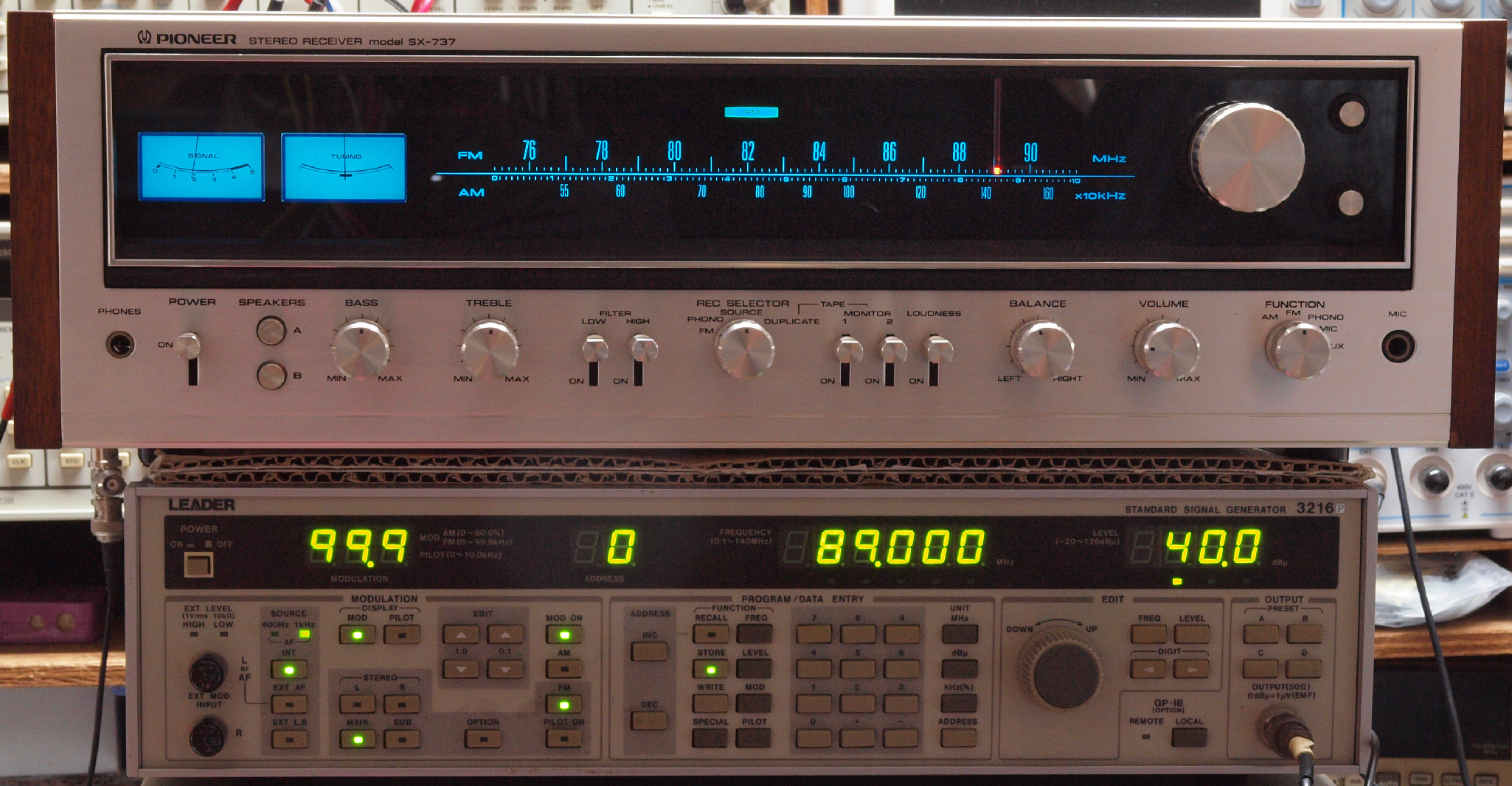 | G. 調整・測定 FM受信感度、FM RL分離測定調整 <見方> 上=「LEADER 3216P FMステレオ信号発信器」より信号を出す。これを受信し出力を測定する。 表示LED、 左端=変調度、 中左=メモリNo、 中右=出力周波数、 右端=出力レベル。 中=R側出力測定。 「Audio Analyzer Panasonic VP−7723A」より測定。 表示LED、 左端=メモリーNo、中左=周波数測定、中右=出力電圧測定、右端=歪み率測定。 下=L側出力測定。 「Audio Analyzer Panasonic VP−7723A」より測定。 表示LED、 左端=メモリーNo、中左=周波数測定、中右=出力電圧測定、右端=歪み率測定。 |
