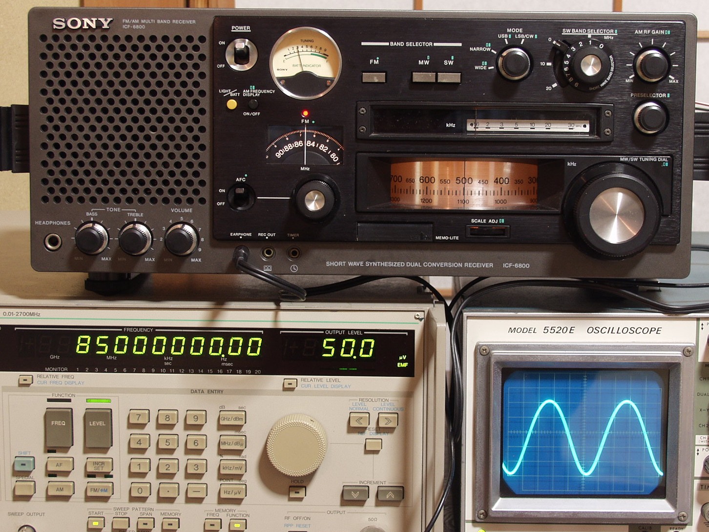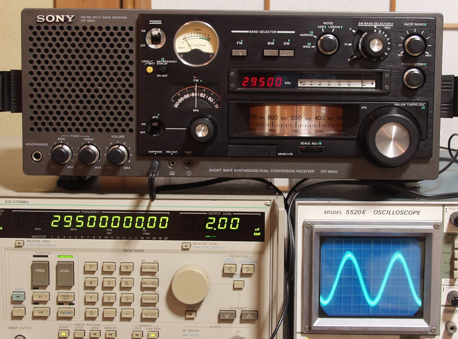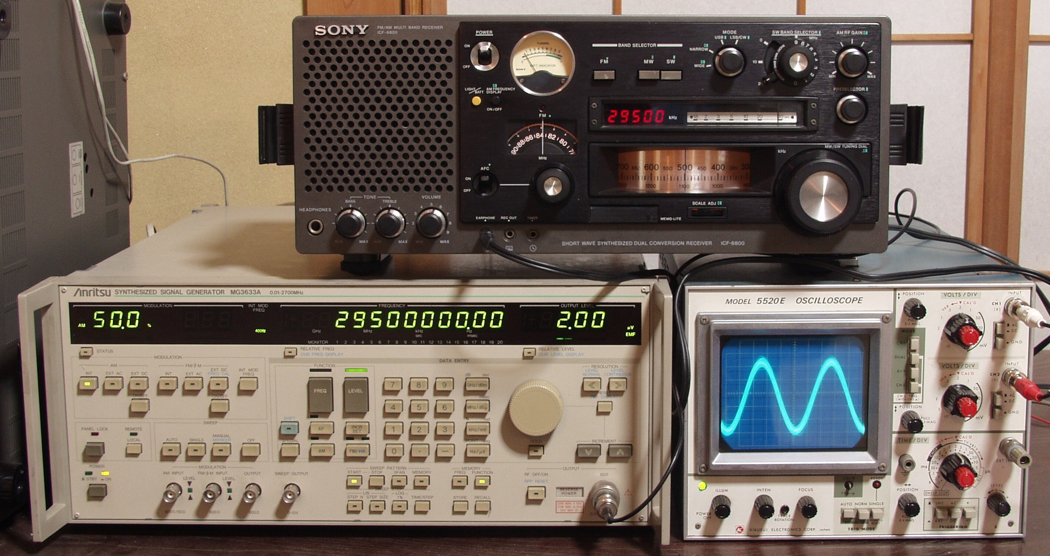 | E.調整・測定 下のSSGより29.5MHZのキャリヤに400HZを50%変調かけて2μVを受信 SP出力を左のオシロで見る 以下、SW測定は周波数の変更のみで測定 プロの受信機測定は此方 アマチュア機器の測定は此方 |
