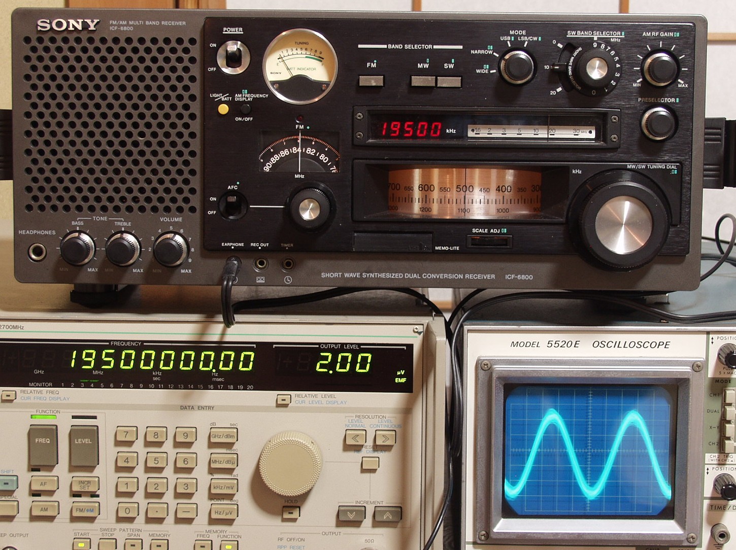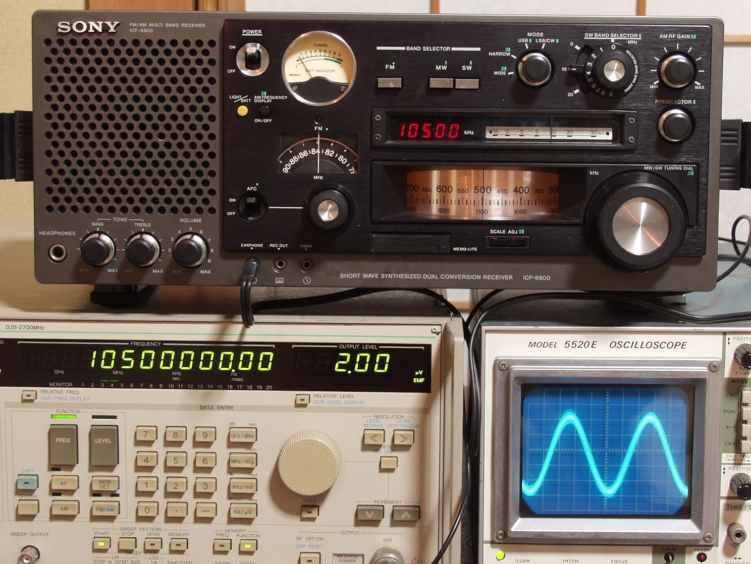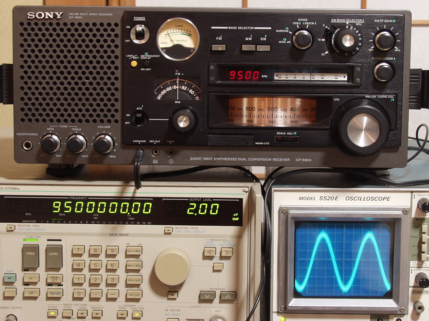 | E.調整・測定 下のSSGより29.5MHZのキャリヤに400HZを50%変調かけて2μVを受信 SP出力を左のオシロで見る 以下、SW測定は周波数の変更のみで測定 プロの受信機測定は此方 アマチュア機器の測定は此方 |
