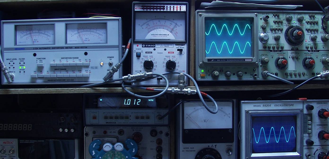 | E−2A. 出力/歪み率測定・調整 出力=28V=98W 歪み率0.03% at=1000HZ AUX端子入力 |