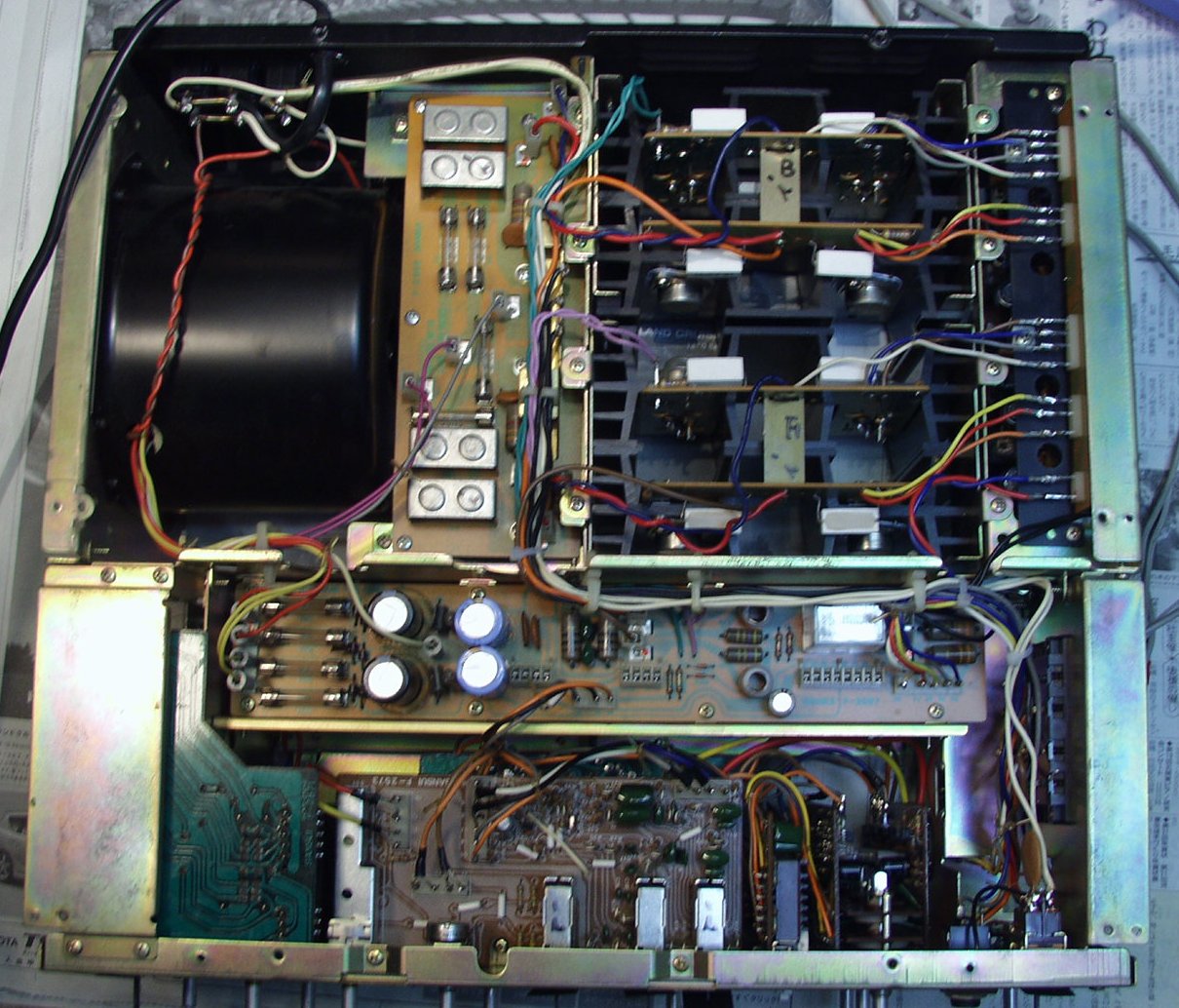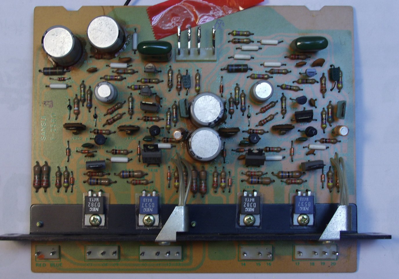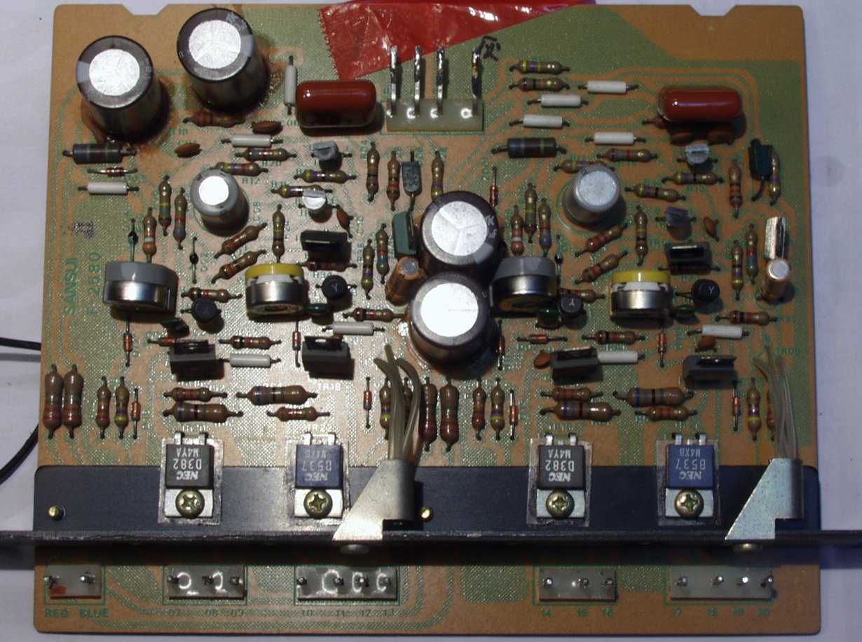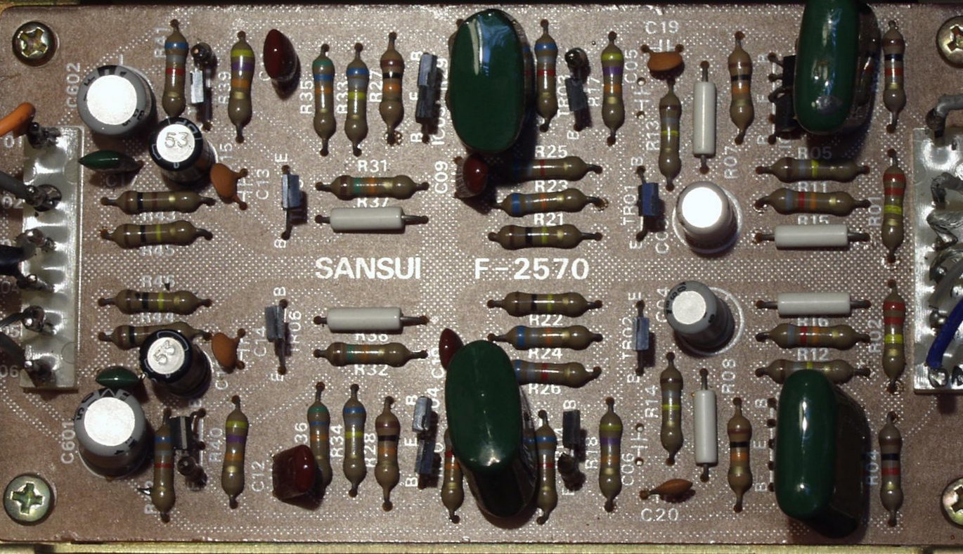 | C2B. 修理後 ドライバー基盤 初段TR(トランジスター)4個 半固定VR4個 電解コンデンサー4個交換 結合コンデンサーをメタライズドフイルムコンデンサーに交換 |