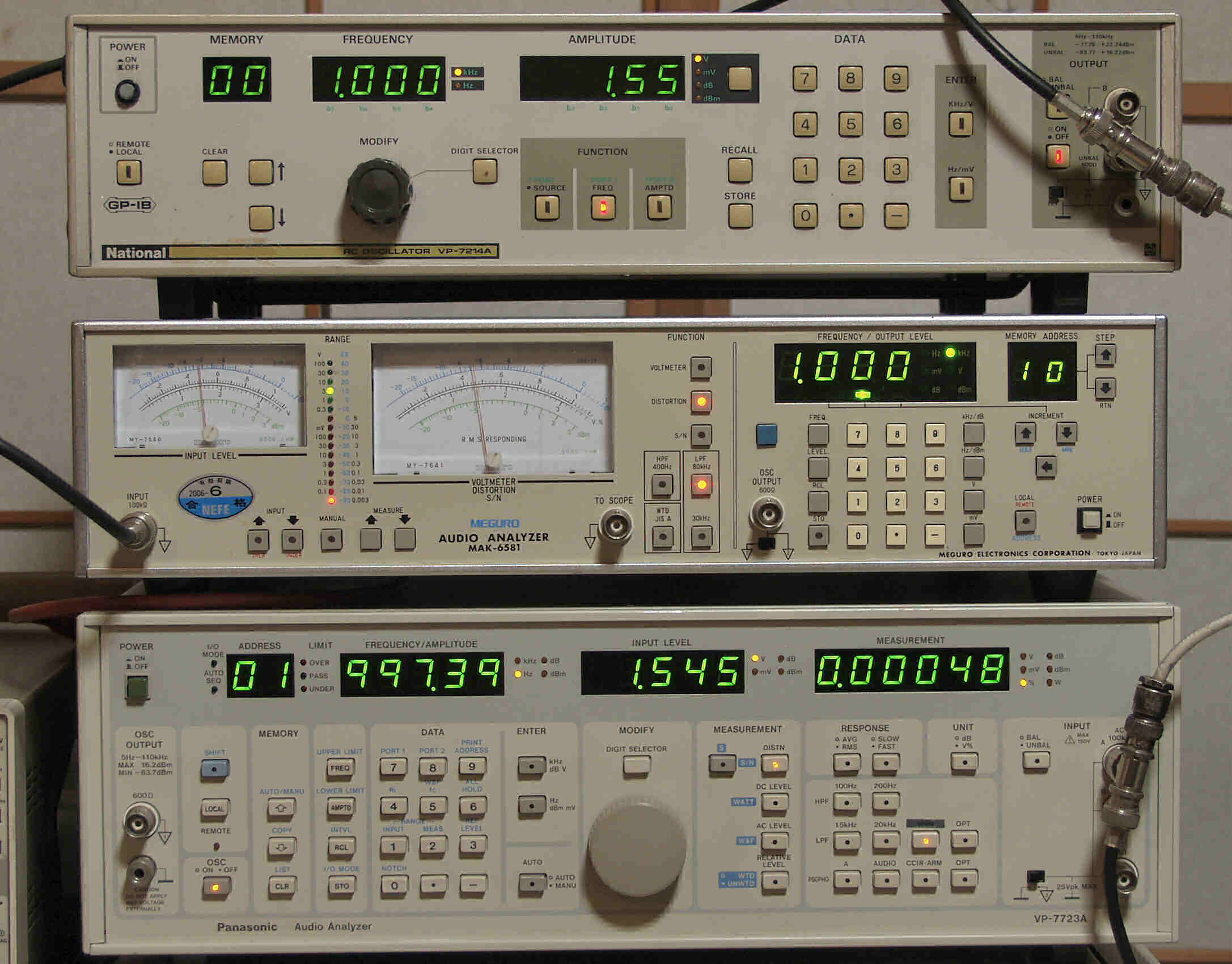 | E3. 他機種との測定比較。上=VP−7214A、 中=MEGURO MAK−6581、 下=VP−7721A。 上=VP−7214AよりOSC出力=1kHz、1.55V出力。 中=MAK−6581での歪み率測定=0.0015%(0.003%レンジ、80HzBW sw入)。 取扱説明書仕様=20Hz〜10kHz、(80HzBW sw入)で残留歪み率=0.0018%。 下=VP−7723Aでの歪み率測定=0.00048%(0.01%レンジ、80HzBW sw入)=測定限界以下のレベル。 取扱説明書仕様=5Hz〜20kHz、で残留歪み率=0.001% 以下。 |