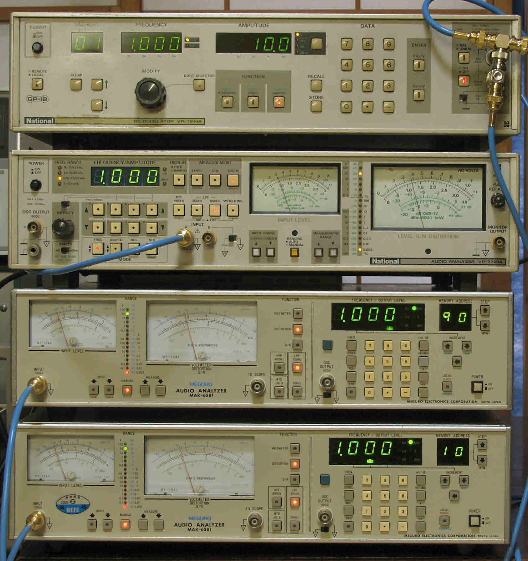 | E4. 他機種との測定比較2。 上=VP−7214A、 中=VP−7721A、下2台=MEGURO MAK−6581。 上=VP−7214AよりOSC出力=1kHz、10V出力。 中上=VP−7721Aでの歪み率測定=0.0012%(0.003%レンジ、80HzBW sw入)。 取扱説明書仕様=10Hz〜15.99kHz、で残留歪み率=0.0018%以下。 下下=MAK−6581での歪み率測定=0.0013%(0.003%レンジ、80HzBW sw入)。 取扱説明書仕様=20Hz〜10kHz、(80HzBW sw入)で残留歪み率=0.0018%以下。 下=2台目MAK−6581での歪み率測定=0.0011%(0.003%レンジ、80HzBW sw入)。 取扱説明書仕様=20Hz〜10kHz、(80HzBW sw入)で残留歪み率=0.0018%以下。 下から2段目は2台目MAK-6581。 |