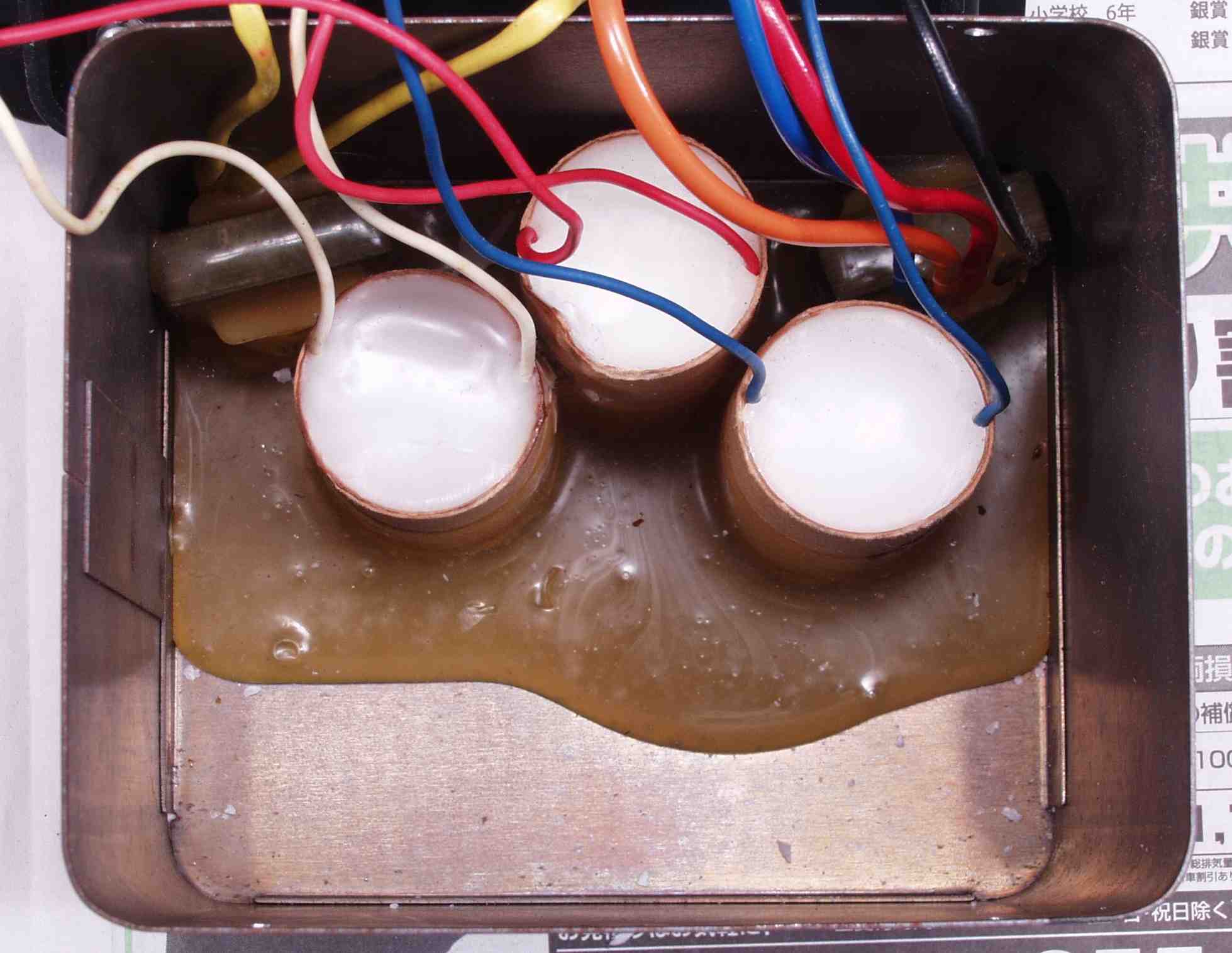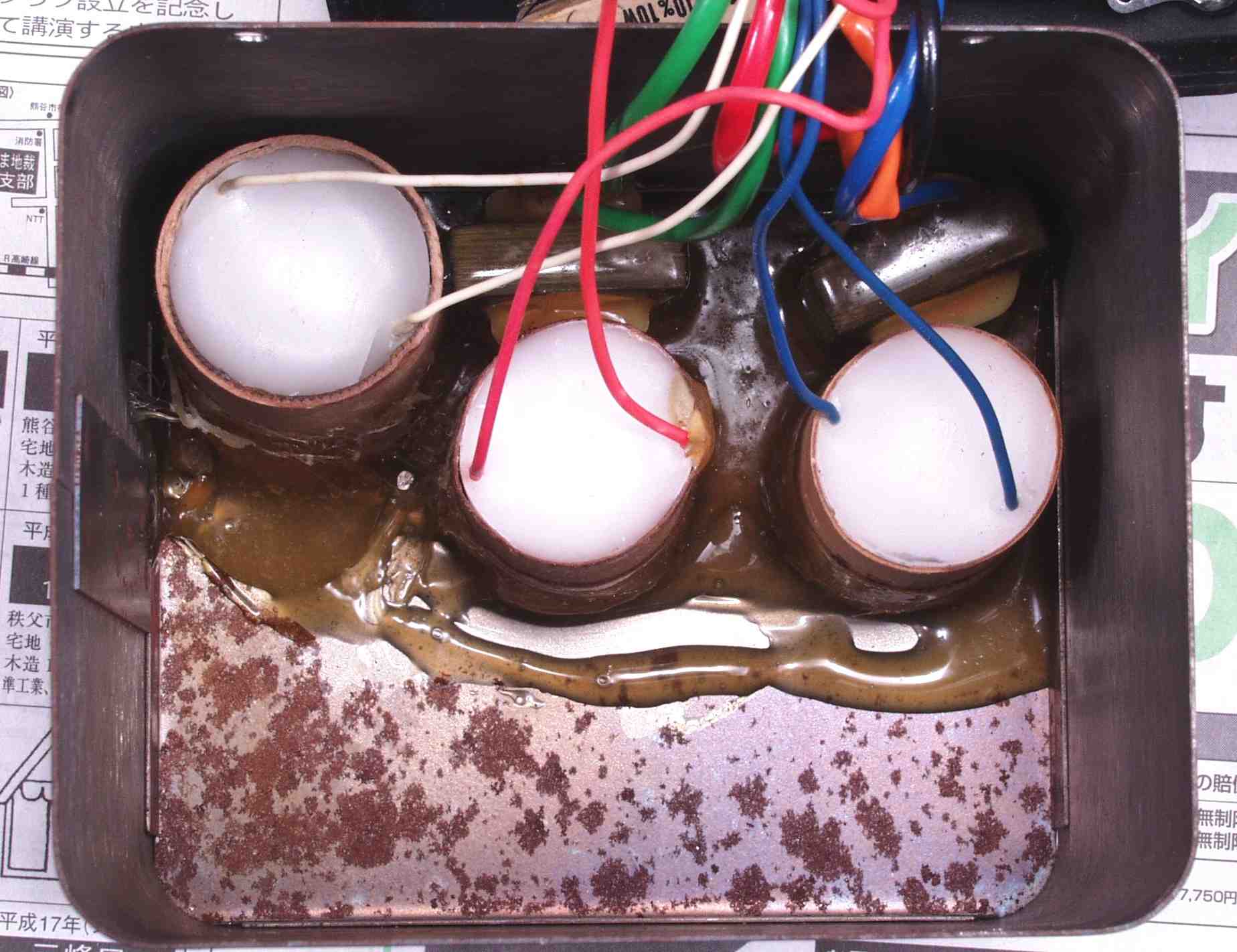 | C3B. 修理後B コンデンサー3組挿入、シリコンでしっかり固定する。古いフイルムコンデンサーは使用せずに残す。 | ||||||||||||||||