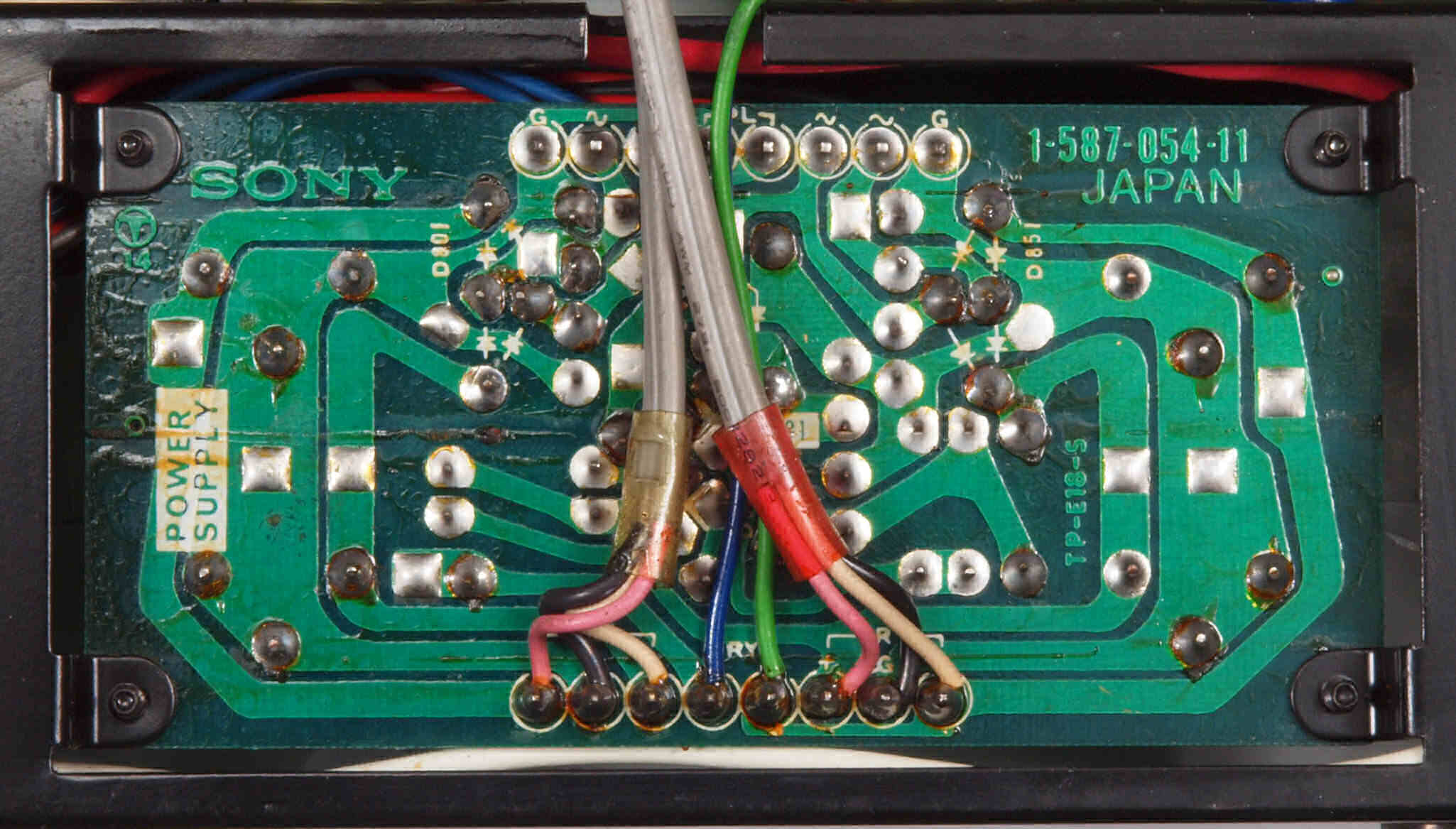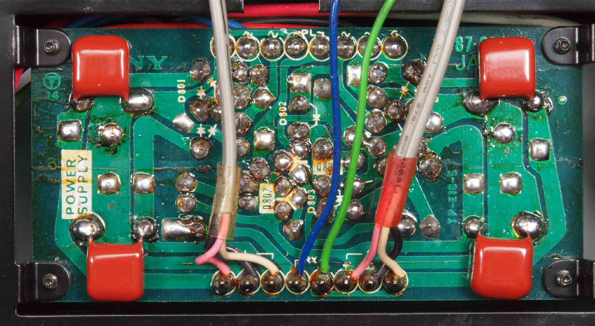| C24. 修理(半田補正)後 左側アンプ基板裏。 半田を全部やり直す。セラミックコンデンサー2個追加。 | ||||||||||||||||||||||||||||||||||||