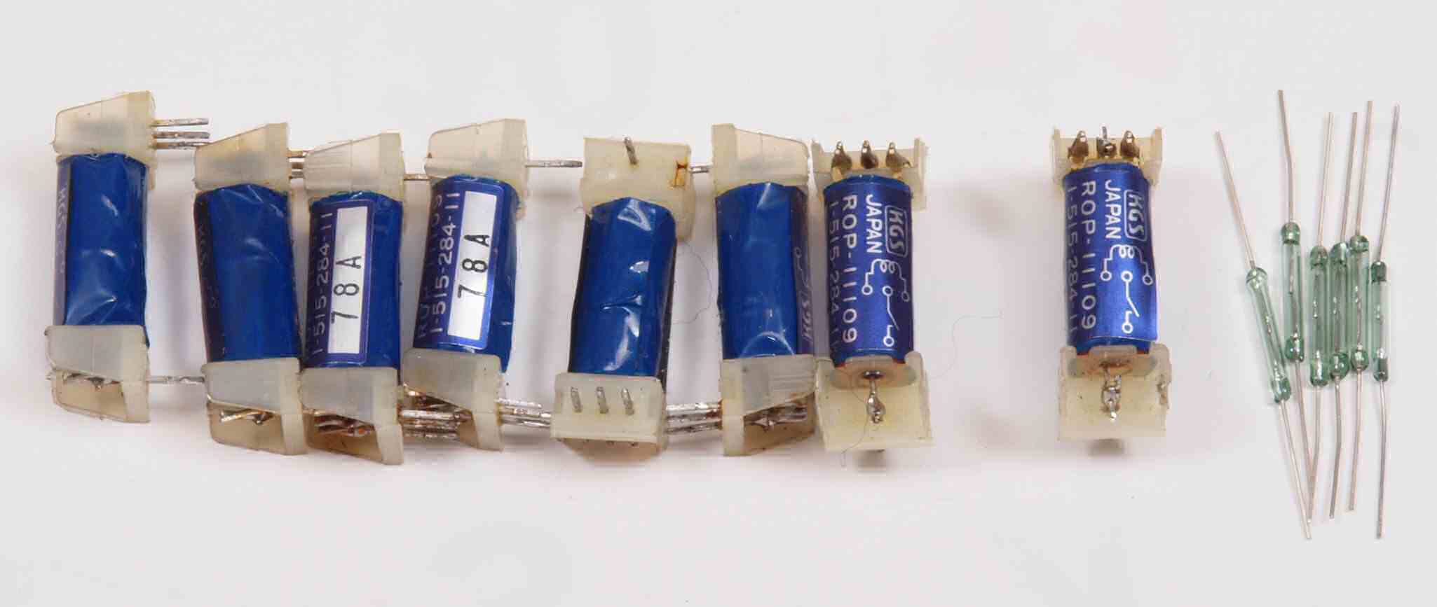 | C41. 修理中 リードリレーの交換修理。 左が=古い物 右=新しい物。 リレーをそっくり交換した方が、遙かに安いが、ピン配置が異なるので素子のみ交換する。 |