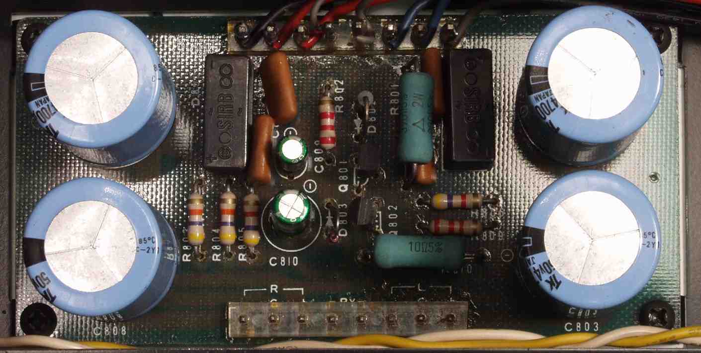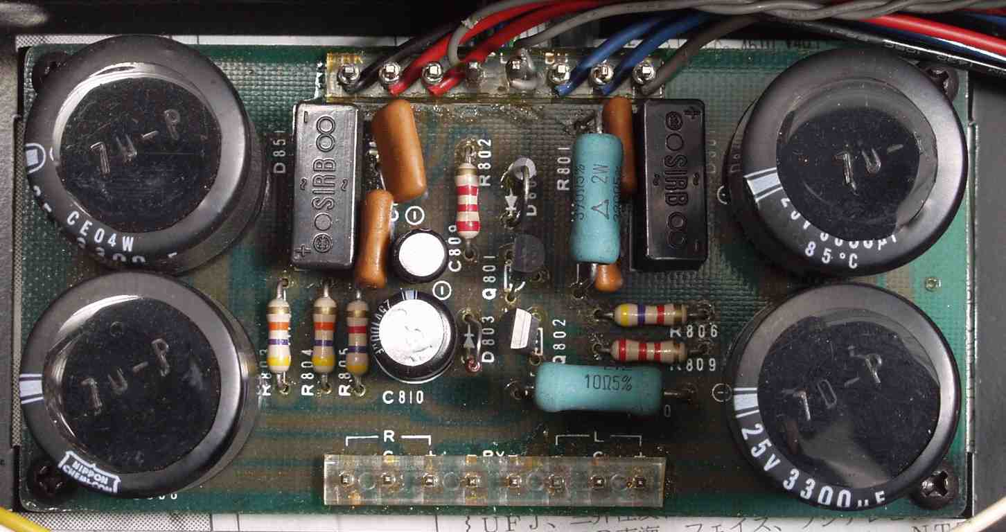 | C22. 修理後 電源基板。 25V/3300μから50V/4700μに増量交換、 電解コンデンサー6個交換。 | ||||||||||||||||||||||||||||||||||||