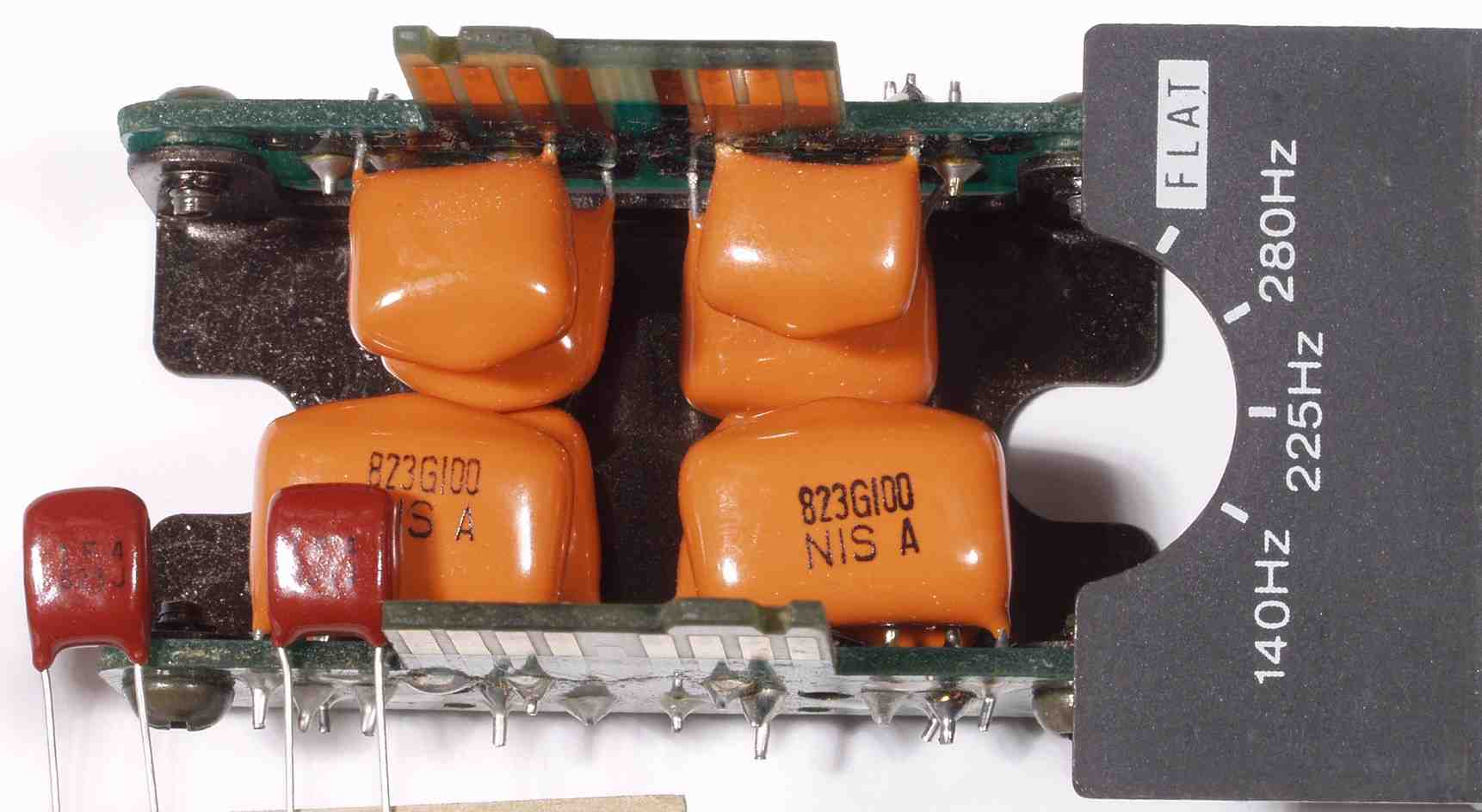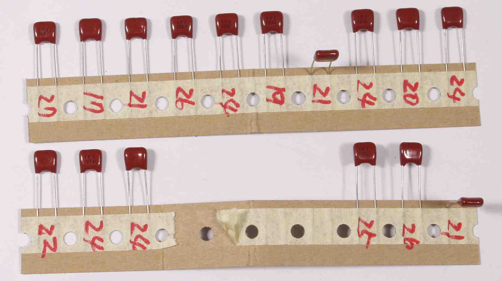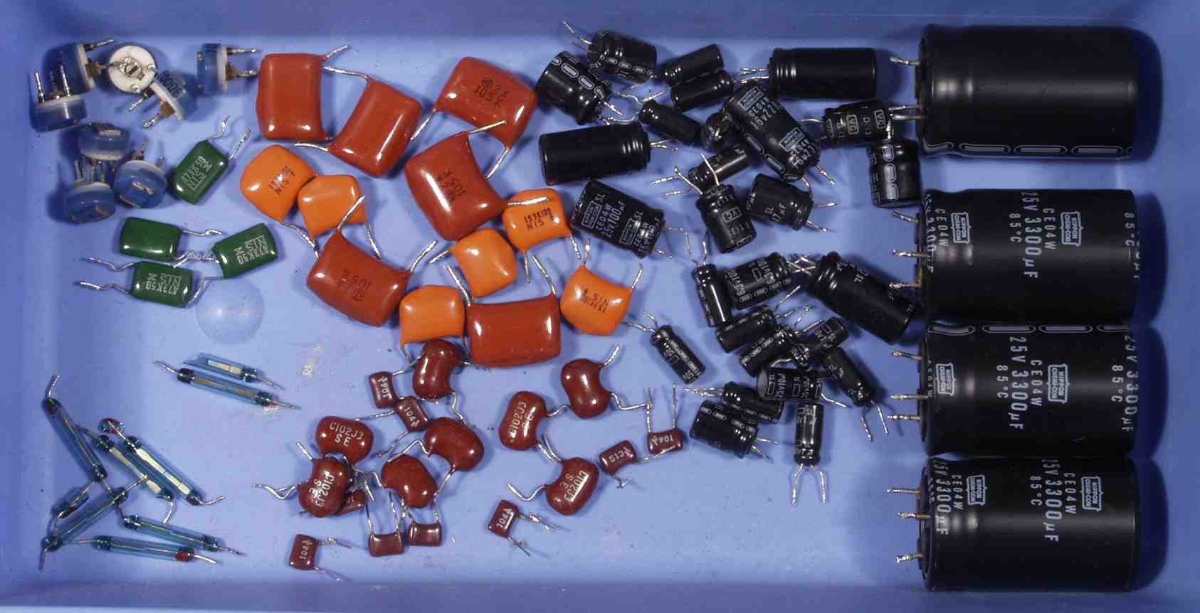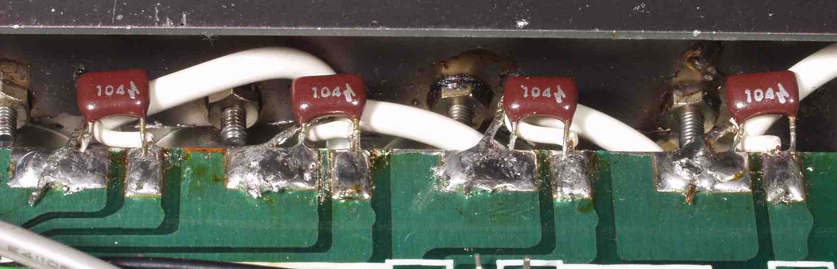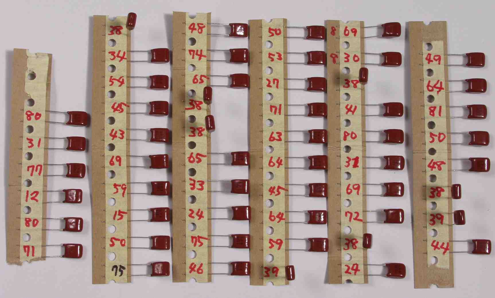 | A4. 点検中 フイルムコンデンサーの比較 上=使用されている物 下右=現在の物 下左=積層セラミック | ||||||||||||||||||||||||||||||||||||