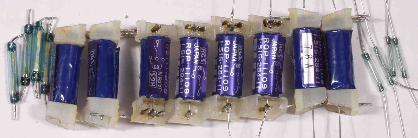 | C31. 修理中 リードリレーの交換修理。 左が=古い物 右=新しい物。 リレーをそっくり交換した方が、遙かに安いが、ピン配置が異なるので素子のみ交換する。 |