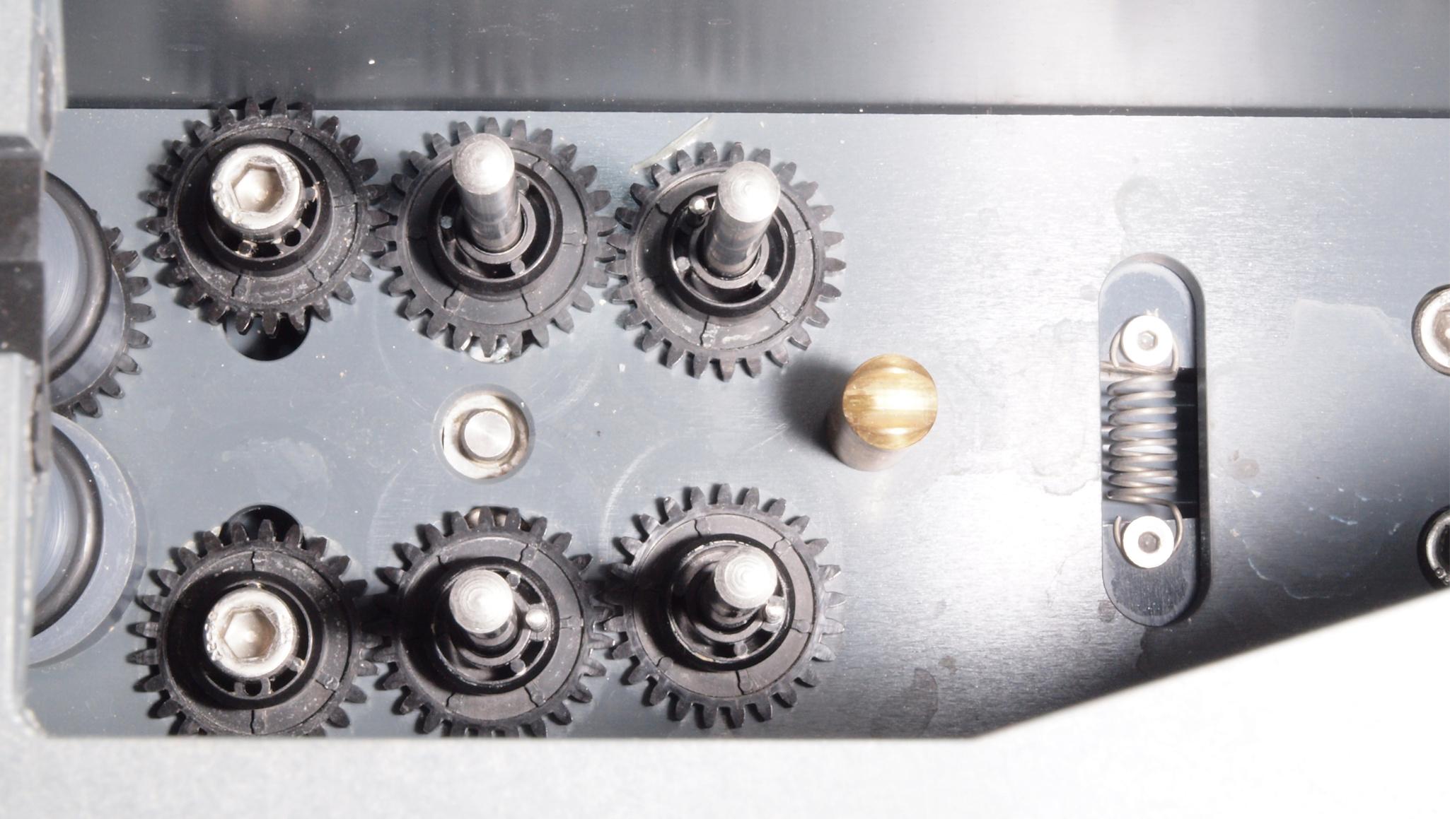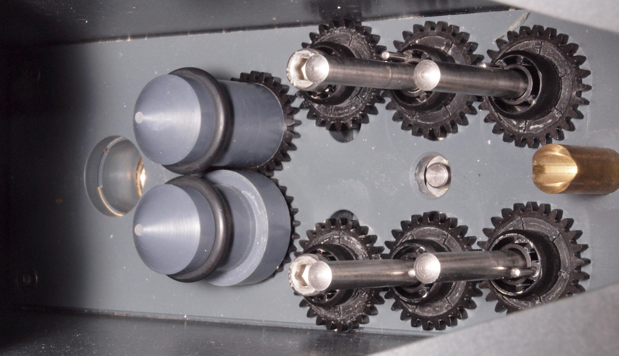 A42. 点検中 レコード駆動部を見る。左側がレコード回転ローラー、右2段4個洗浄ブラシ駆動。