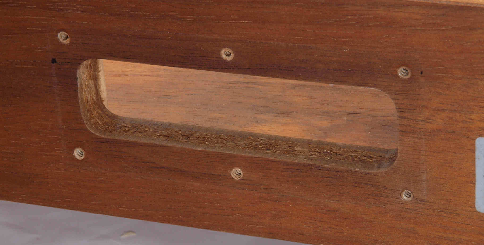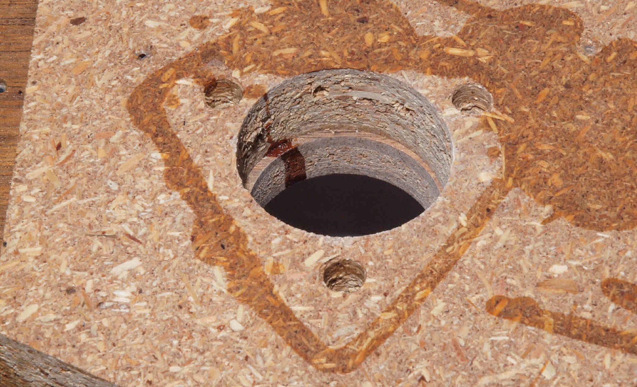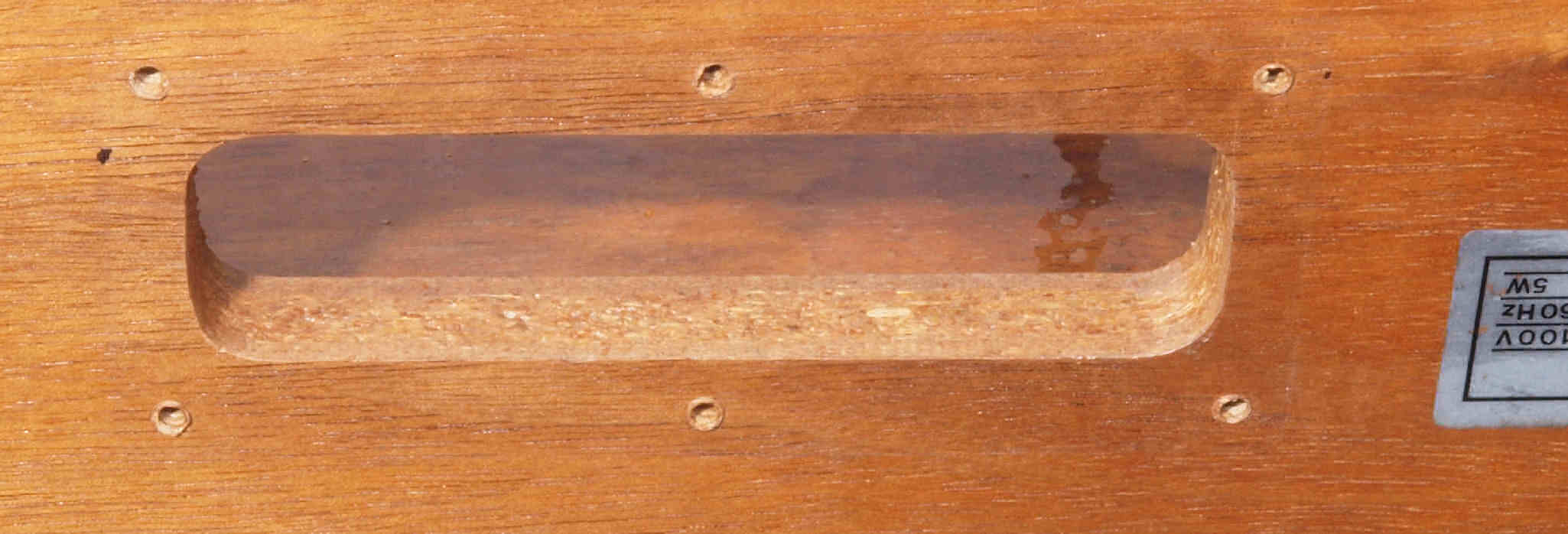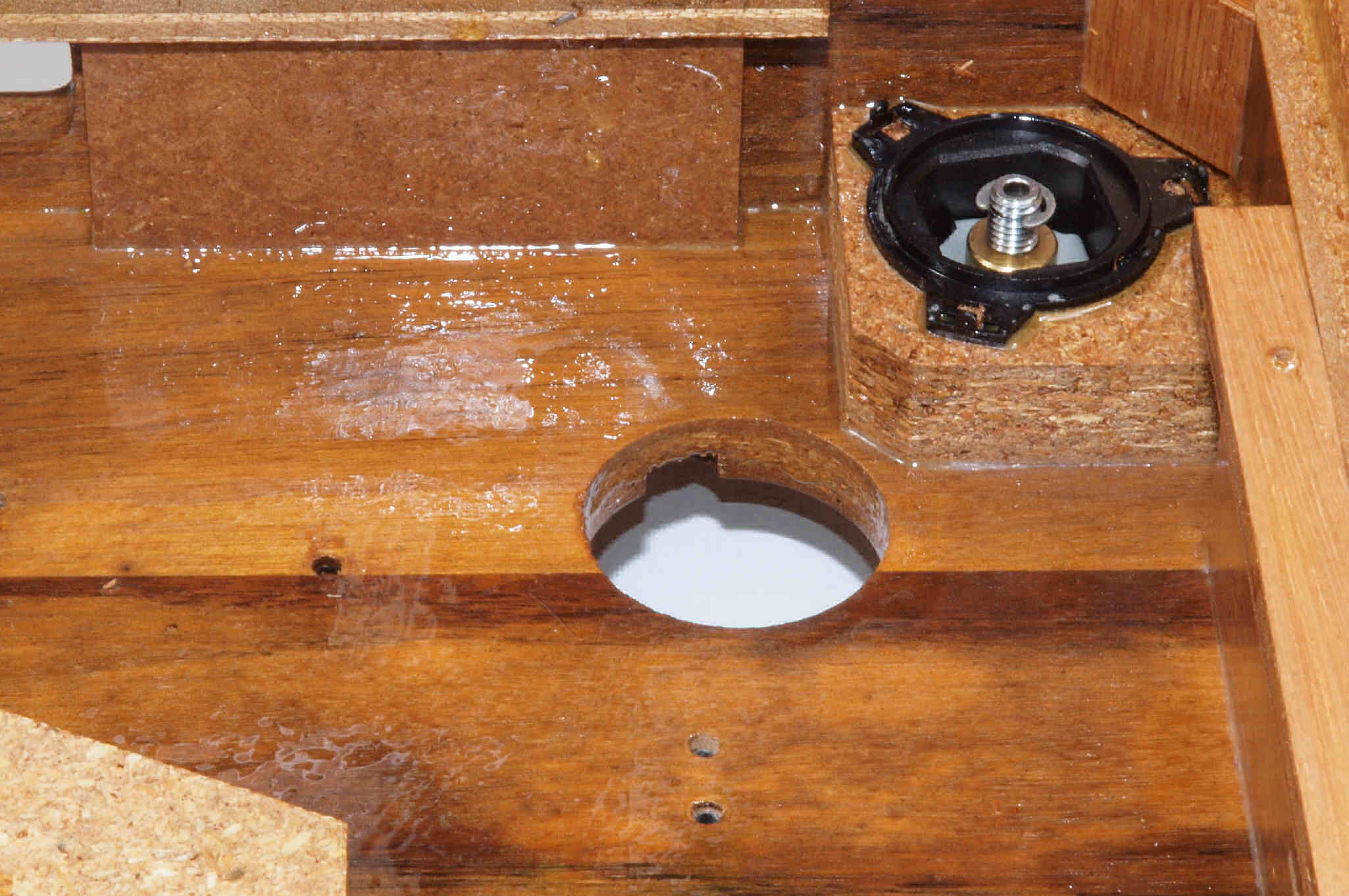 | W26. 修理後 アーム取付穴。 乾燥後さらにウレタン塗料を塗る。 | ||||||||||||||||||||||||||||||
