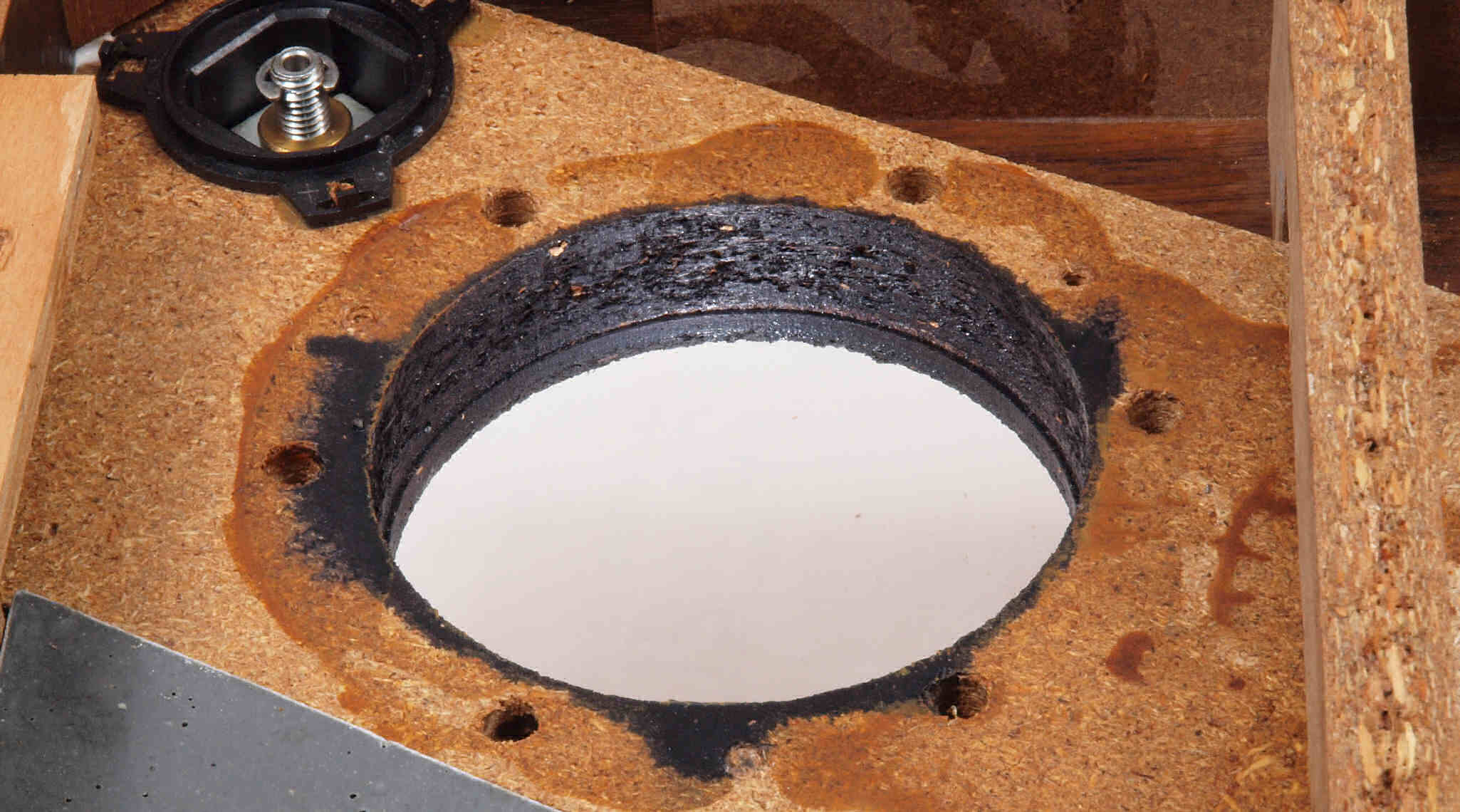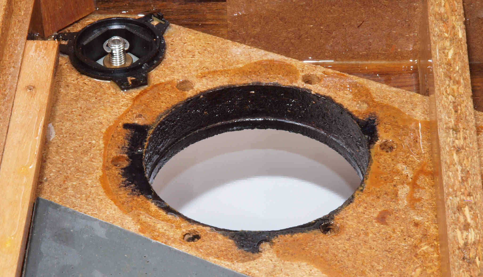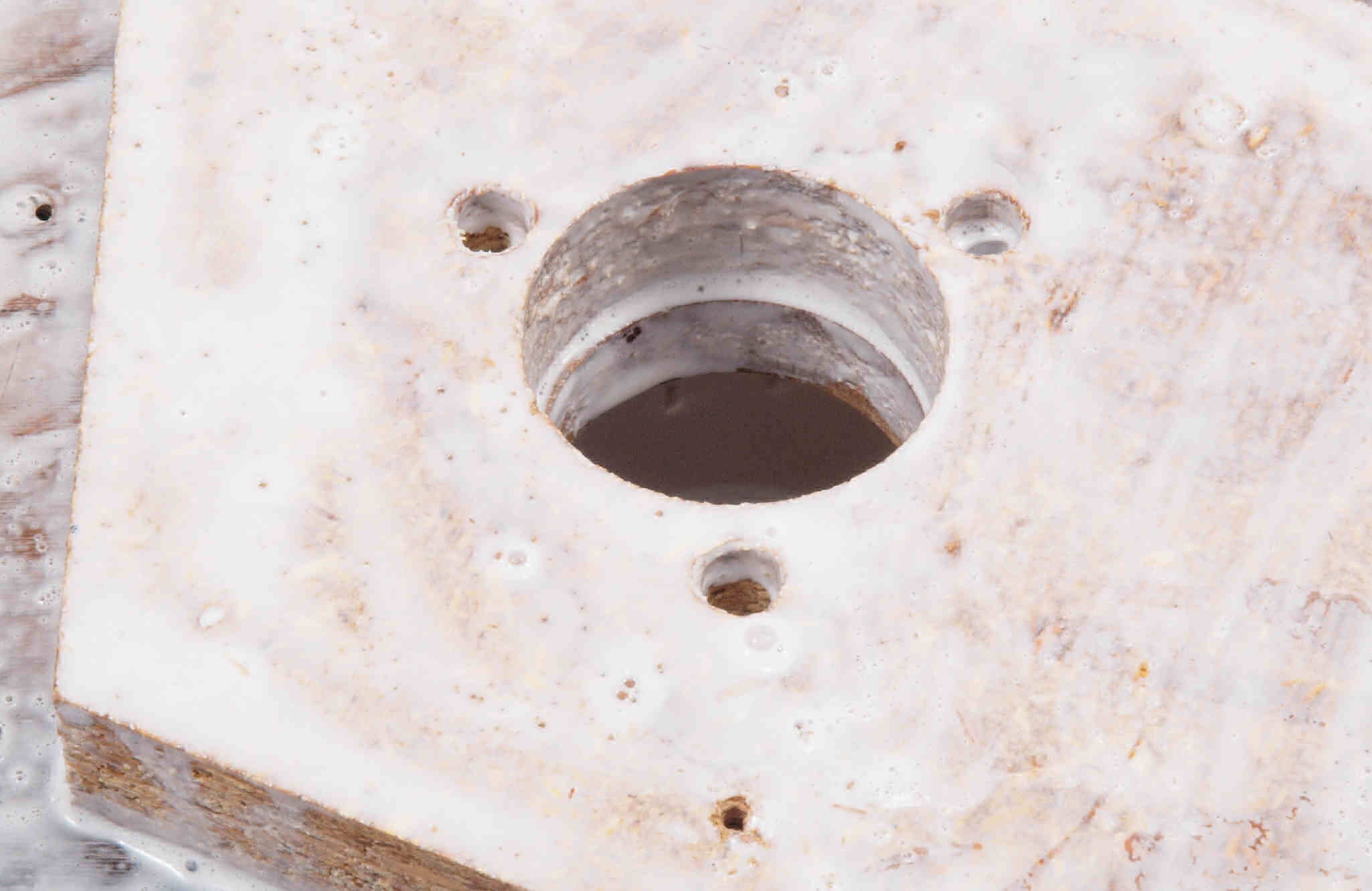| W26. 修理後 アーム取付穴。 乾燥後さらにウレタン塗料を塗る。 | ||||||||||||||||||||||||||||||