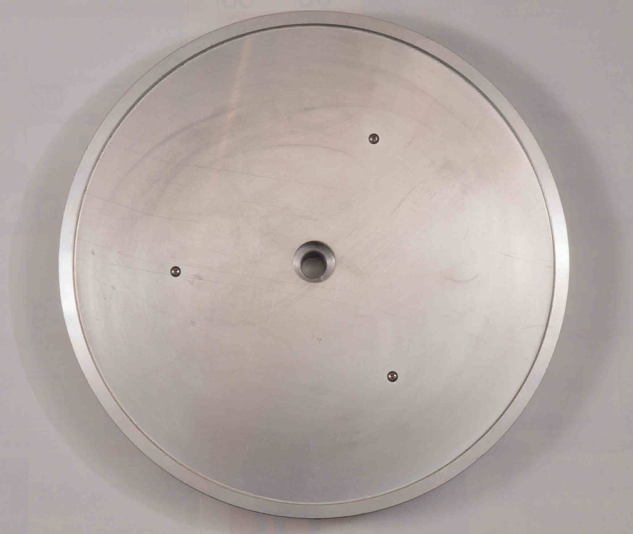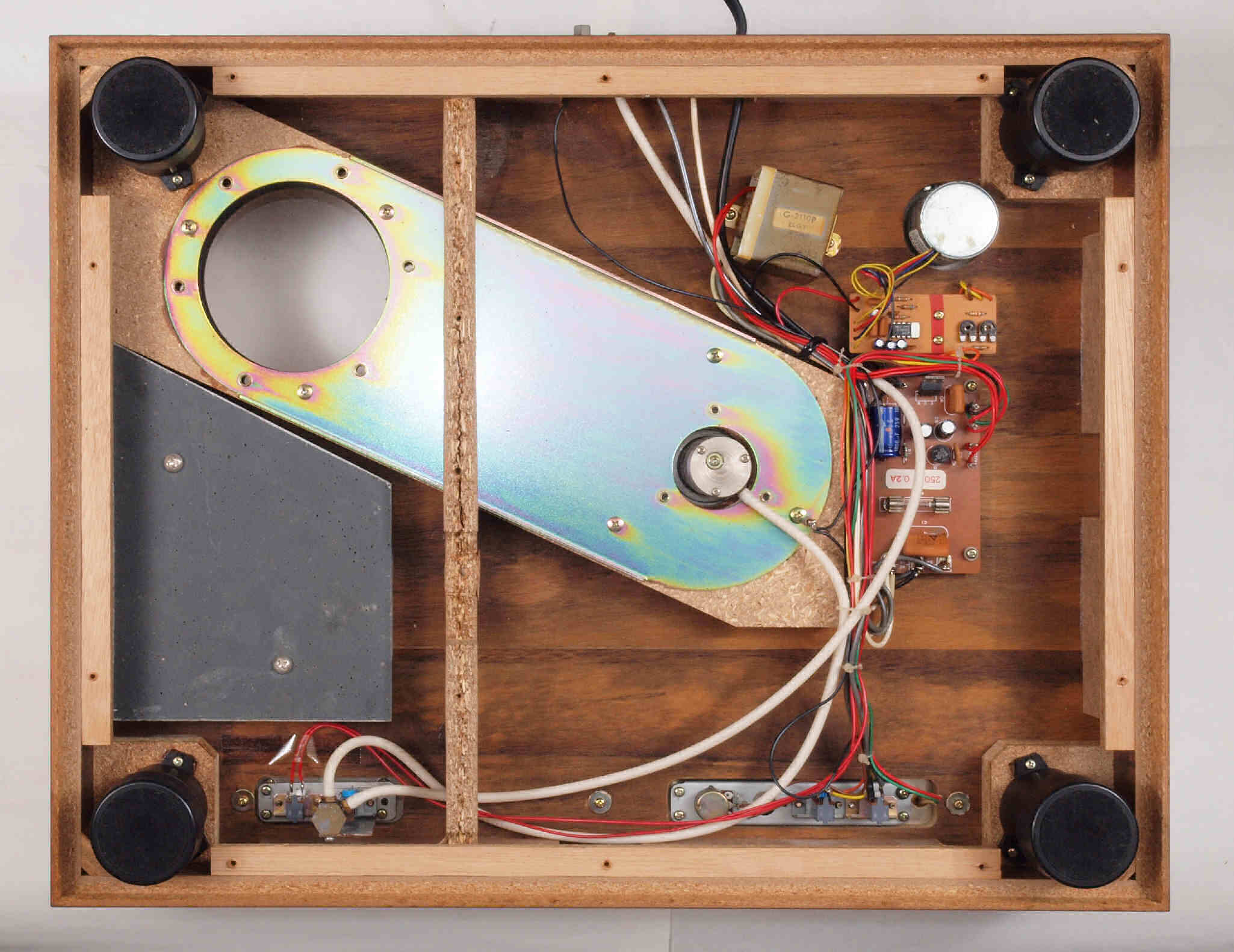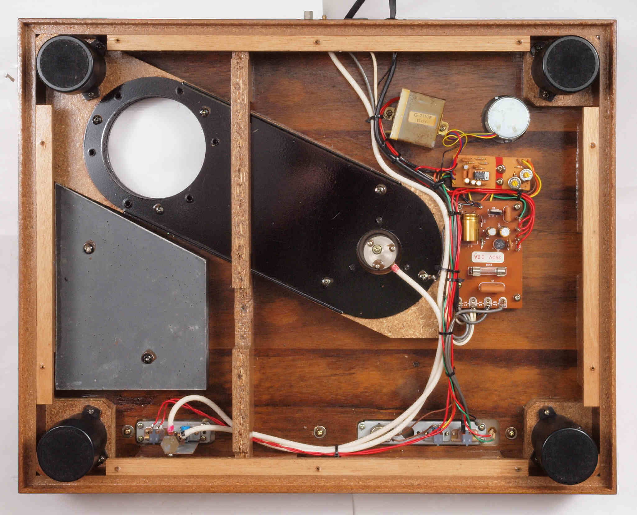 | A16. 点検中 上から見る。ユーザはタンテーブル(プラッター)が外せないので「かいものを」入れて固定。 このタンテーブル(プラッター)がアルミ製で軽いので、軸への負担は少ない。 |