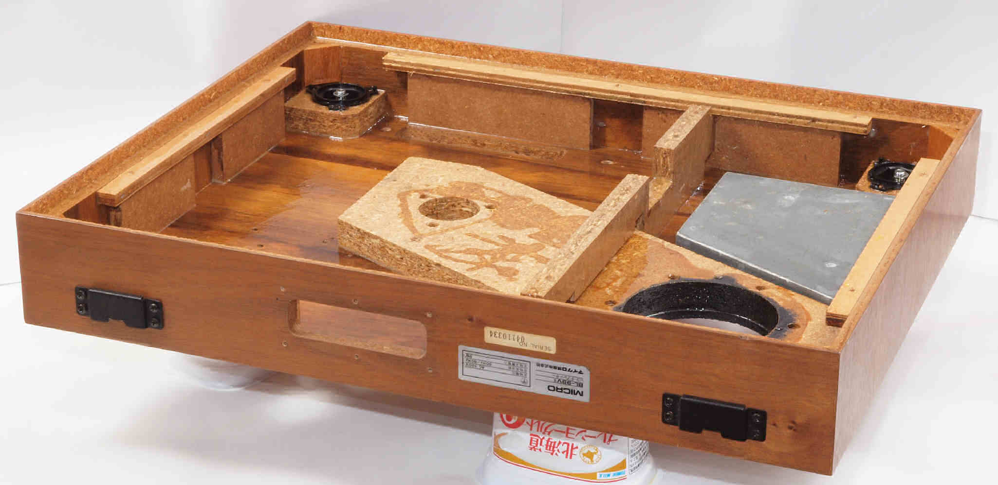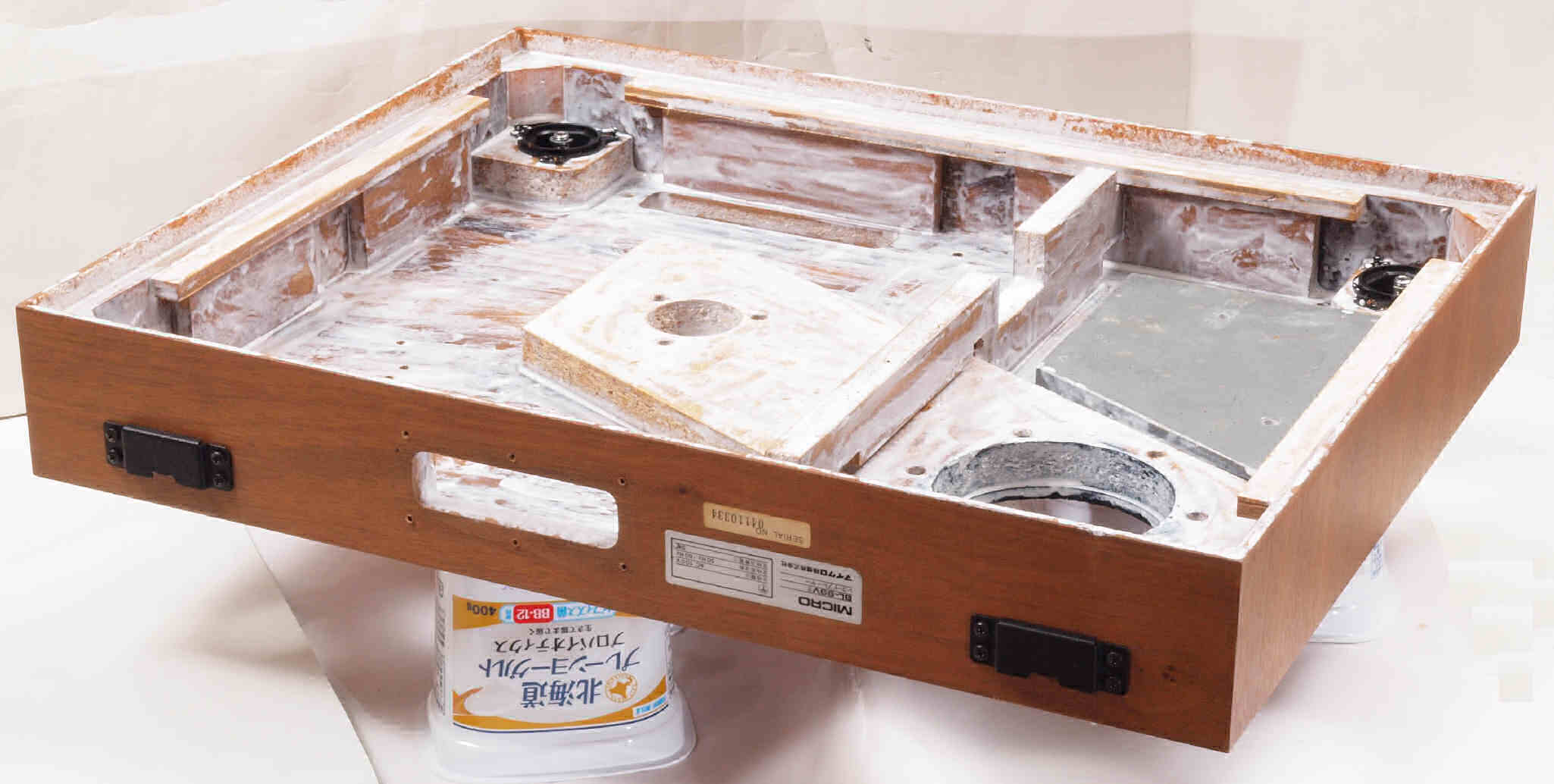 | W. 下蓋及び本体木部 修理状況。 画像をクリックすると、大きく(横幅2050ドット)表示されます。 W11. 修理前 本体木枠下。取り外せる物は全て取り除く。 |