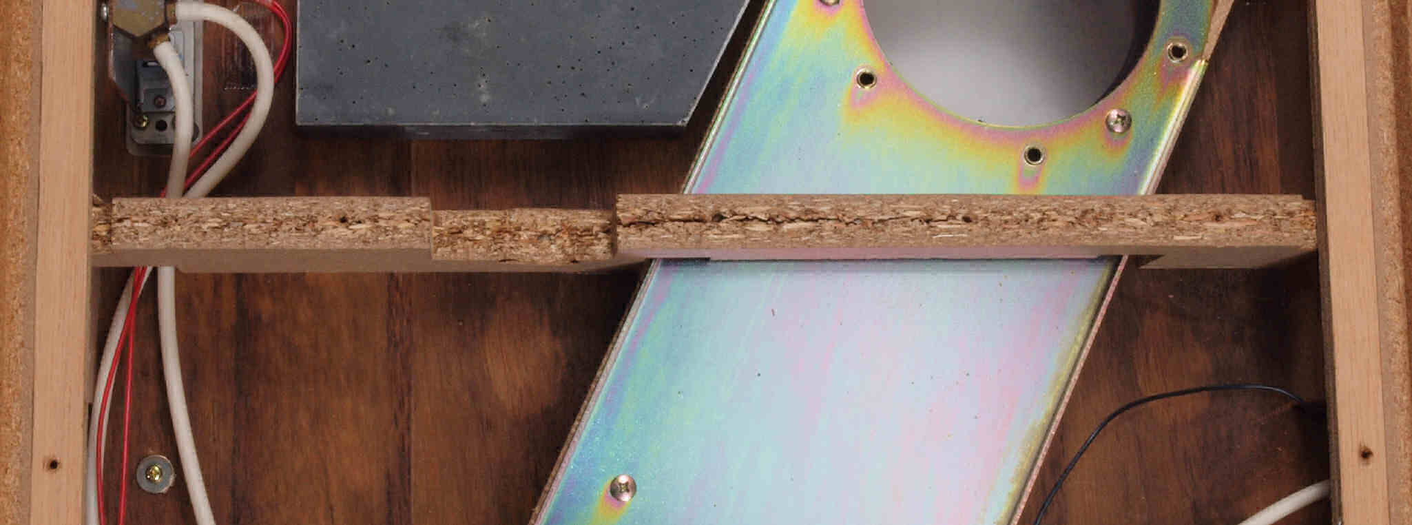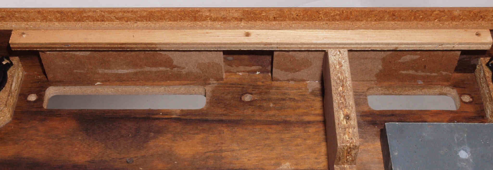| W12. 修理中 本体木枠下。 補強の圧縮材の割れ目にボンドを染みこませ、シャコ万力で固定する。 | ||||||||||||||||||||||||||||||