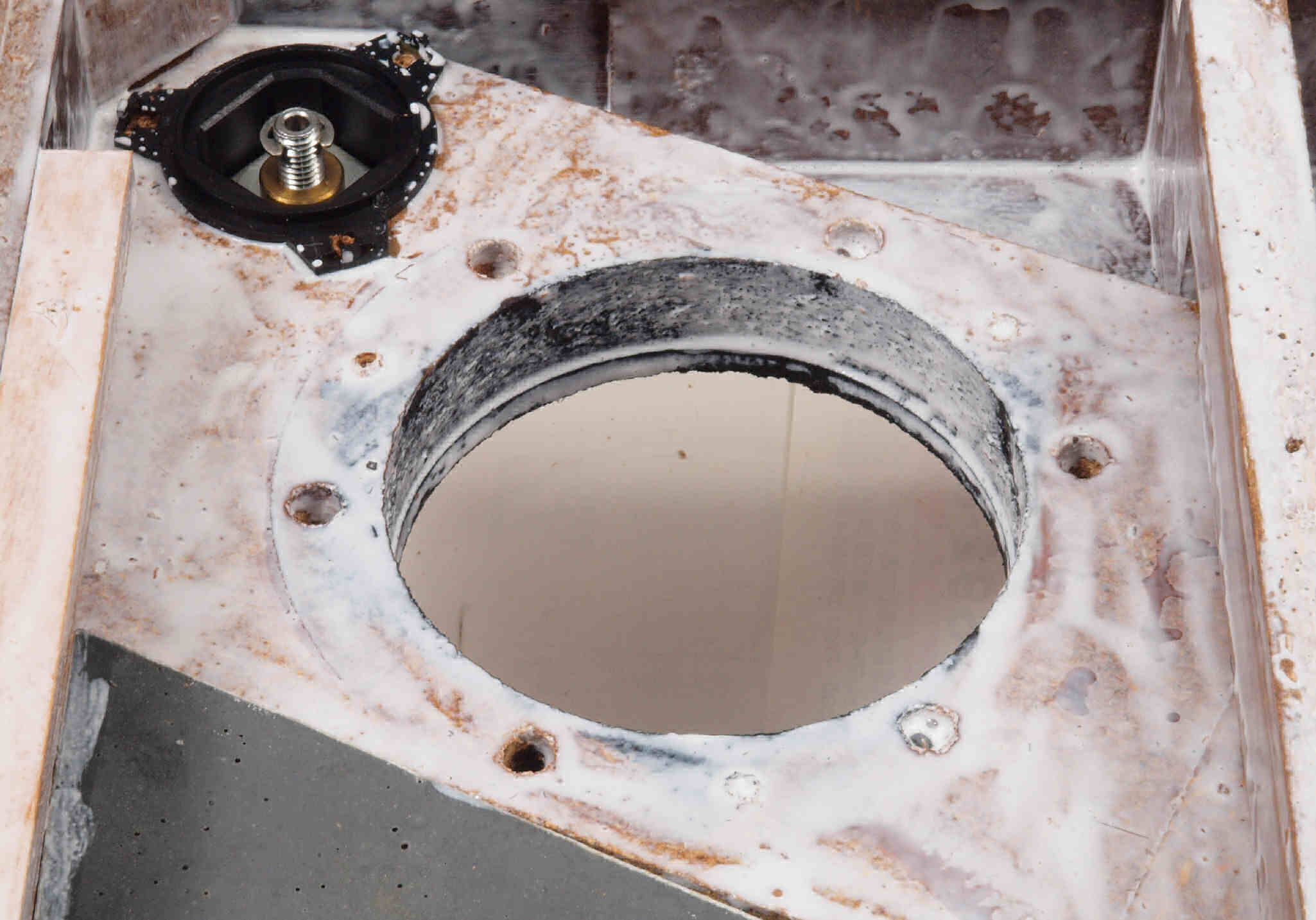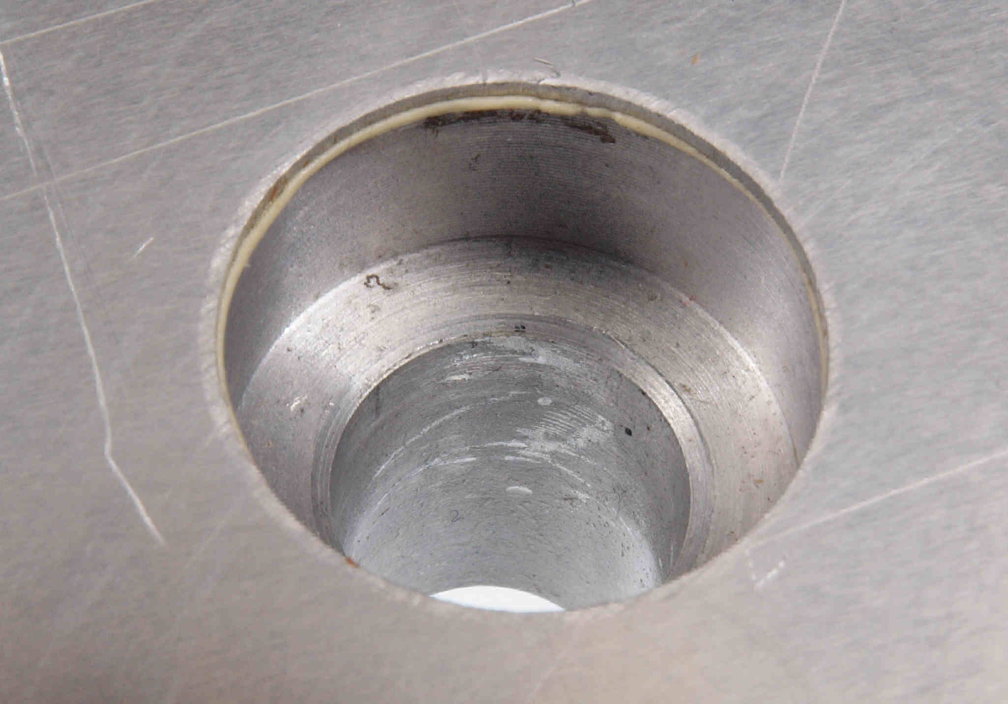 | W35. 修理中 プラッター軸受取付穴、反対側。 圧縮材にボンドを染みこませる、ネジ穴も塗る。 | ||||||||||||||||||||||||||||||