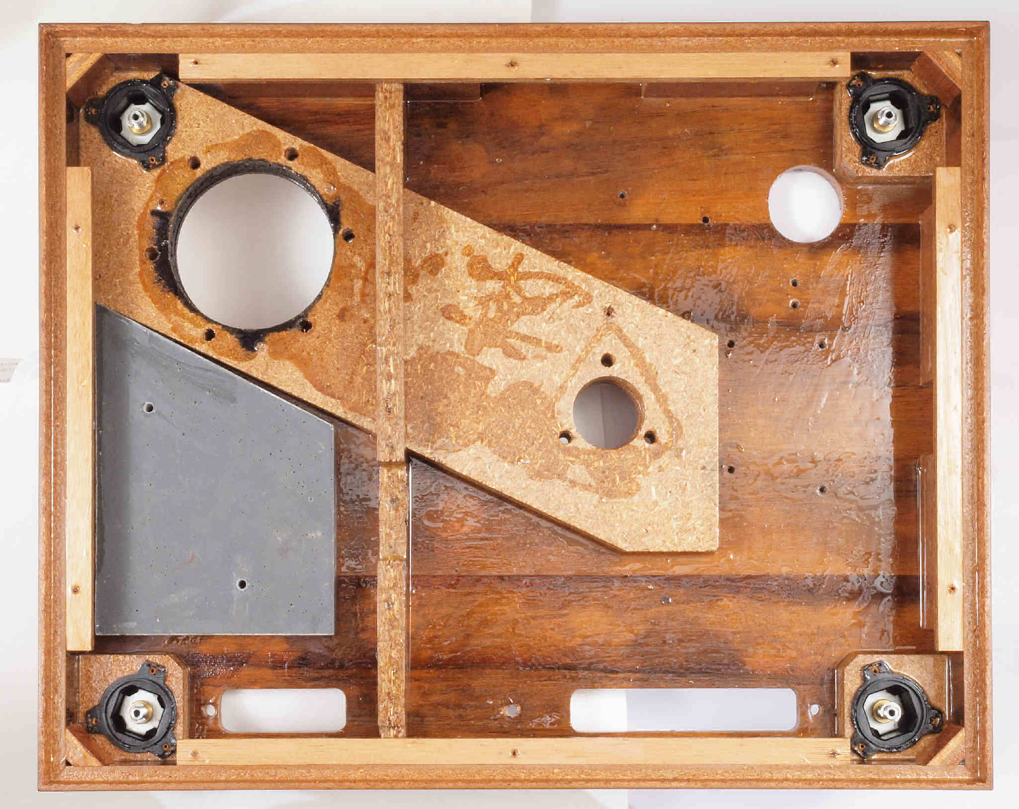 | W1A. 修理後 本体木枠下、後左より見る。 更にウレタン塗料を塗る。 | ||||||||||||||||||||||||||||||