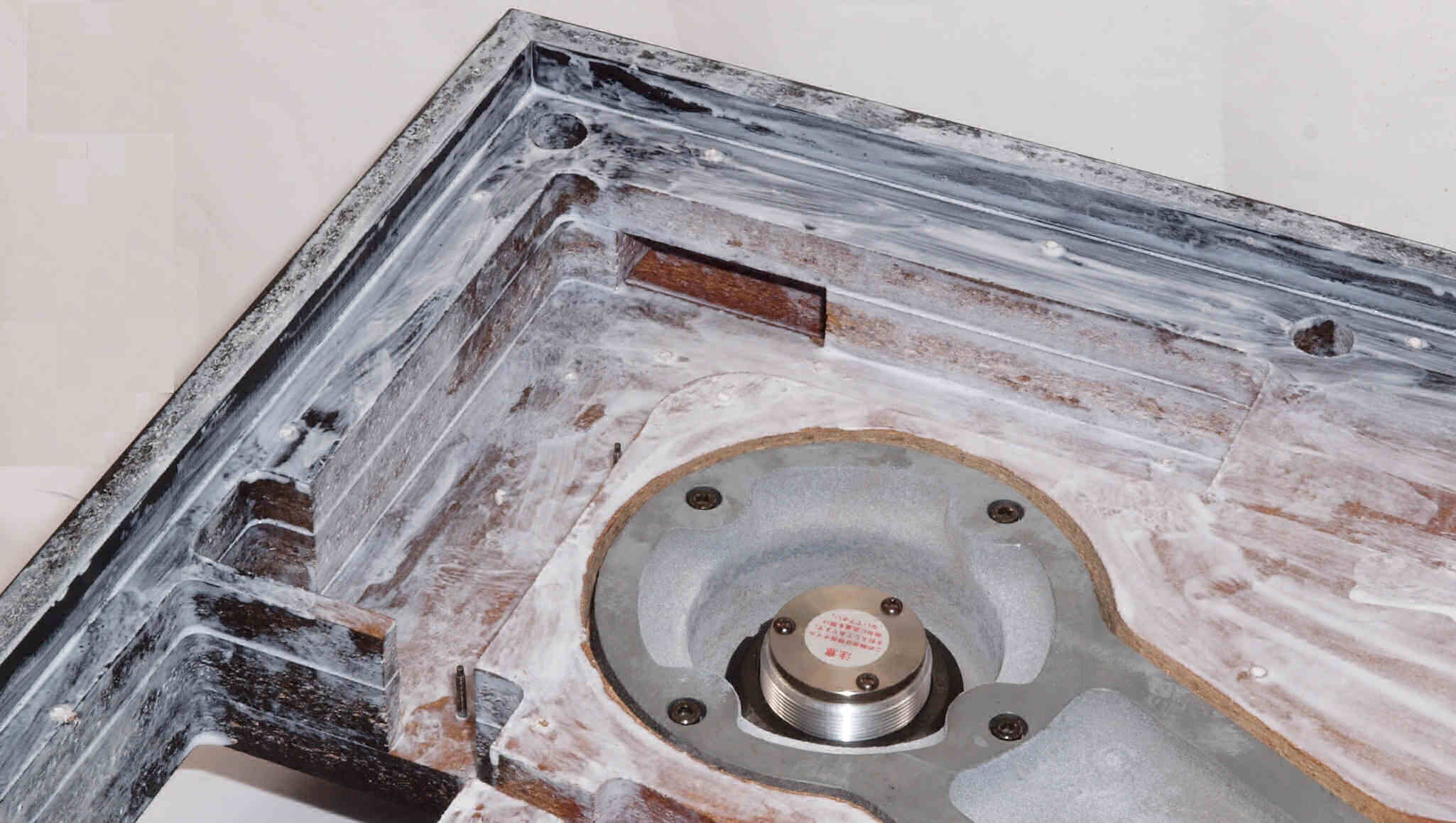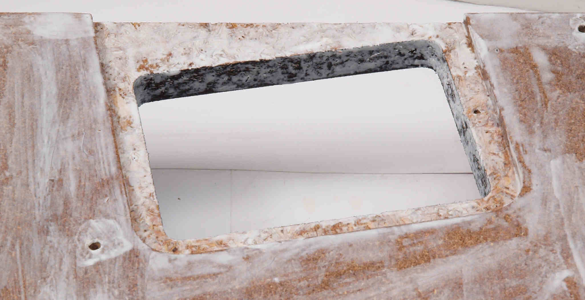 | W. 下蓋及び本体木部 修理状況。 画像をクリックすると、大きく(横幅2050ドット)表示されます。 W1. 修理前 アーム取り付け穴。 |