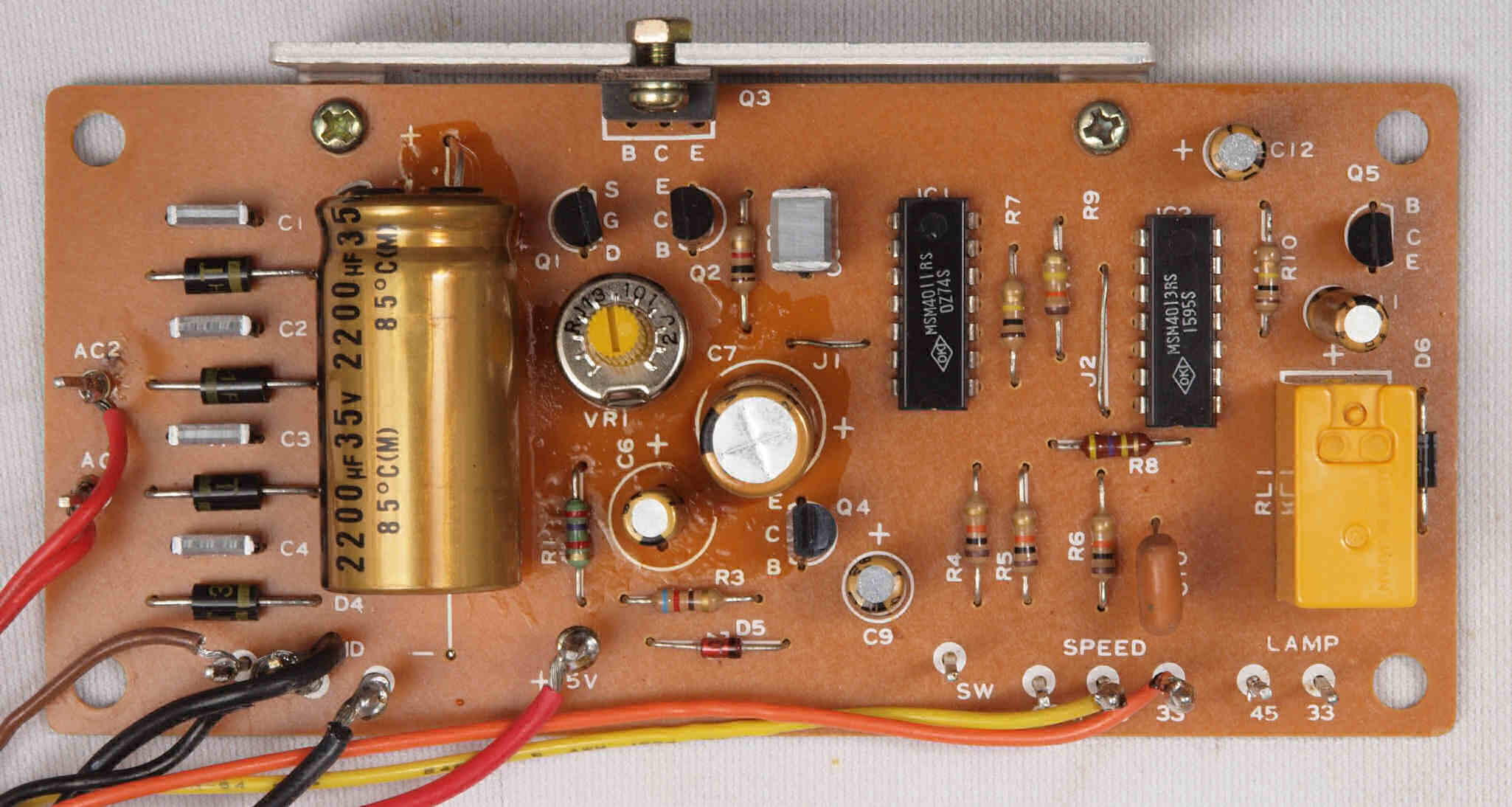 | C22. 修理後 電源・33/45切替基板 半固定VR1個、電解コンデンサー6個、製造中止で入手難のリレー1個交換 | ||||||||||||||||||||||||||||||||||||||||||||||||||||