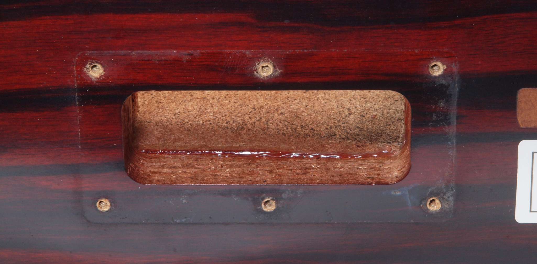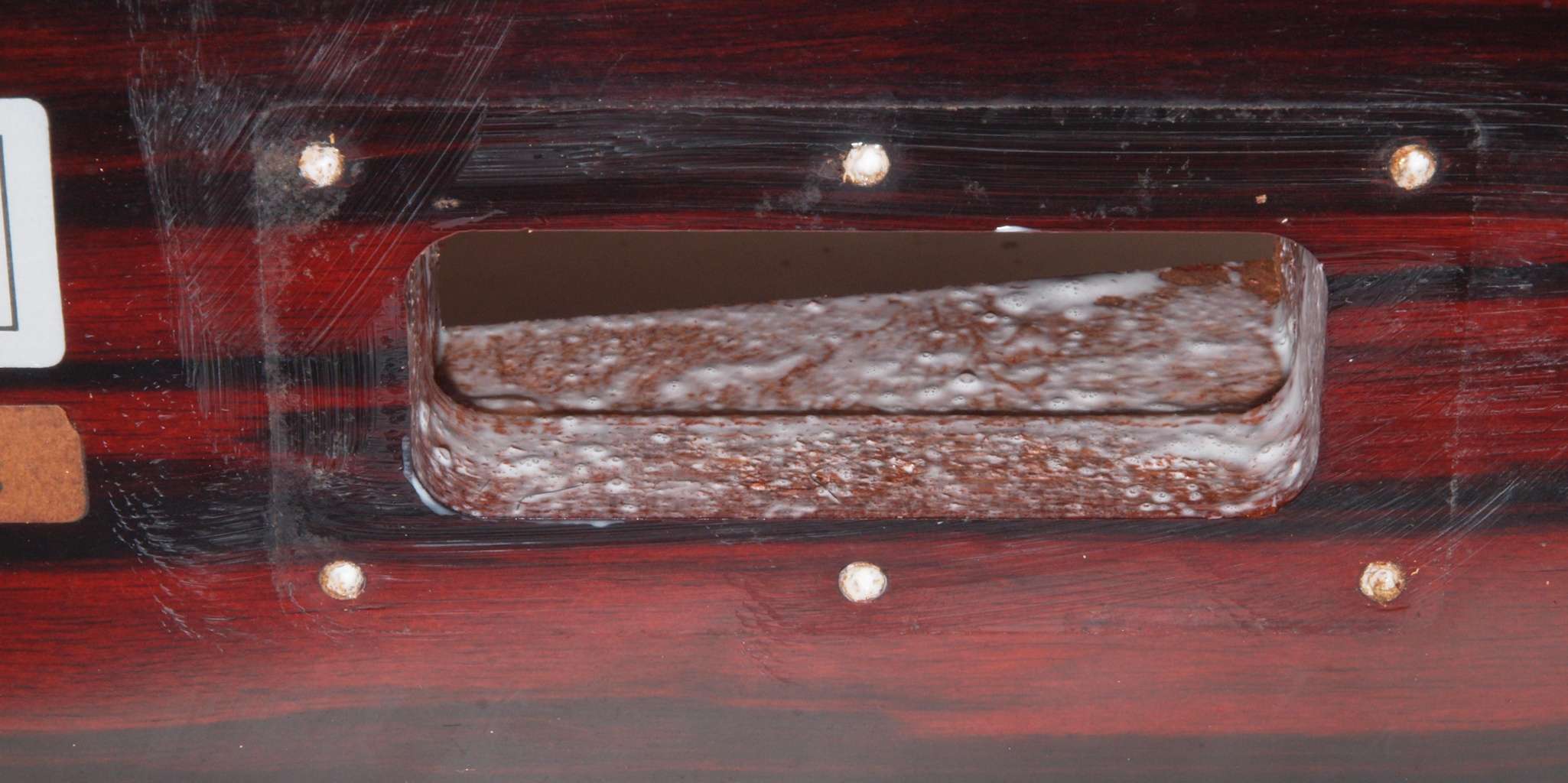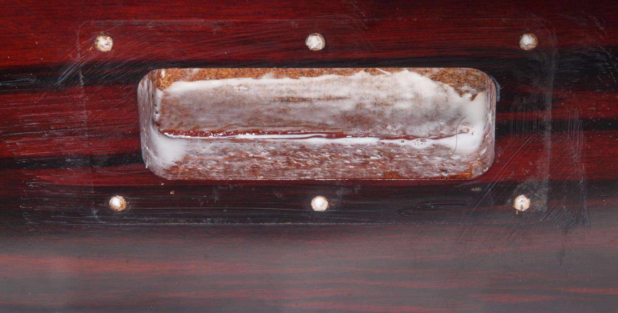 | W. 下蓋及び本体木部 修理状況。 画像をクリックすると、大きく(横幅2050ドット)表示されます。 W11. 修理前 アーム取り付け穴。 |