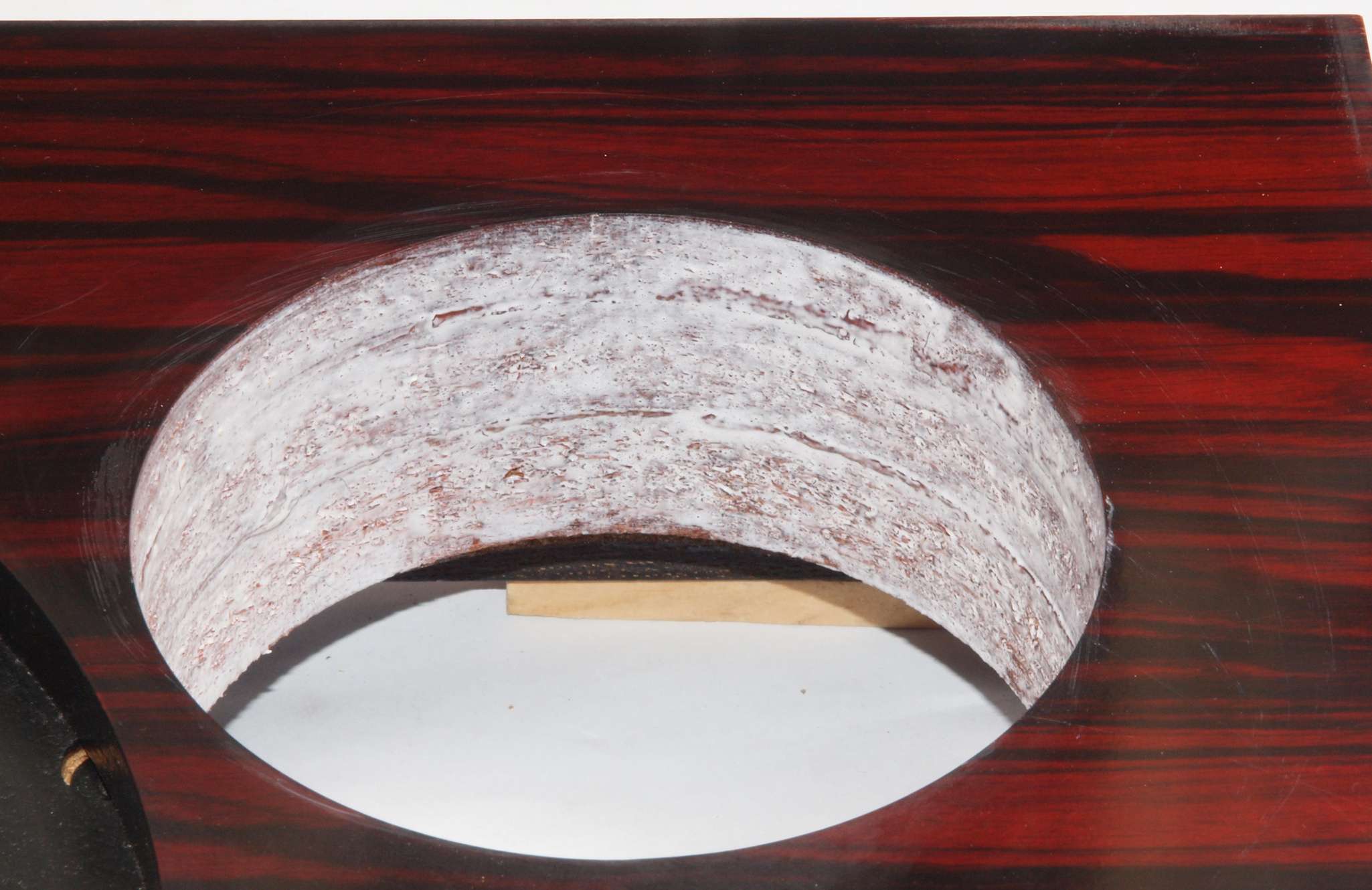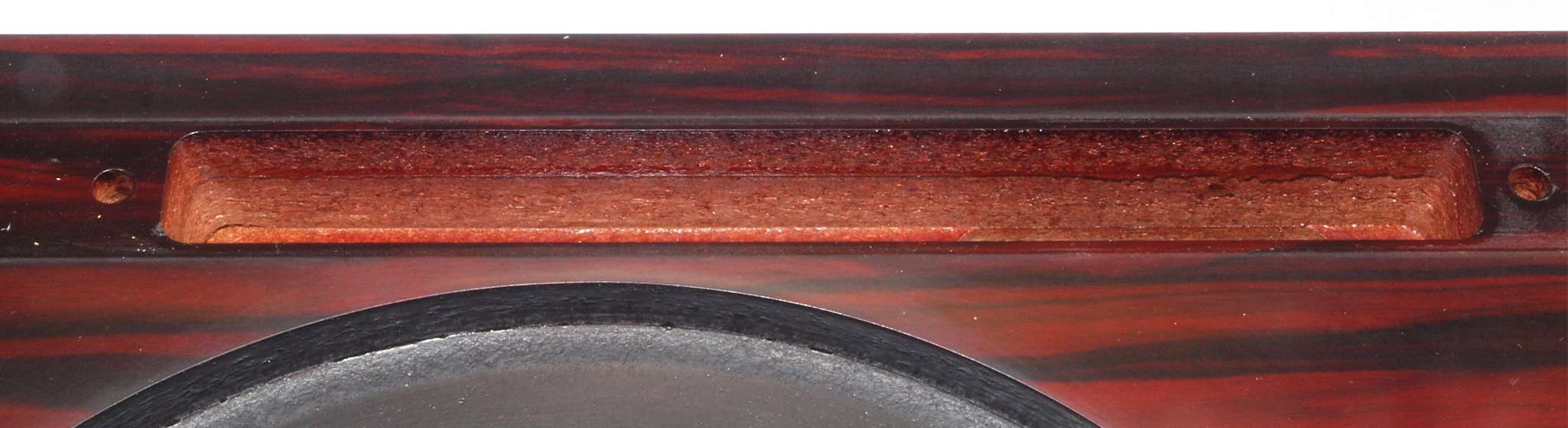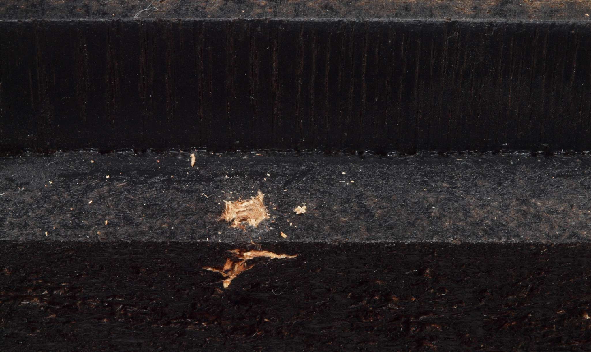 | W. 下蓋及び本体木部 修理状況。 画像をクリックすると、大きく(横幅2050ドット)表示されます。 W11. 修理前 アーム取り付け穴。 |