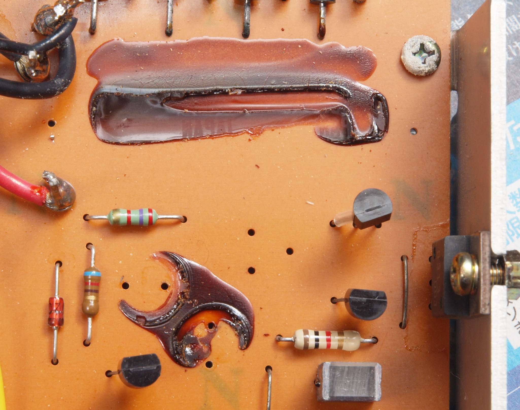 | C212. 修理中 電源・33/45切替基板。電解コンデンサー固定するトルエン溶媒の接着剤。 | ||||||||||||||||||||||||||||||||||||||||||||||||||||