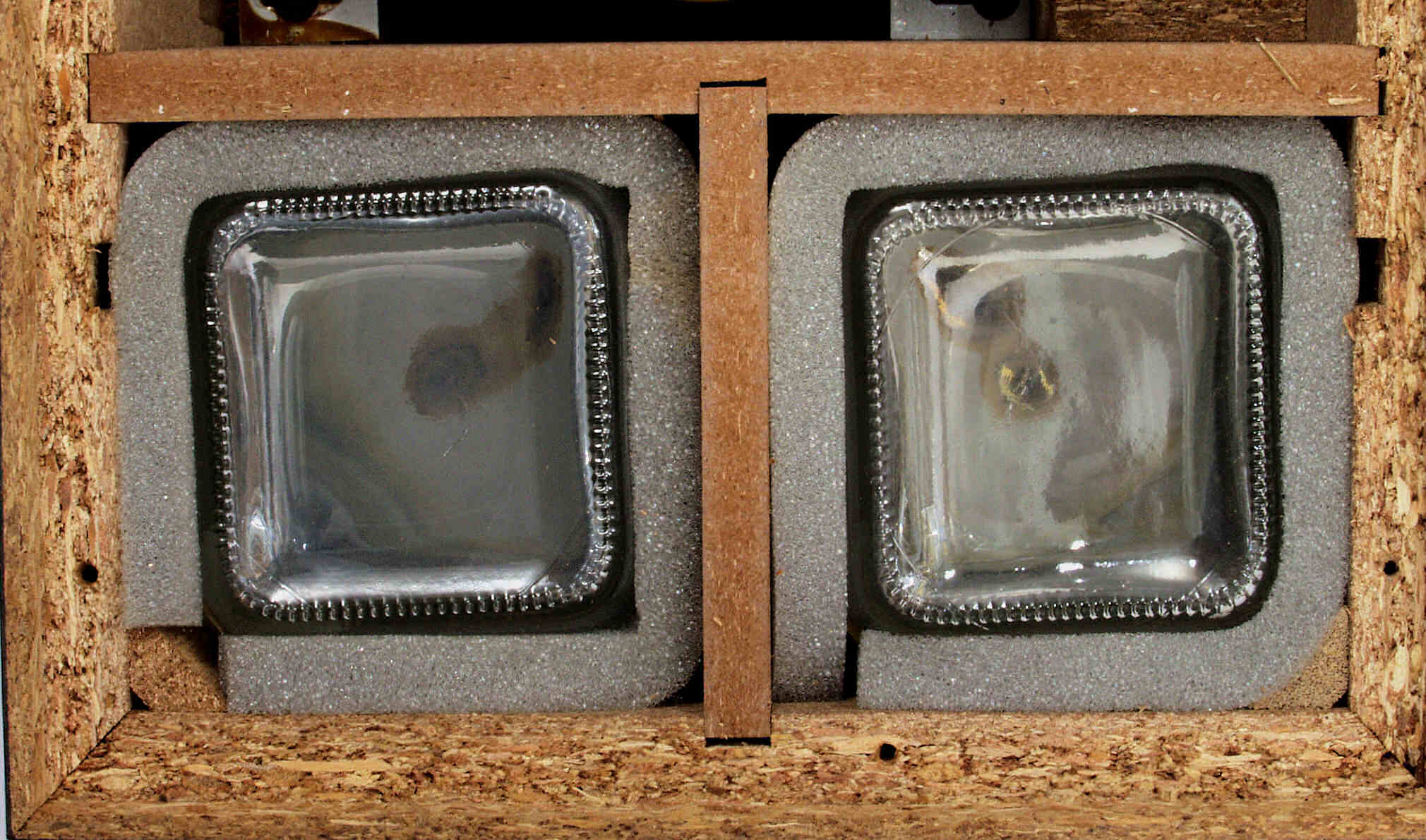 | A41. 外観 ダンボール箱内の下側クッション。 内部ユニット固定ネジが当たった跡がある。 | ||||||||||||