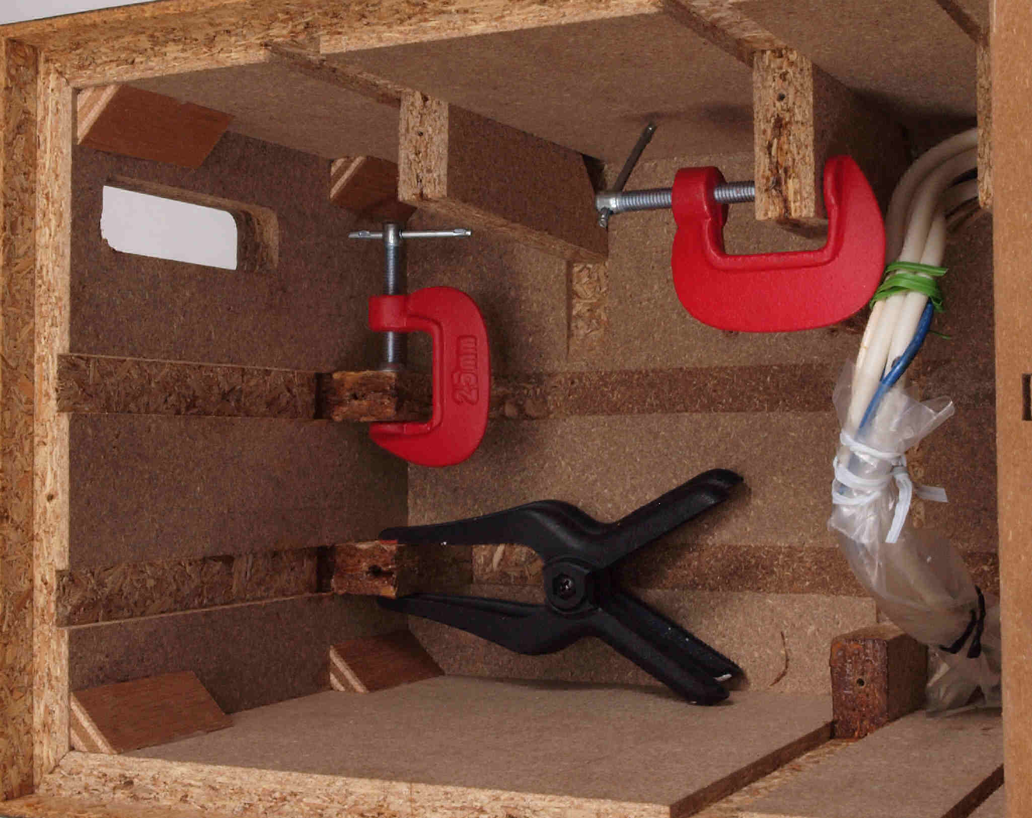 | C70. 修理中 木ネジで割れた、「ポンプ取り付け板」。割れの大きい取り付け材をシャコ万力で締めて接着する。 | ||||||||||||