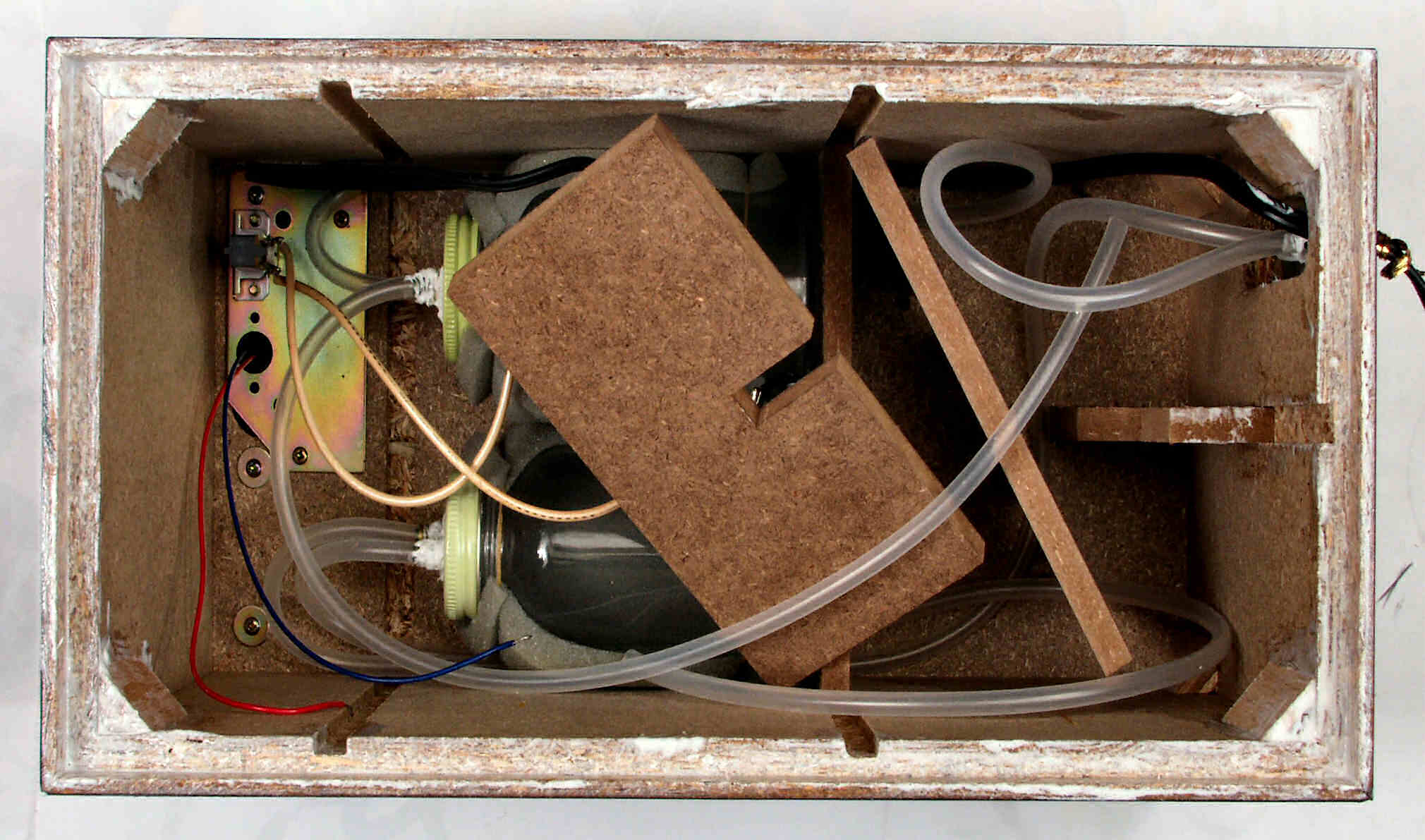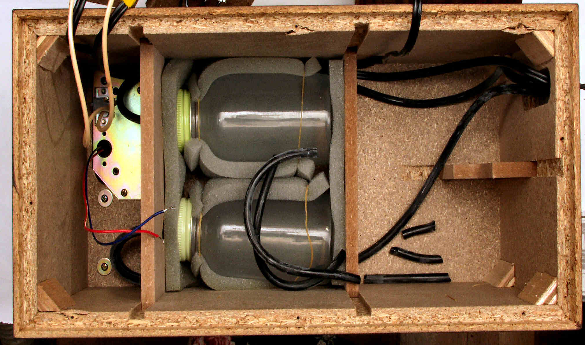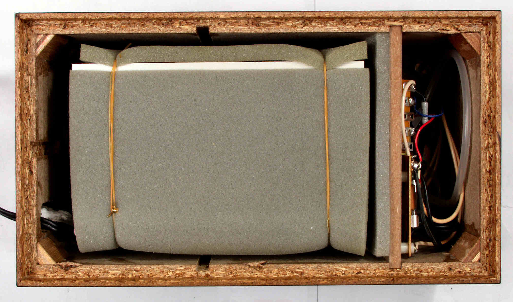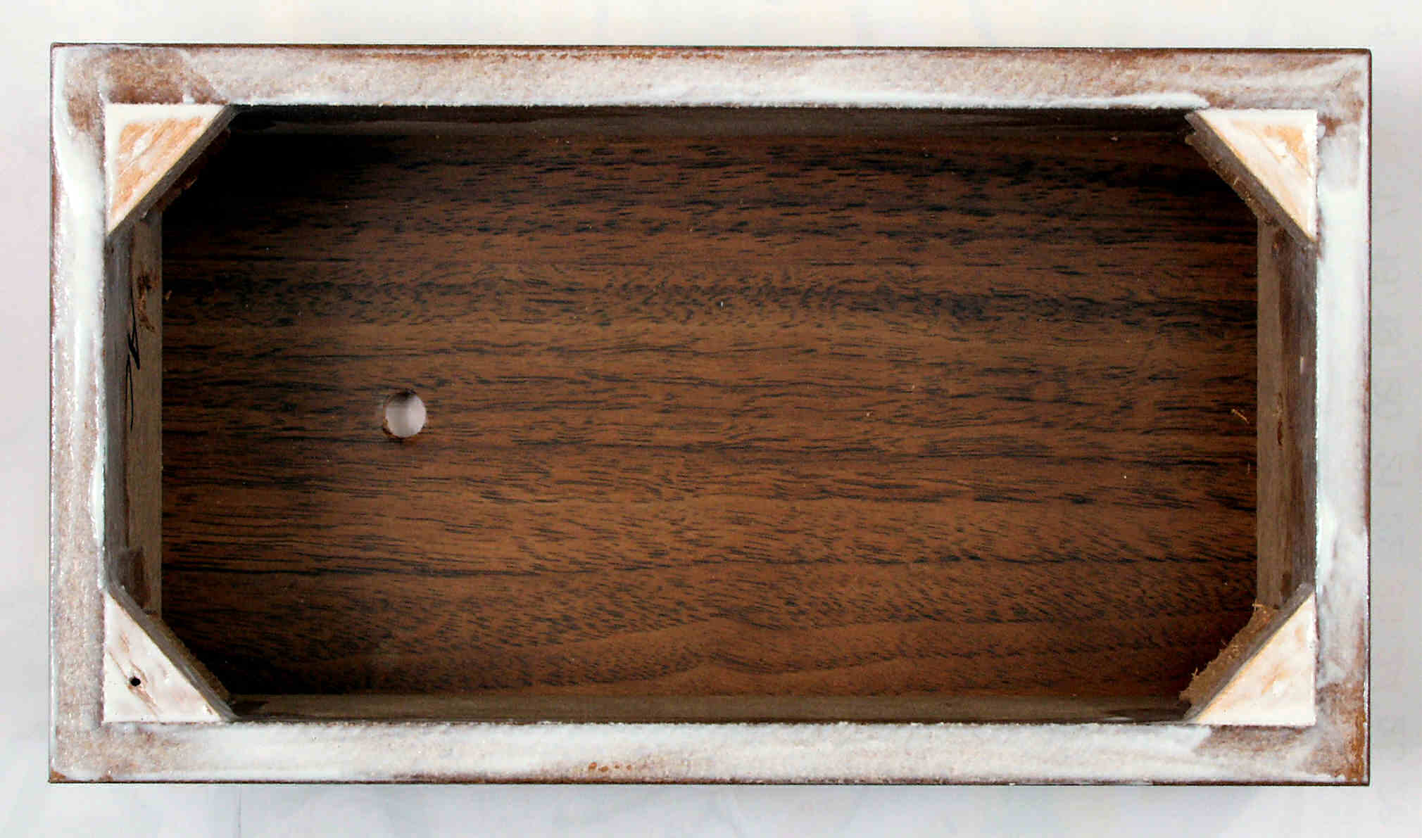 | C. 修理状況 C1A. 修理中、ケース。圧縮材の糊がきかなくなり始めているので、ボンドを塗る。 又、何回もネジを開閉したので、ネジ穴が大きくなり、効かない。 |