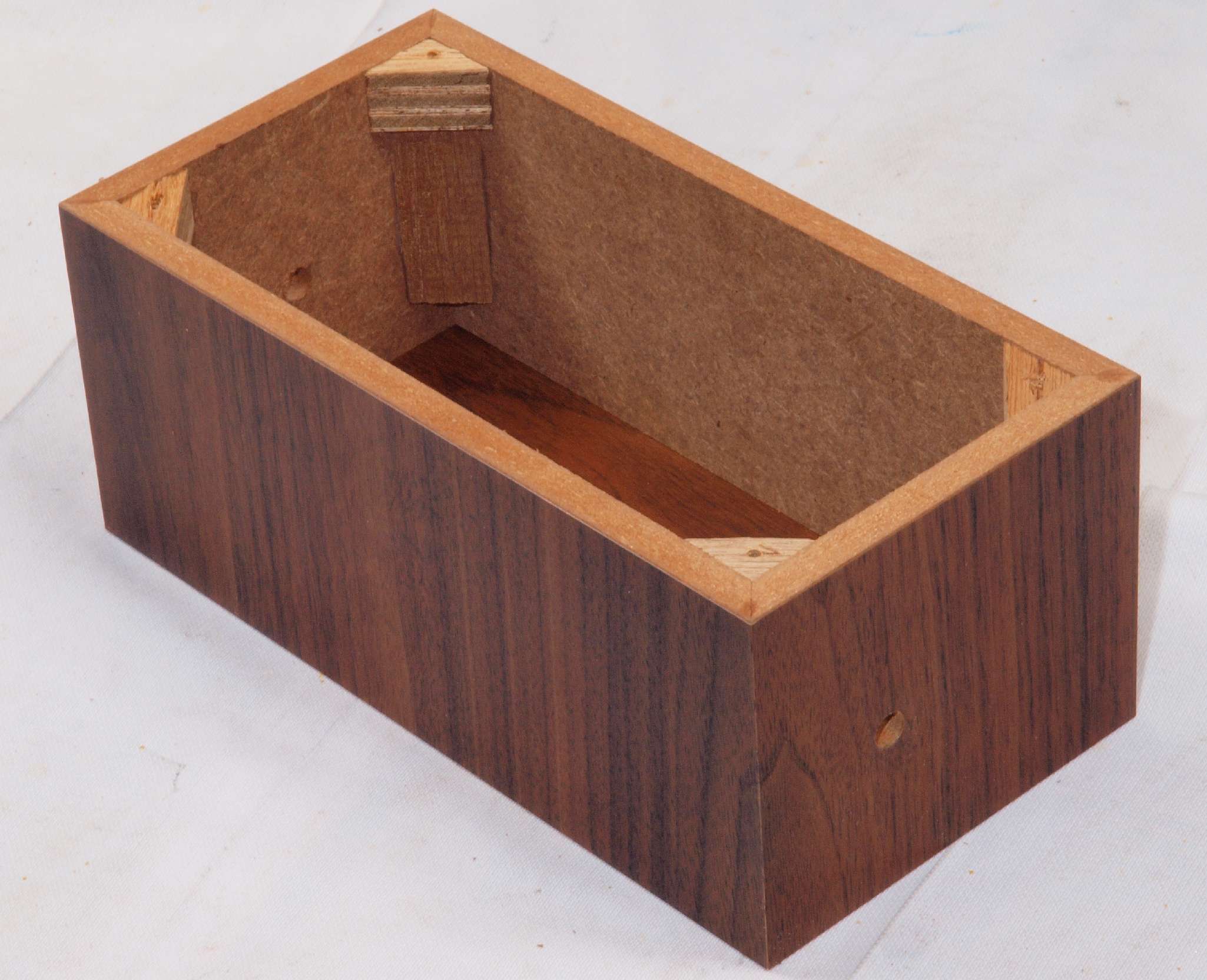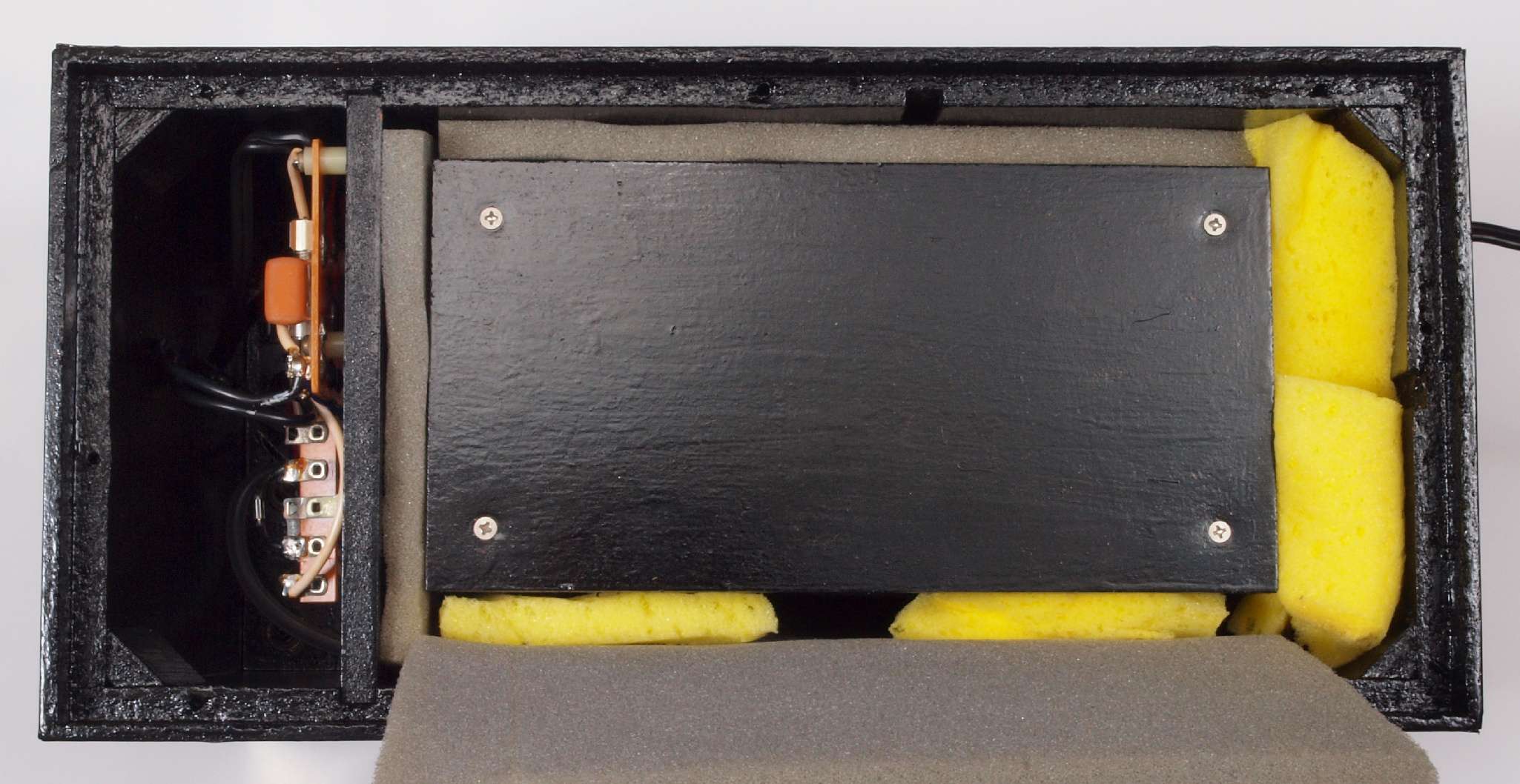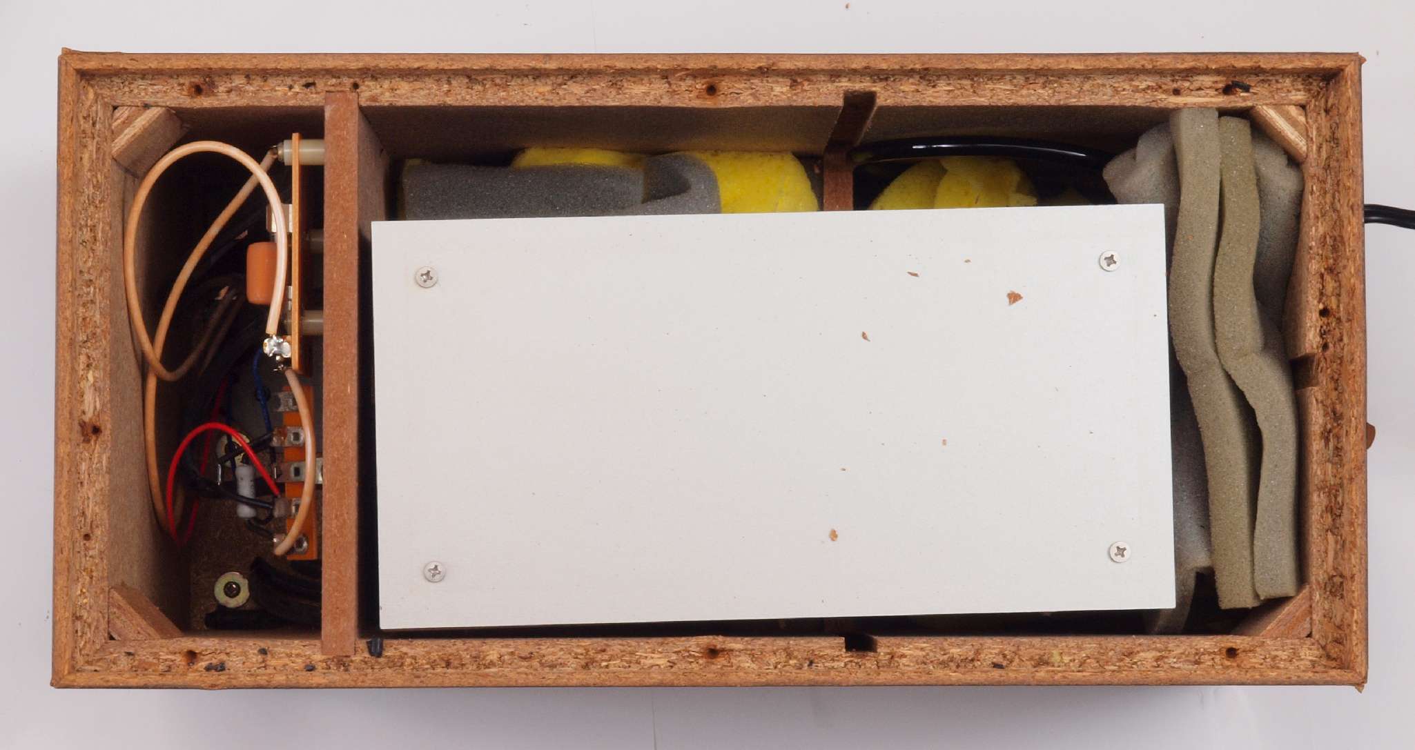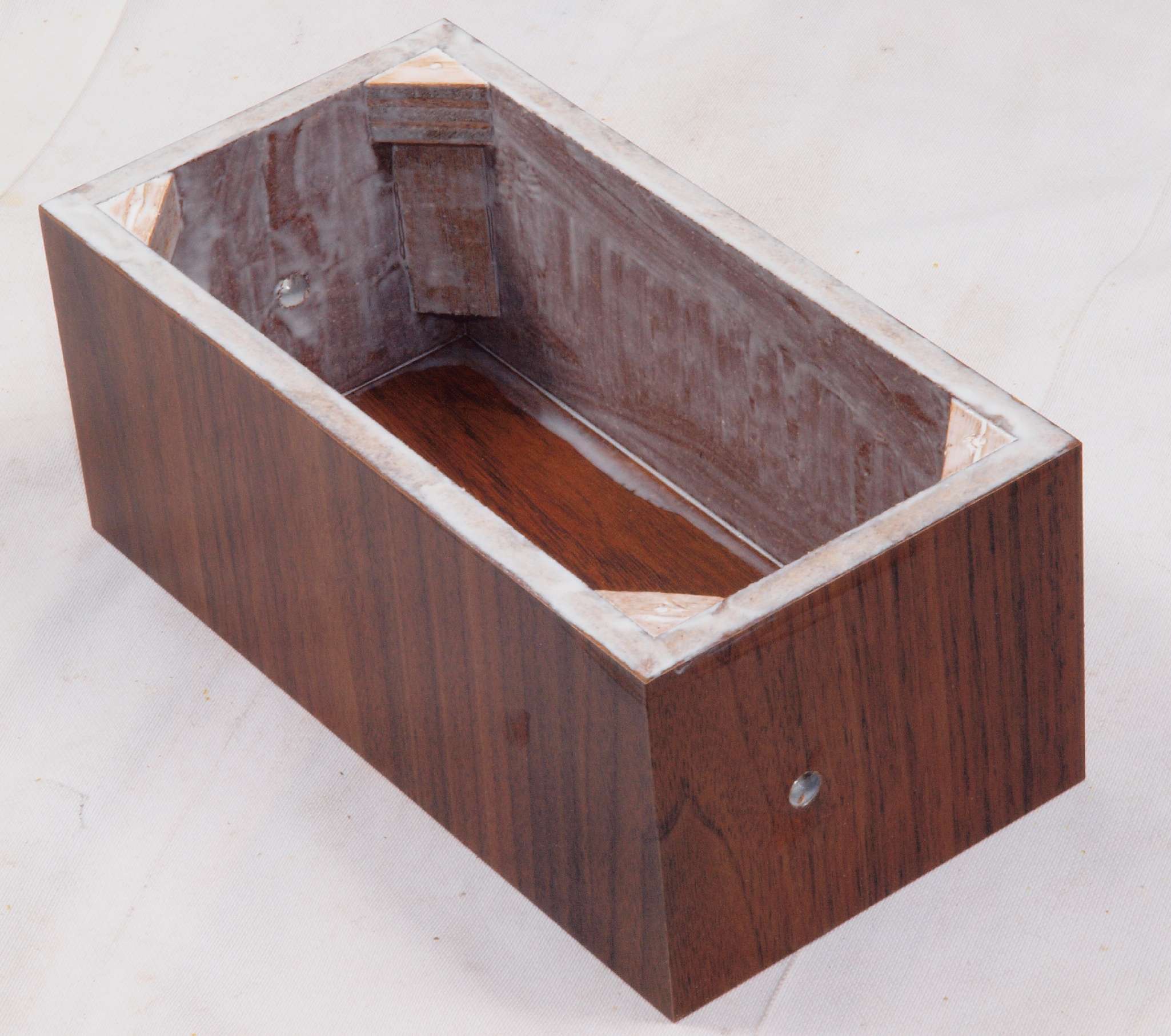 | C88. 修理中 ポンプケース木箱後左。圧縮板にボンドを塗って固める。 |
