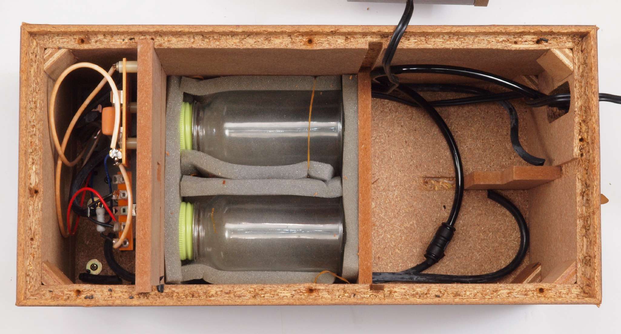 | C82. 修理中 ポンプケース木箱。圧縮板にボンドを塗って固める。 |