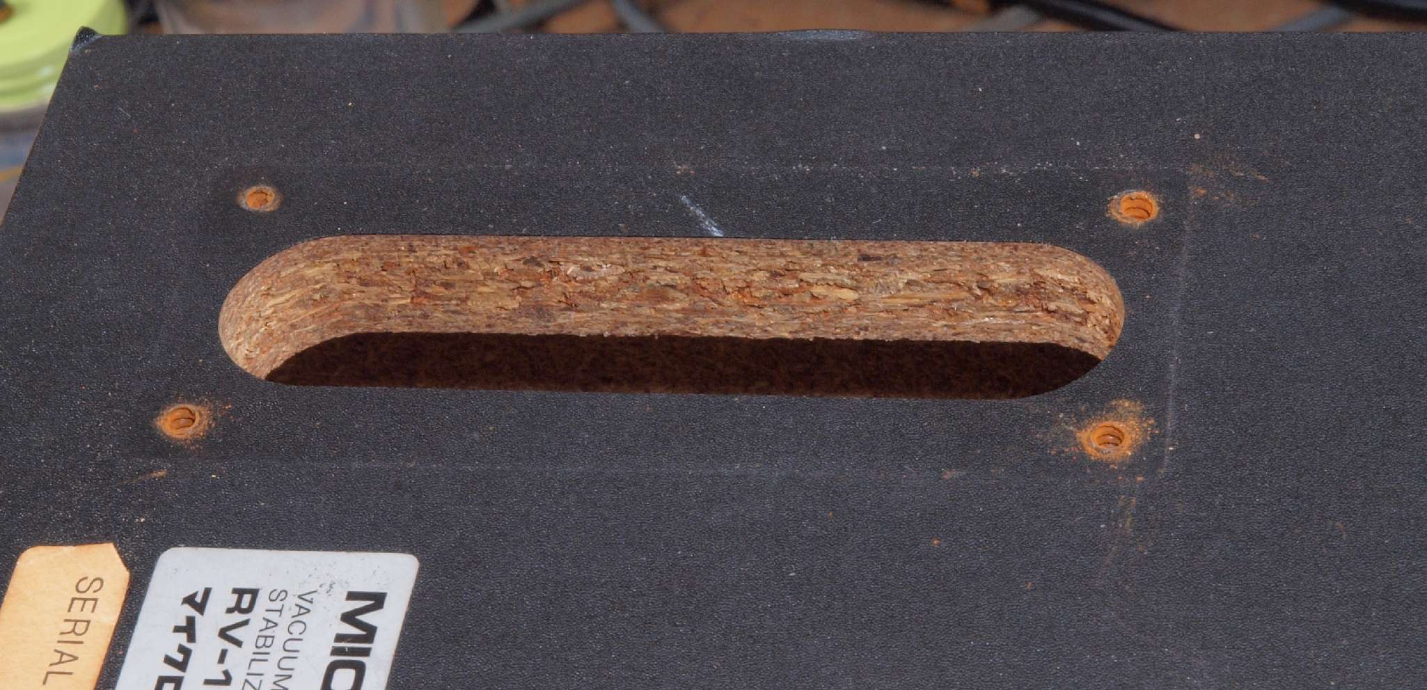 | C42. 修理前 電源入り口・吐出口端子取り付け穴。 ボンドを染みこませる。 |