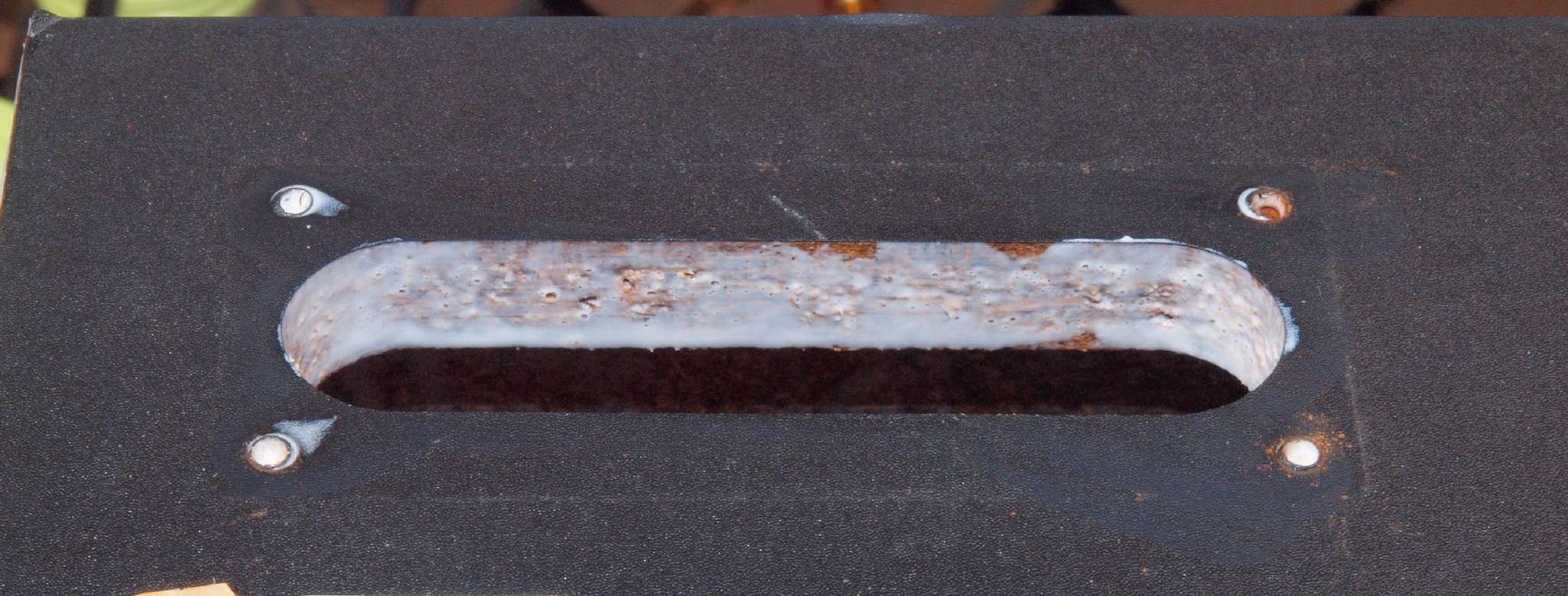| C43. 修理後 電源入り口・吐出口端子取り付け穴。 さらに、塗装する。 |