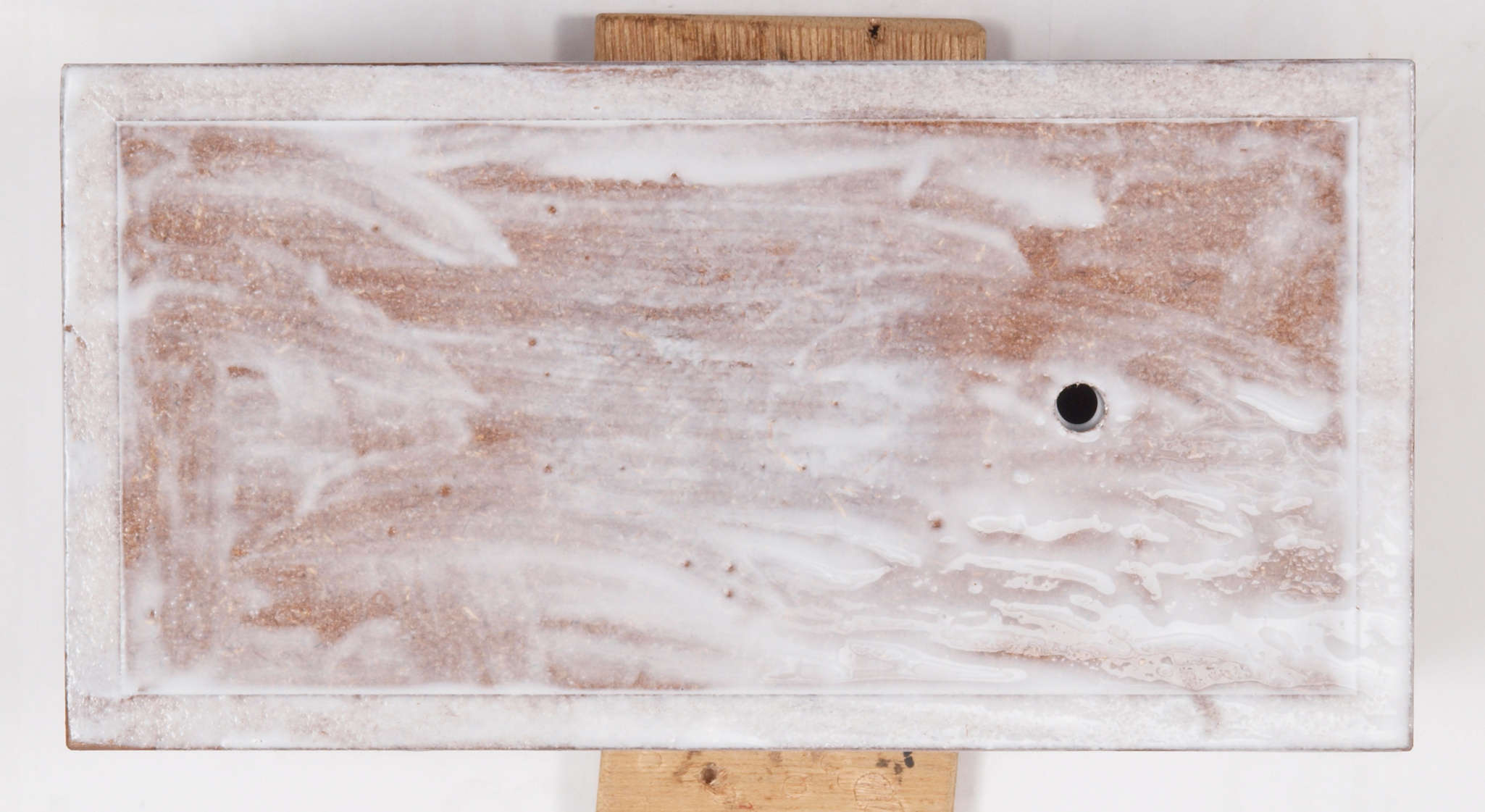 | CA2. 修理中 ポンプケース木箱上蓋表、、ボンドを染みこませる。 |