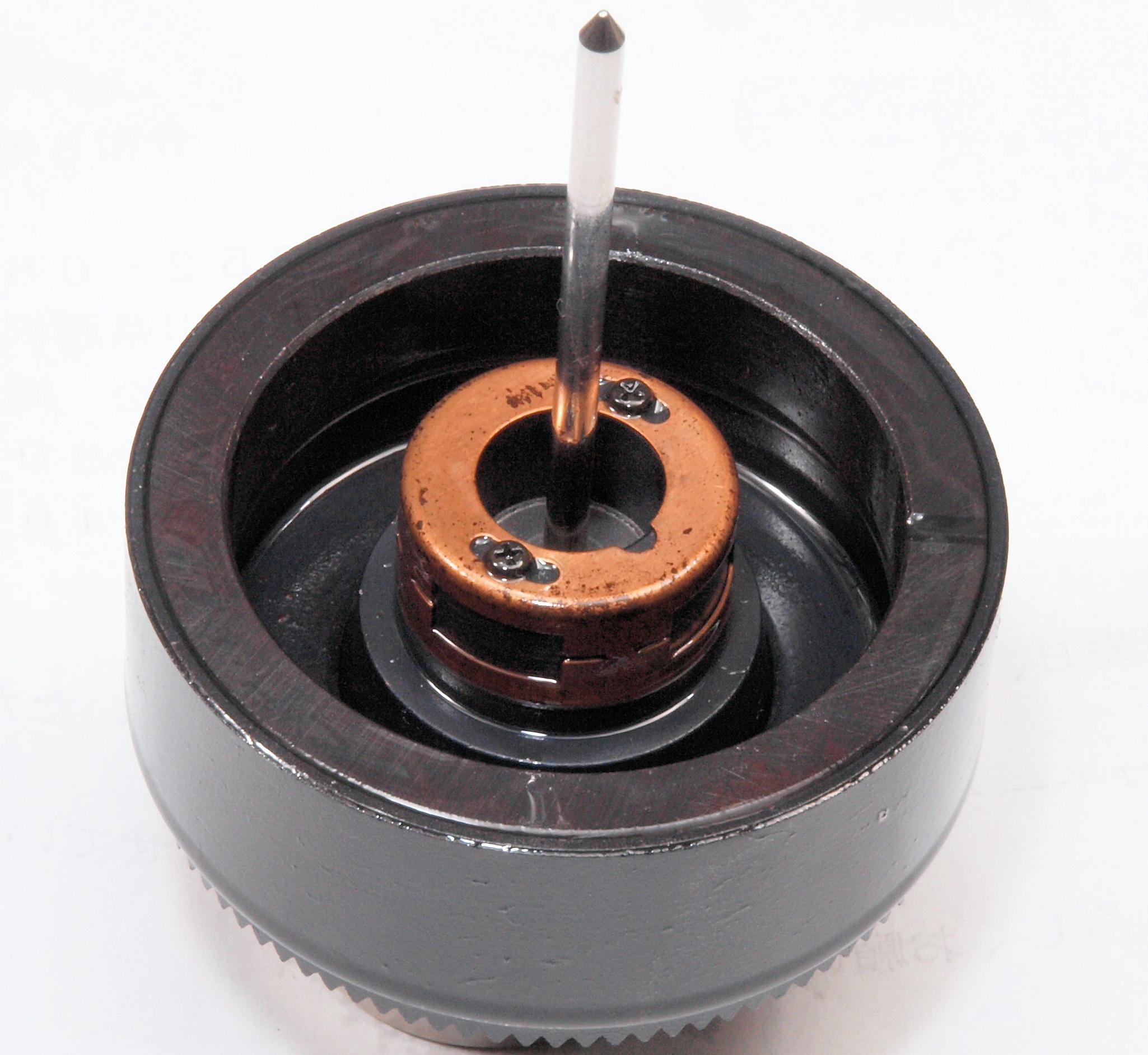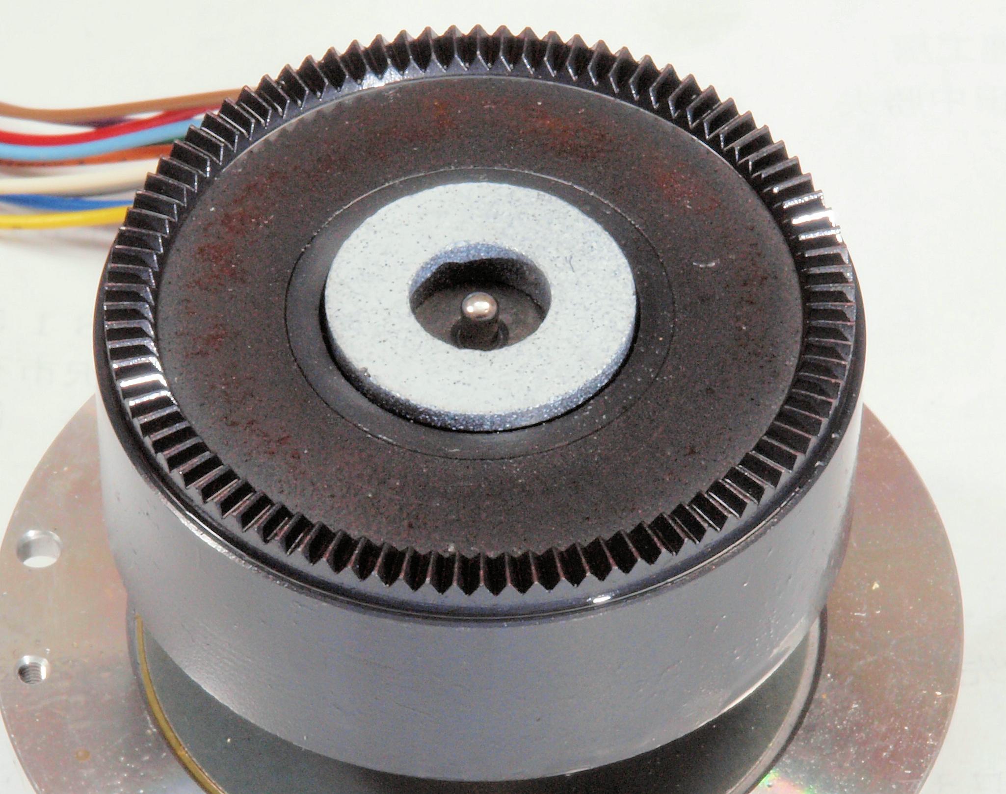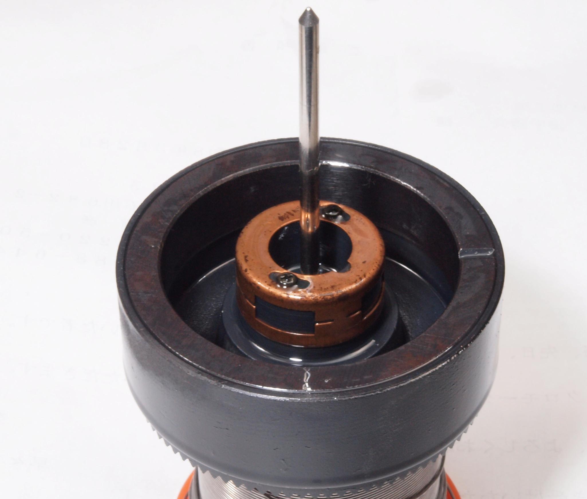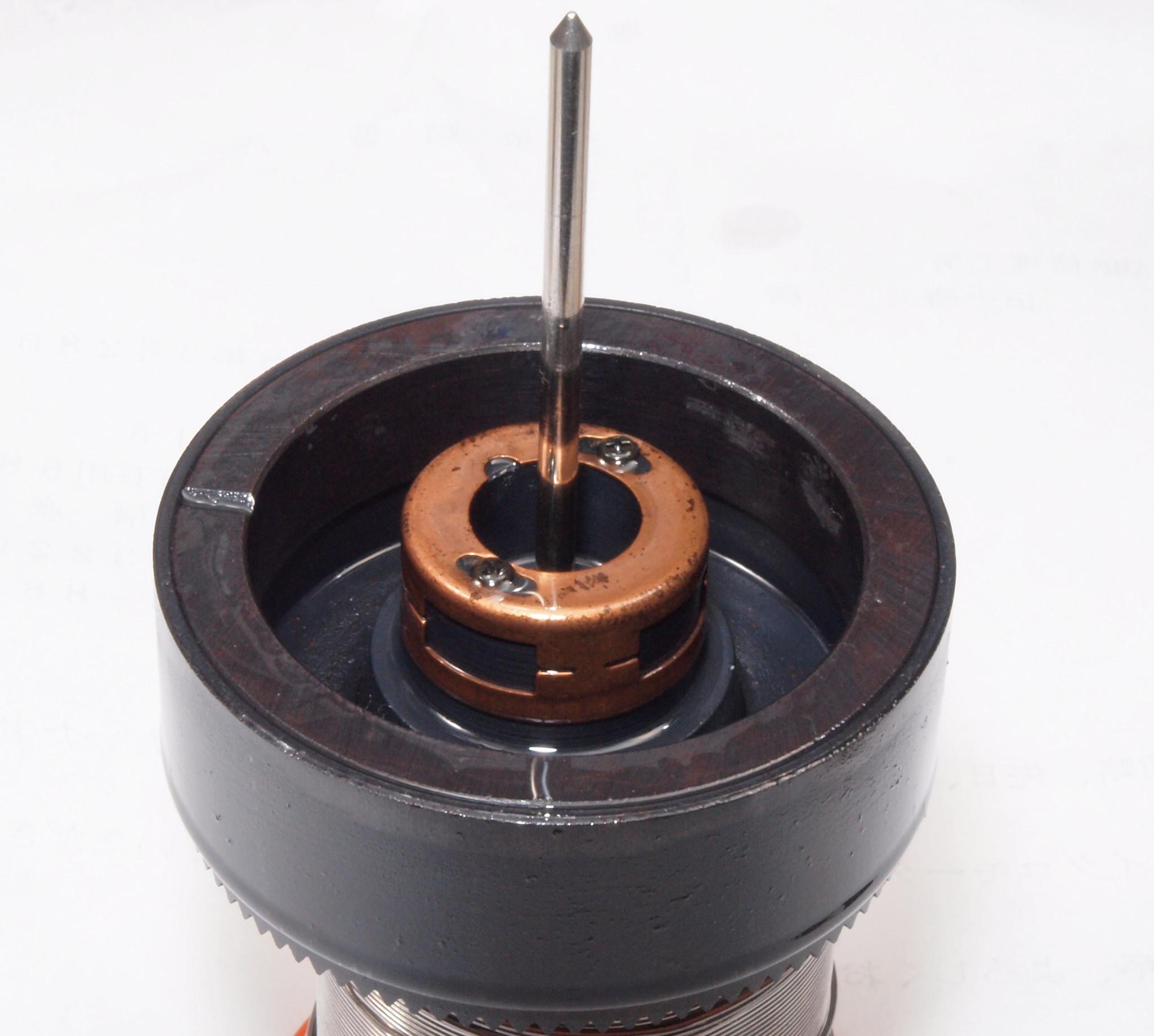 C64. 修理中、モータ回転子上側軸受を下から見る。 熱の為、油分が黒化。