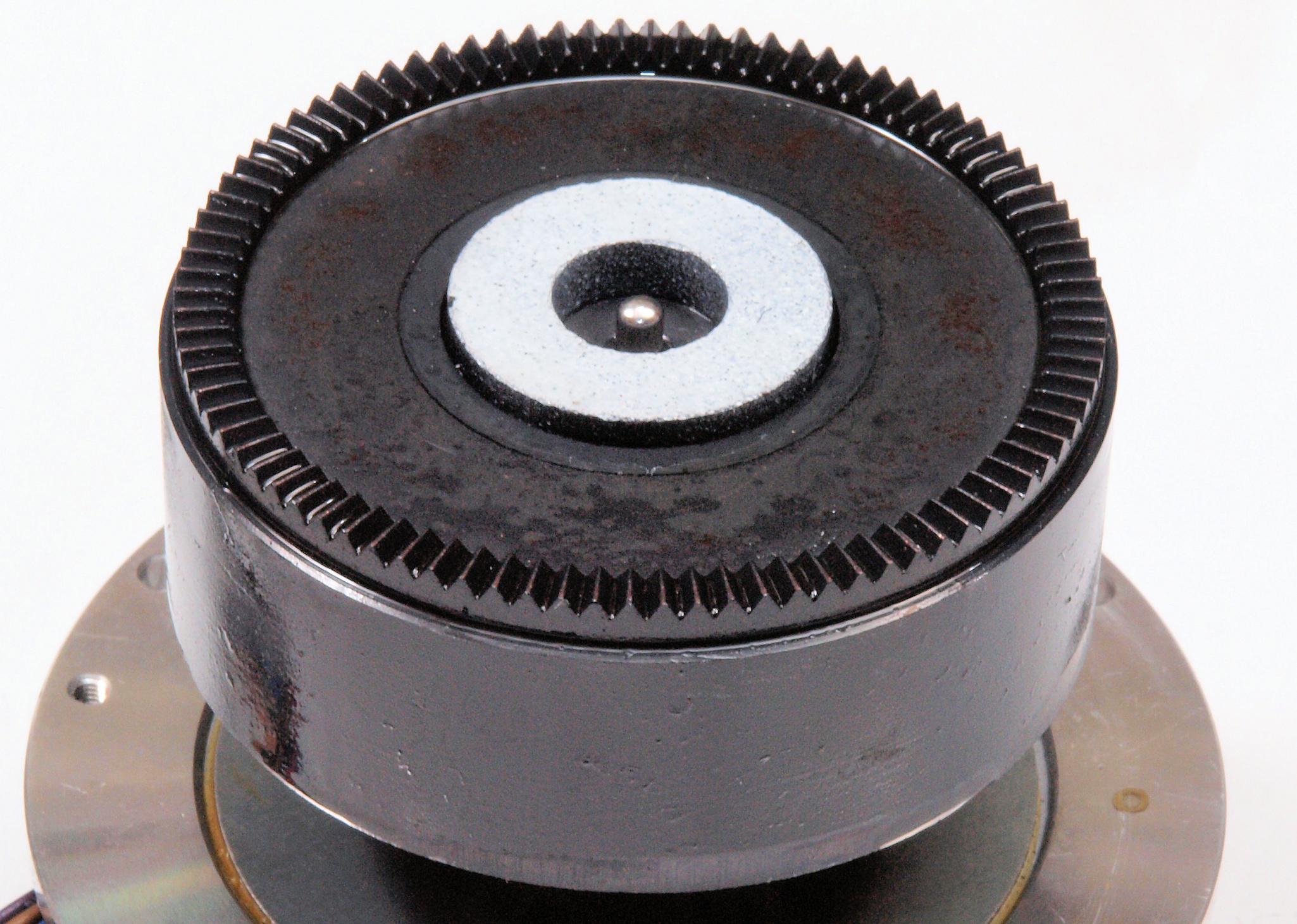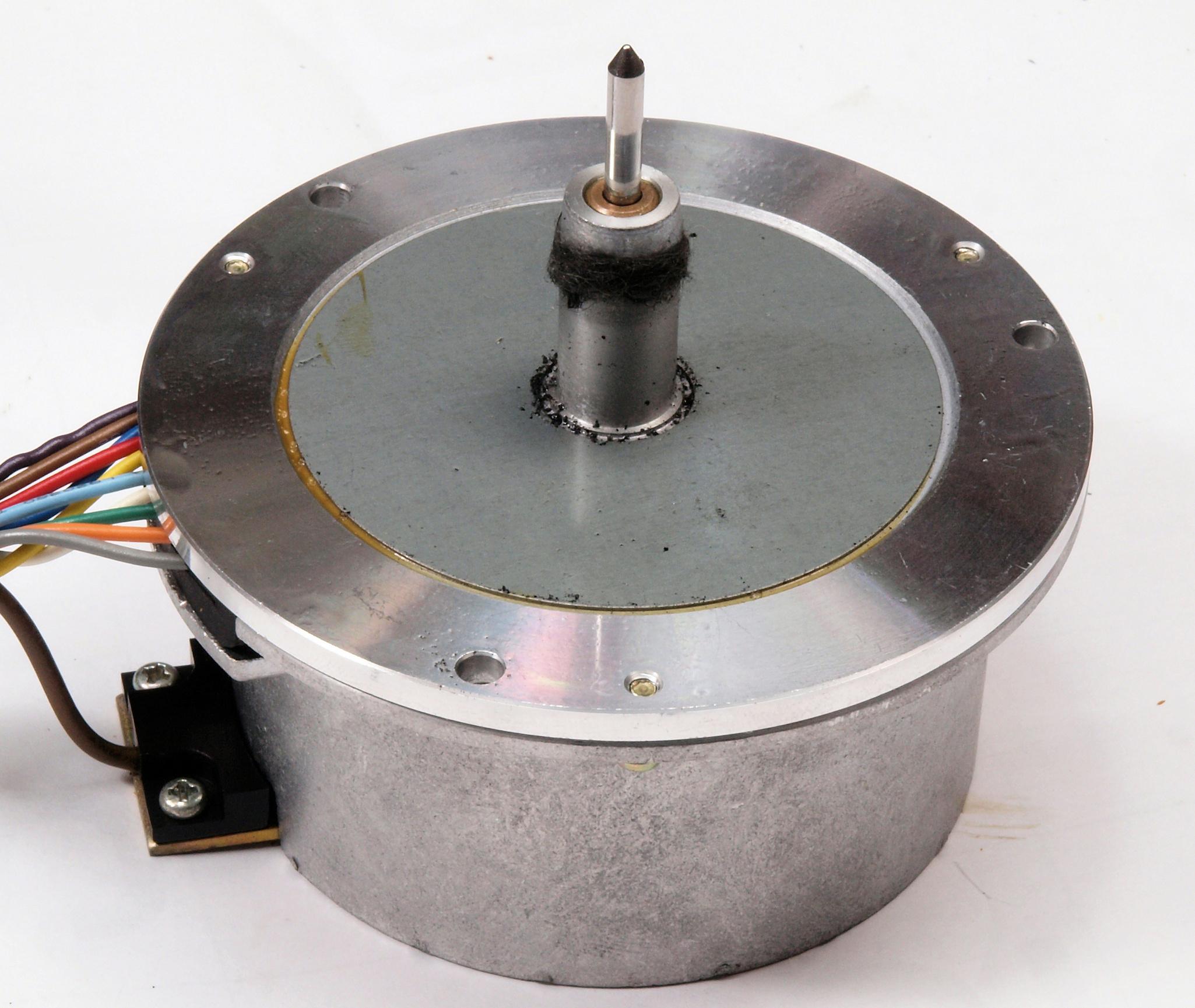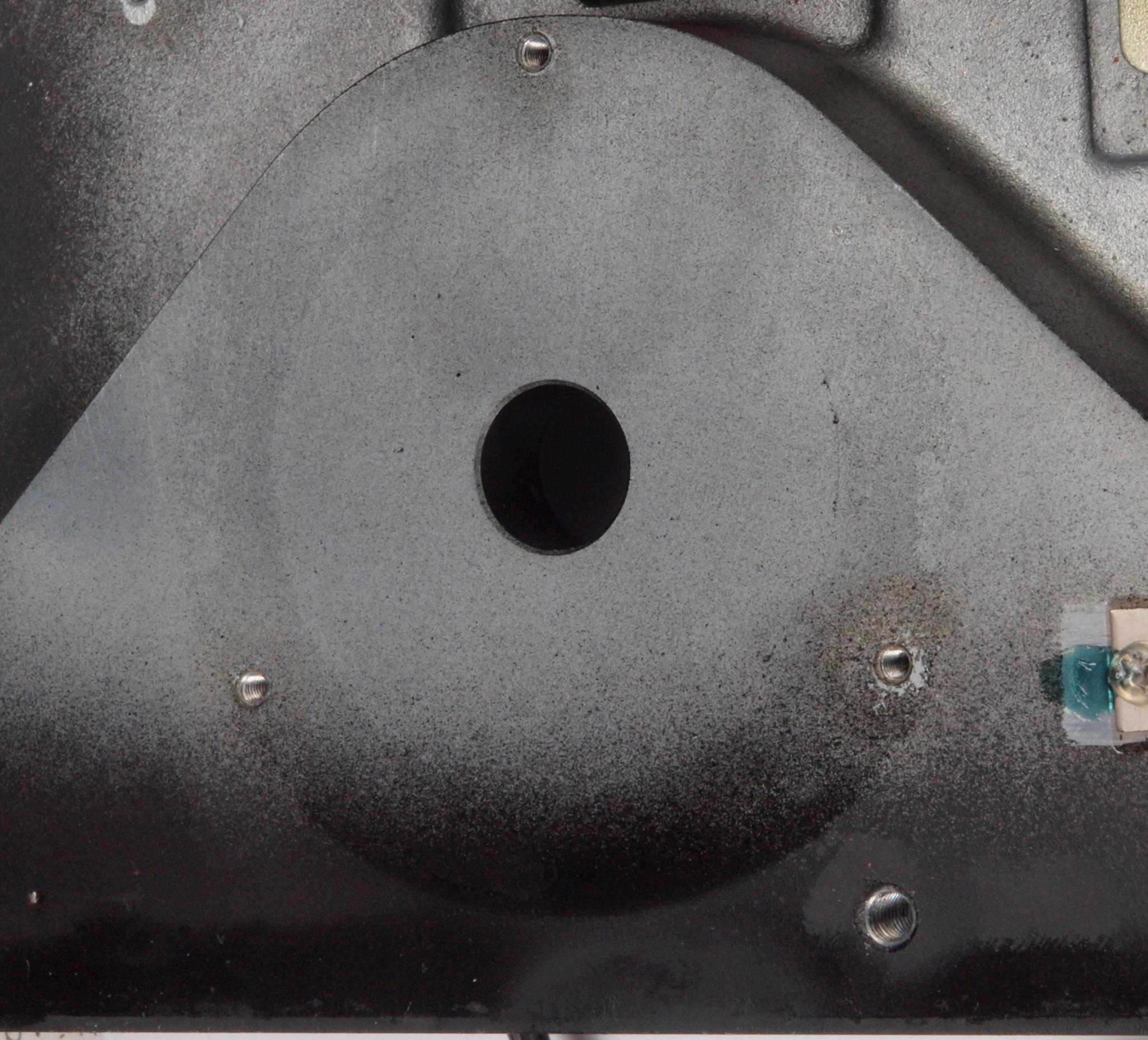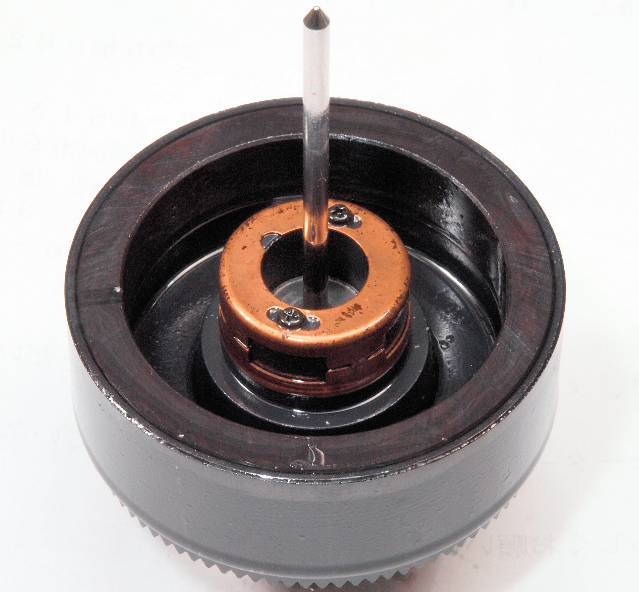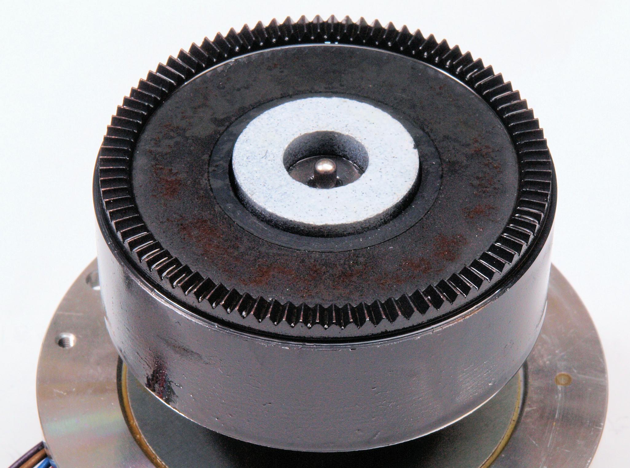 C64. 修理中、モータ回転子上側軸受を下から見る。 熱の為、油分が黒化。