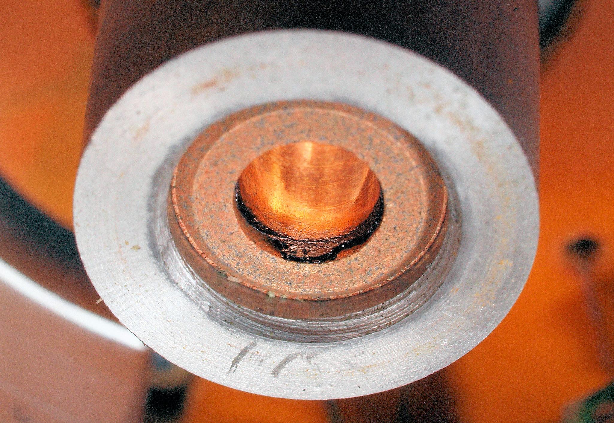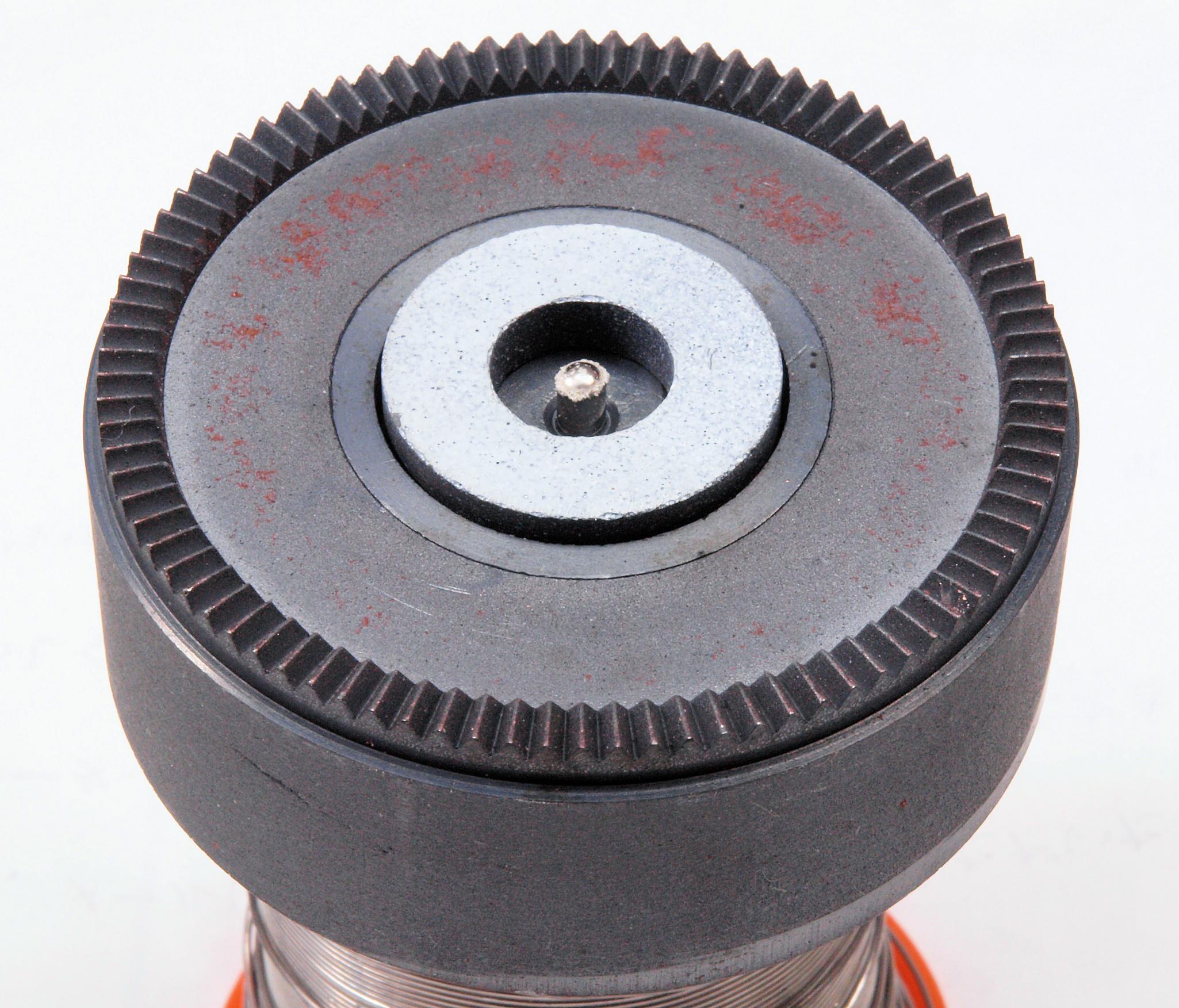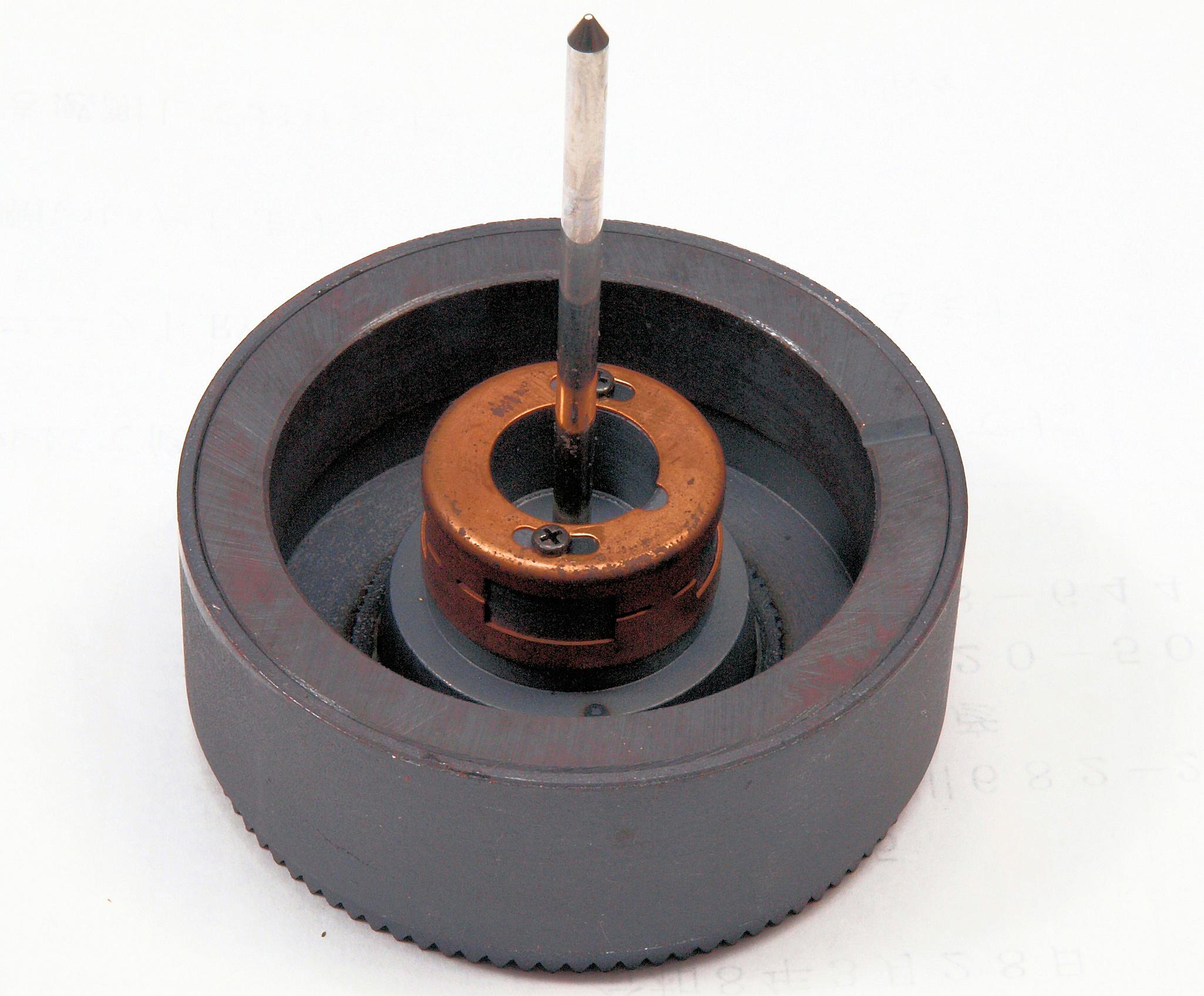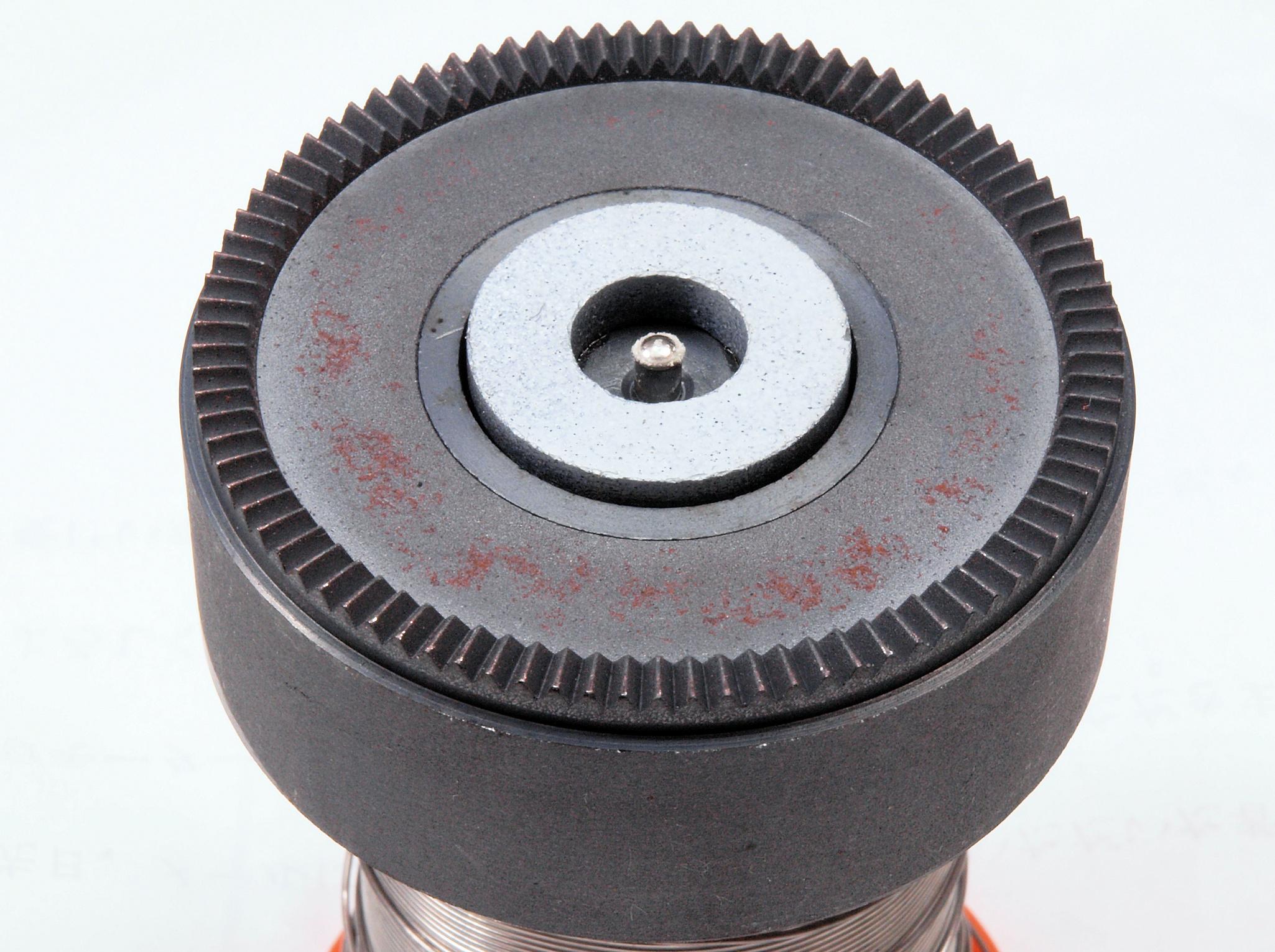 C64. 修理中、モータ回転子上側軸受を下から見る。 熱の為、油分が黒化。