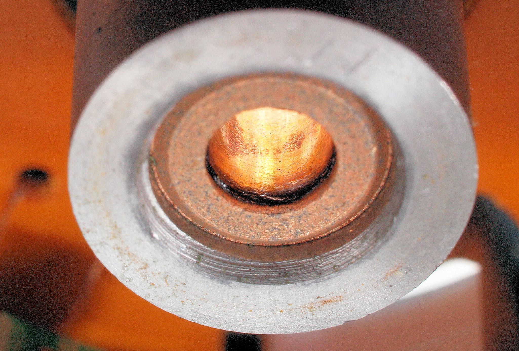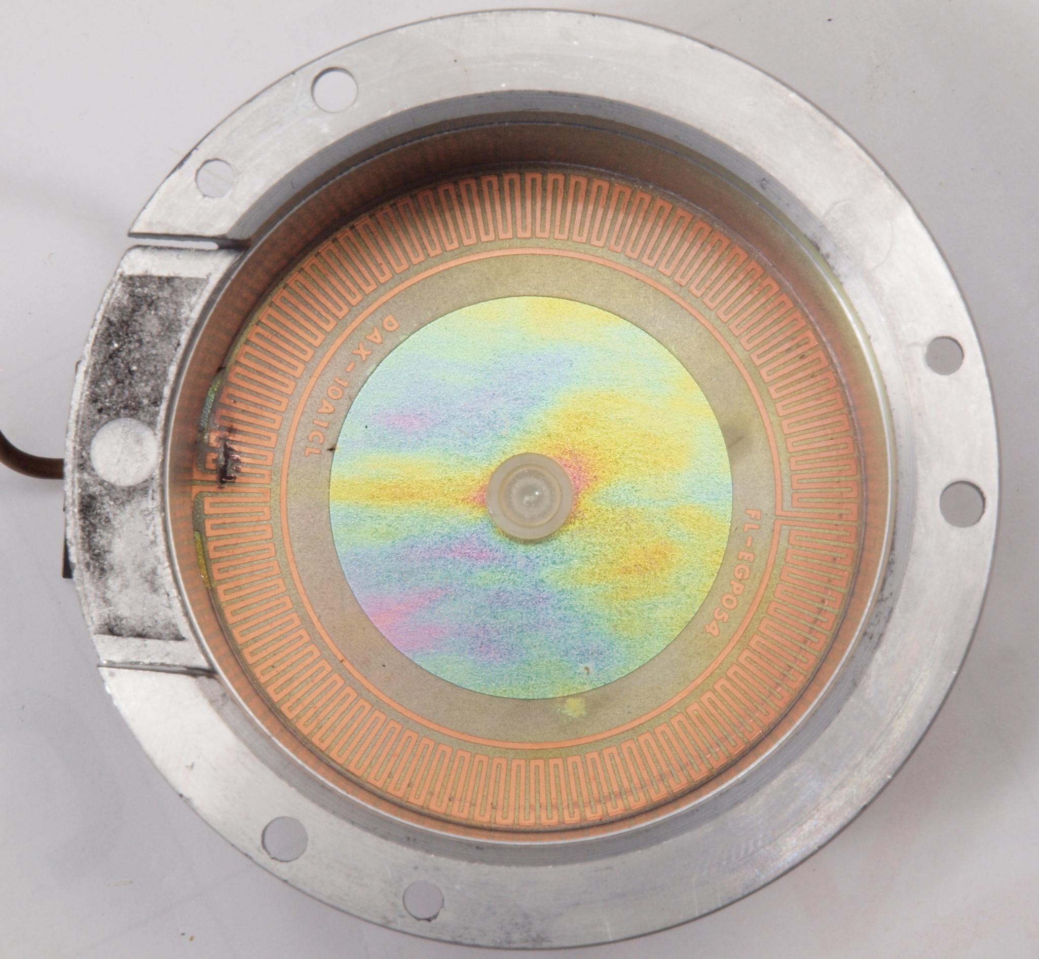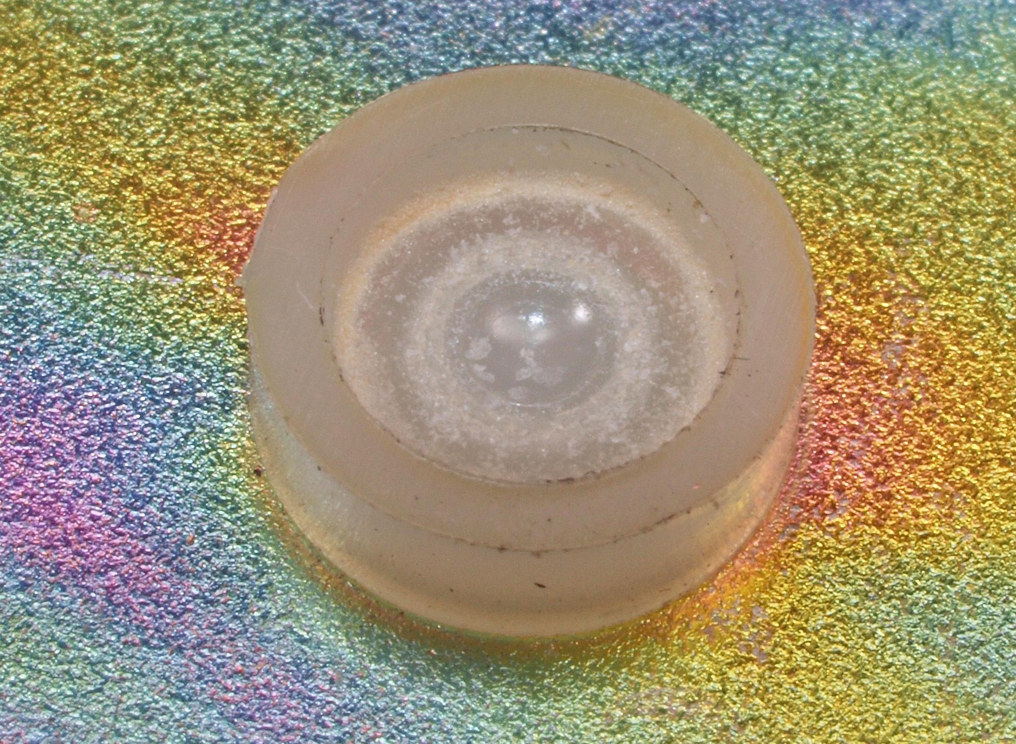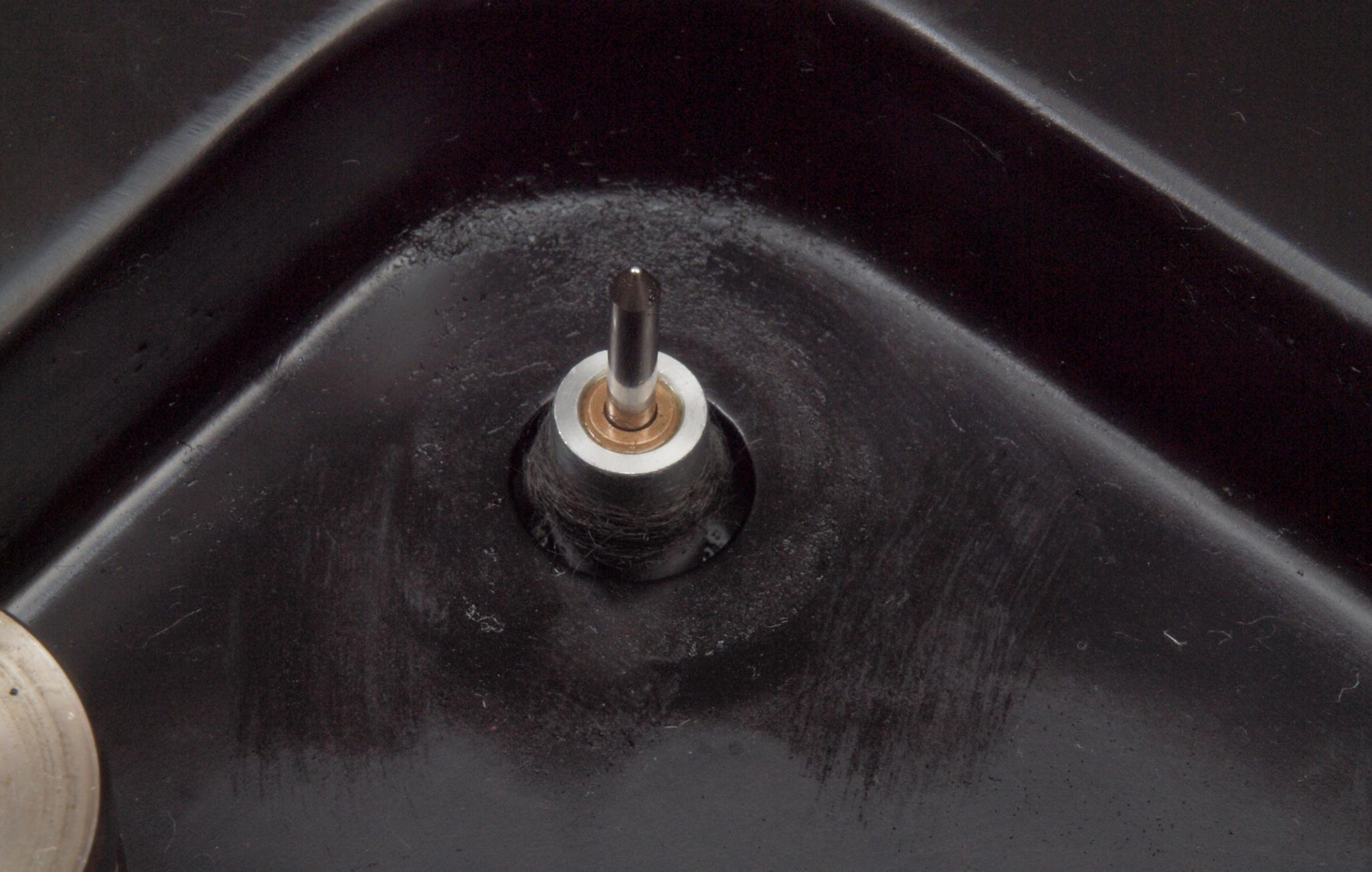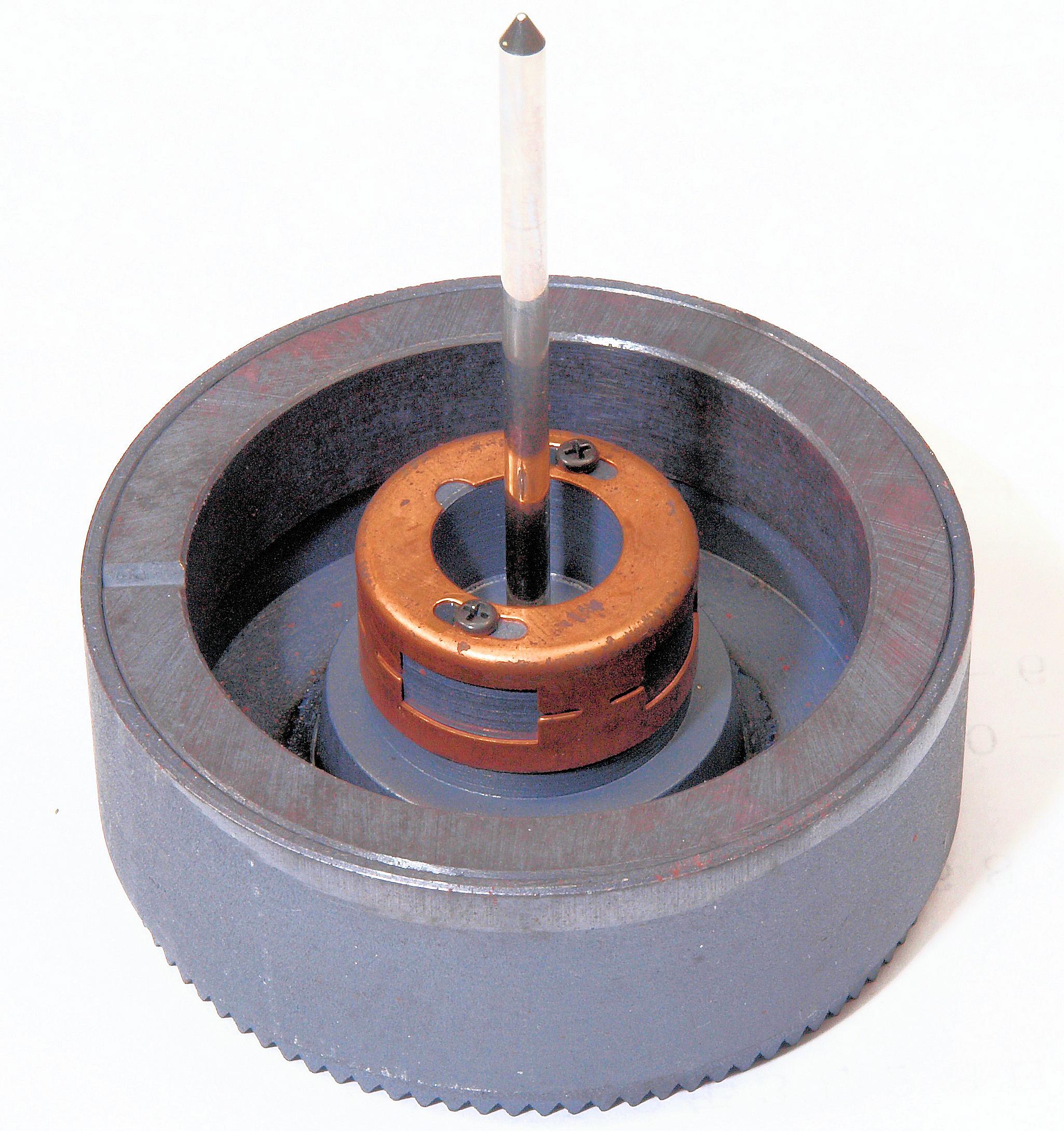 C64. 修理中、モータ回転子上側軸受を下から見る。 熱の為、油分が黒化。