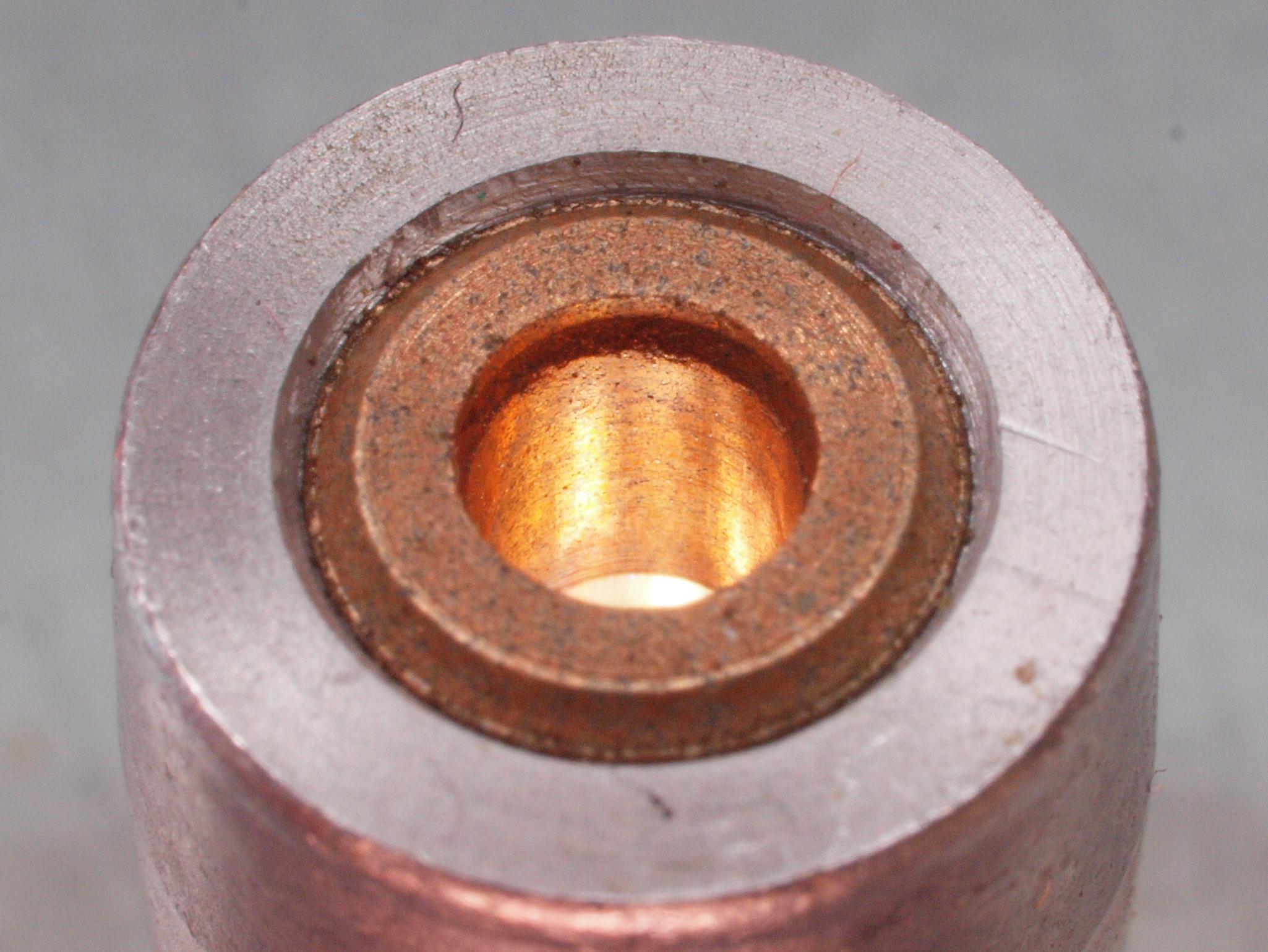 C65. 修理中、モータ回転子上側軸受を下から見る、反対側。 熱の為、油分が黒化。