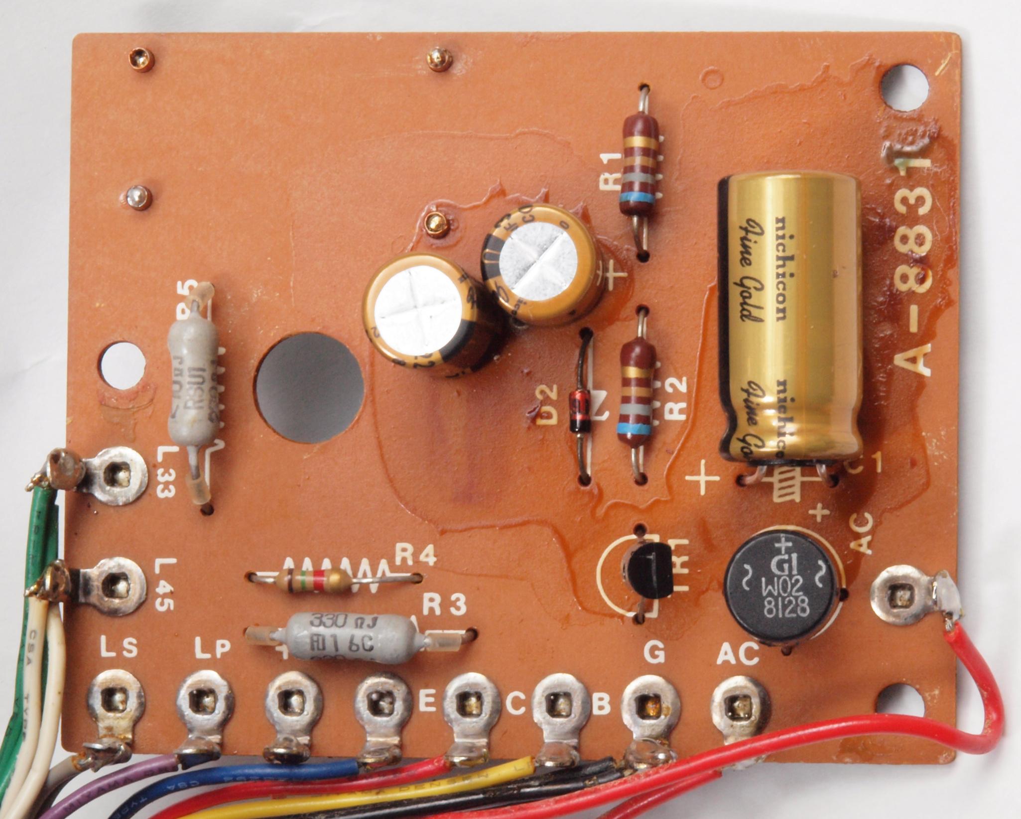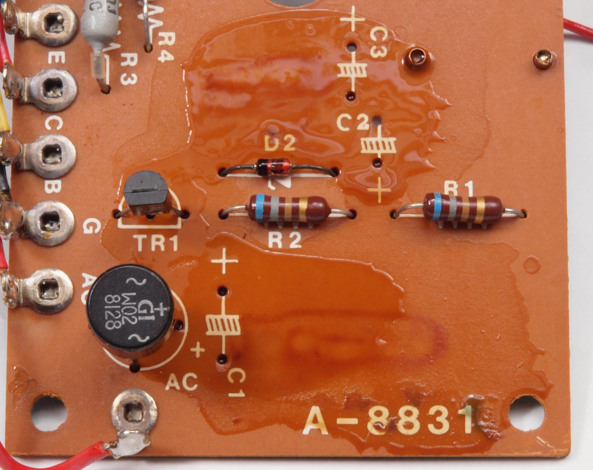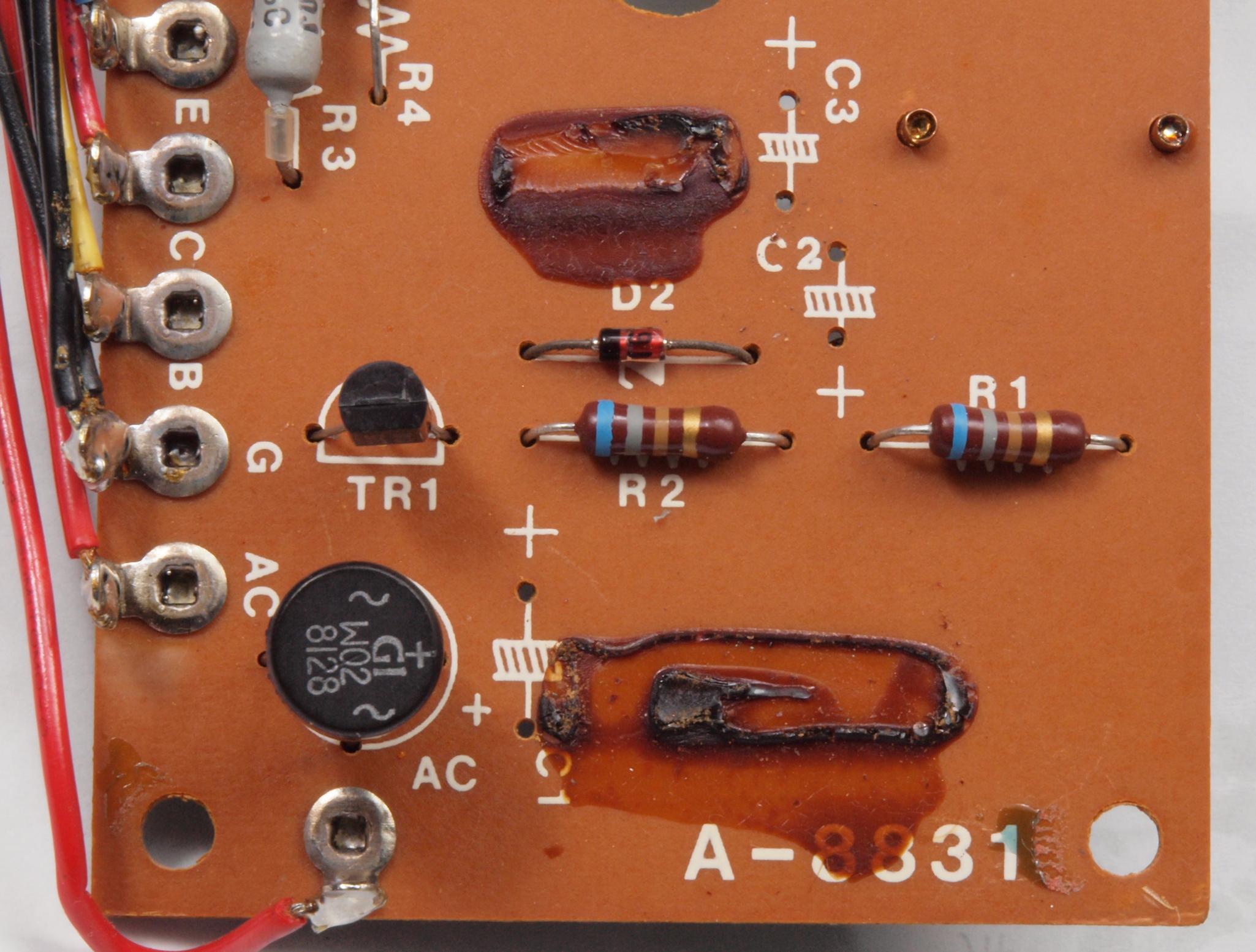 C12. 修理前 電源・LED表示基板。 電解コンデンサー固定するトルエン溶媒の接着剤。