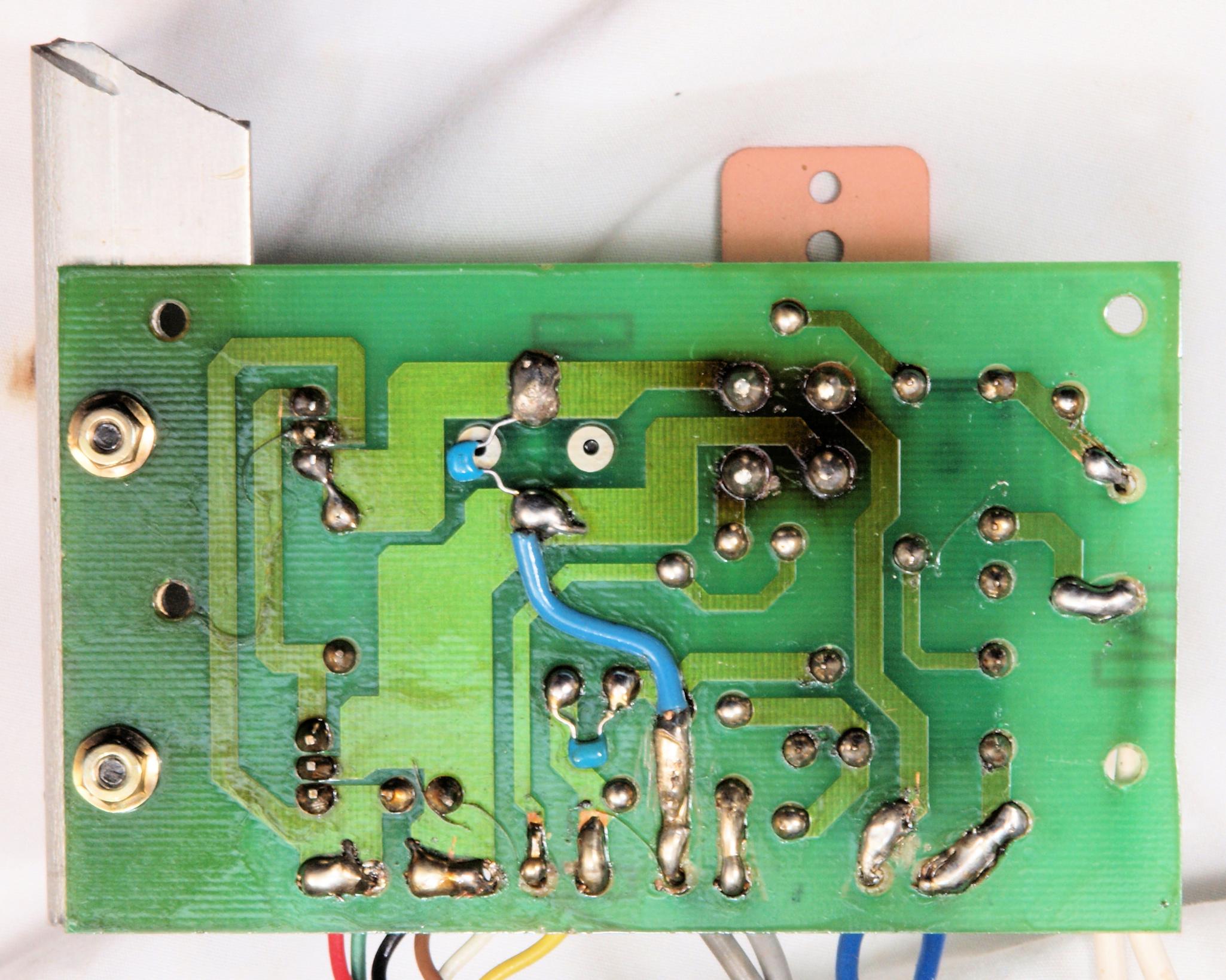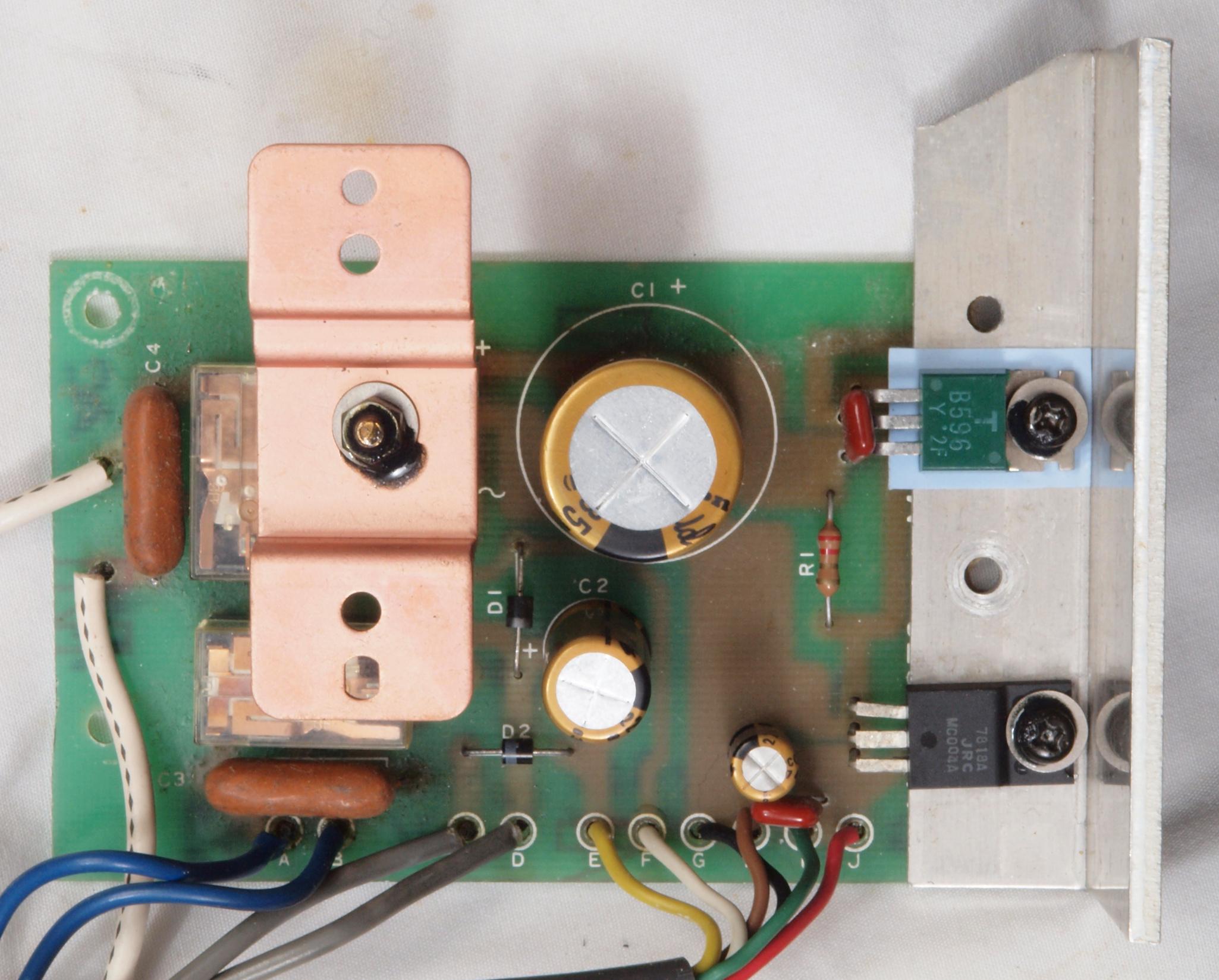 C12 .修理後 電源部整流基板。 電解コンデンサー3個、リレー2個、整流ブリッジダイオード1個、TR(トランジスター)1個交換。フイルムコンデンサー2個、整流ブリッジダイオードに放熱器追加。
