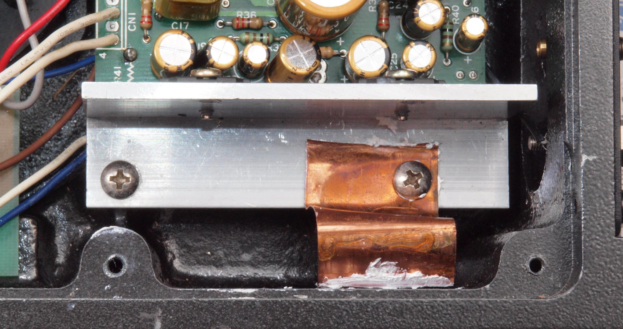 C92. 修理中 RY−5500U 下蓋を取り、下から見る。放熱器をケースに熱接触させる。