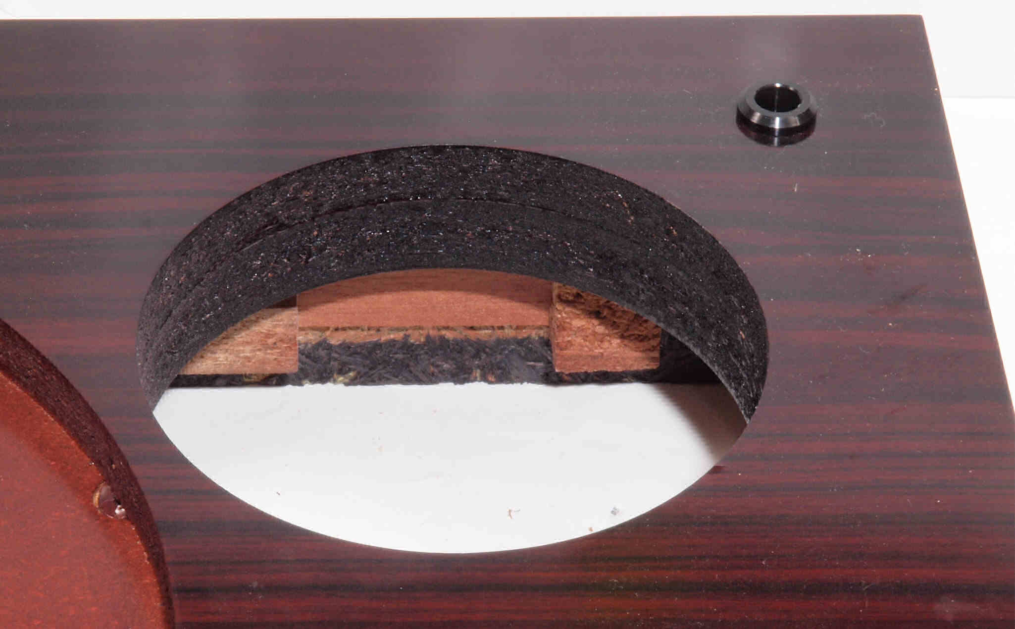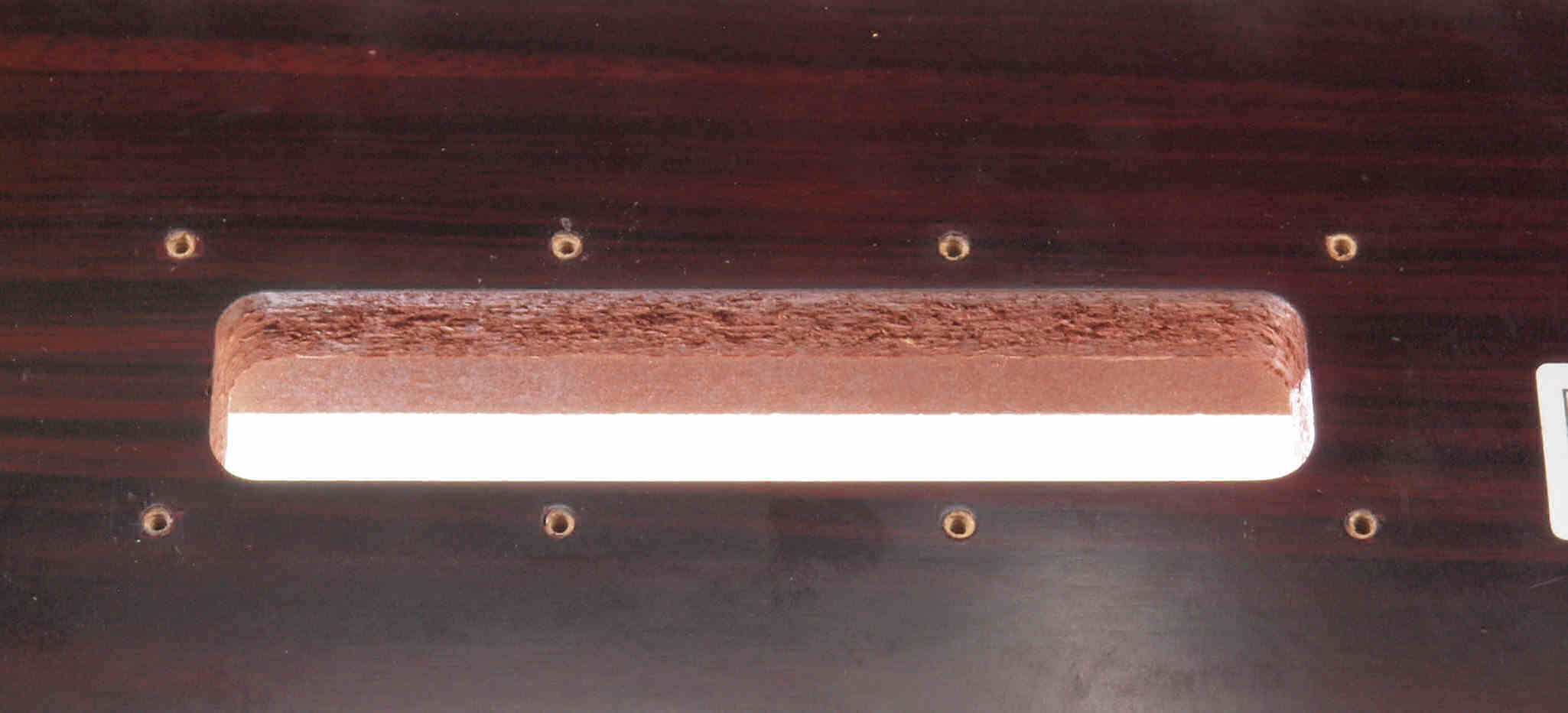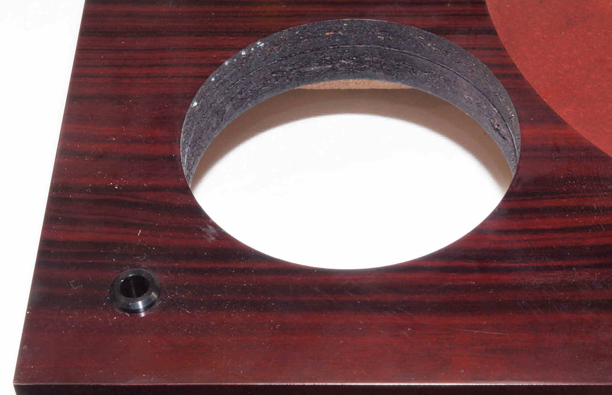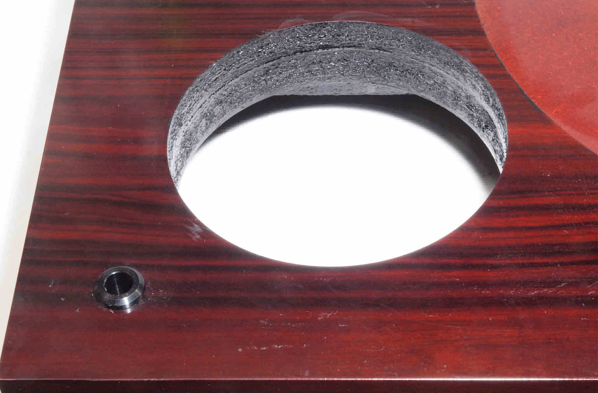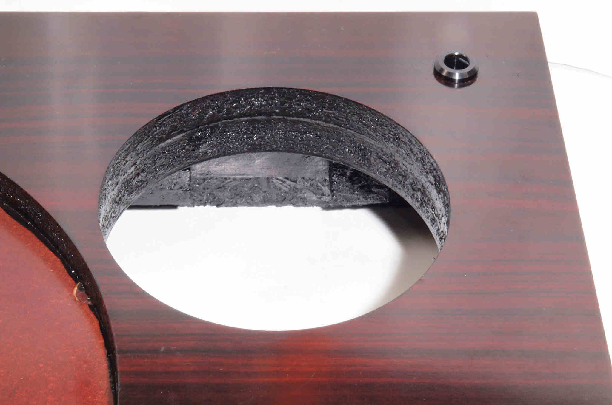 W18. 修理後 タンテーブル取り付け穴。 キズを消す為と割れを防ぐのに、塗装する。